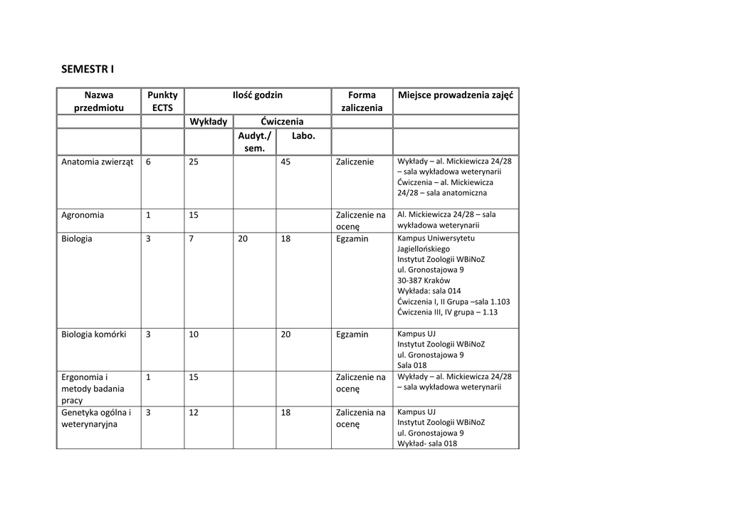 SEMESTR I Nazwa przedmiotu Punkty ECTS Ilość godzin Wykłady Anatomia zwierząt 6 25 Agronomia 1 15 Biologia 3 7 Biologia komórki 3 10 Ergonomia i metody badania pracy Genetyka ogólna i weterynaryjna 1 15 3 12 Forma zaliczenia Miejsce prowadzenia zajęć Ćwiczenia Audyt./ Labo. sem. 20 45 Zaliczenie Wykłady – al. Mickiewicza 24/28 – sala wykładowa weterynarii Ćwiczenia – al. Mickiewicza 24/28 – sala anatomiczna Al. Mickiewicza 24/28 – sala wykładowa weterynarii 18 Zaliczenie na ocenę Egzamin 20 Egzamin Kampus UJ Instytut Zoologii WBiNoZ ul. Gronostajowa 9 Sala 018 Wykłady – al. Mickiewicza 24/28 – sala wykładowa weterynarii Zaliczenie na ocenę 18 Zaliczenia na ocenę Kampus Uniwersytetu Jagiellońskiego Instytut Zoologii WBiNoZ ul. Gronostajowa 9 30-387 Kraków Wykłada: sala 014 Ćwiczenia I, II Grupa –sala 1.103 Ćwiczenia III, IV grupa – 1.13 Kampus UJ Instytut Zoologii WBiNoZ ul. Gronostajowa 9 Wykład- sala 018 Histologia i embriologia (embriologia) 1 15 Zaliczenie na ocenę Ćwiczenia - sale 055 i 056 Kampus UJ Instytut Zoologii WBiNoZ ul. Gronostajowa 9 Wykład- sala 018 Historia weterynarii i deontologia Język angielski 1 15 Zaliczenie na ocenę Wykład- al. Mickiewicza 24/28 – sala wykładowa weterynarii 1 30 Zaliczenie Łacina 2 30 Zaliczenie Ochrona środowiska Psychologia behawioralna Wychowanie fizyczne Kurs BHP Chemia 2 30 3 15 15 30 Zaliczenie na ocenę Zaliczenie na ocenę Zaliczenie Sale ćwiczeniowe ul. Św. Marka 37; nr 406 Sala ćwiczeniowa nr 405 ul. Marka 37, IV piętro Al. Mickiewicza 24/28 – sala wykładowa weterynarii 20 Zaliczenie Egzamin 1 4 15 10 Al. Mickiewicza 24/28 – sala wykładowa weterynarii Studium Wychowania Fizycznego UR al. 29- listopada Inspektorat BHP UJ Katedra Biochemii Lekarskiej CMUJ Ul. Kopernika 7 Kraków Wykłady – sala wykładowa Seminarium – sale 5,6,7,8 Ćwiczenia – sale 1,2,3,4