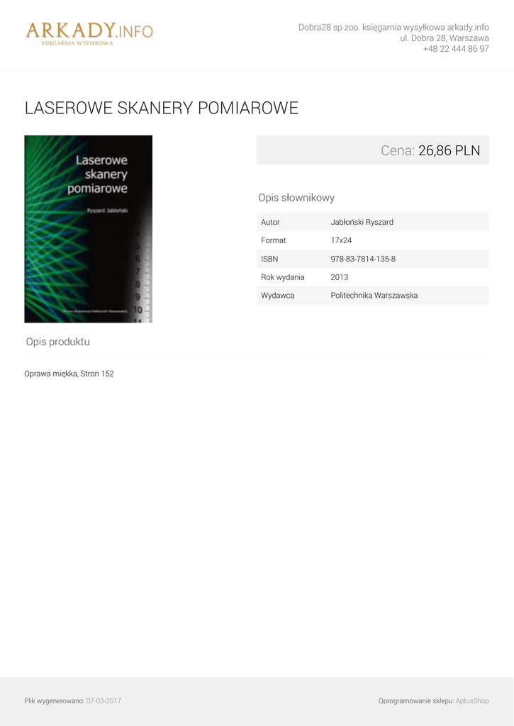 Dobra28 sp zoo. księgarnia wysyłkowa arkady.info ul. Dobra 28, Warszawa +48 22 444 86 97 LASEROWE SKANERY POMIAROWE Cena: 26,86 PLN Opis słownikowy Autor Jabłoński Ryszard Format 17x24 ISBN 978-83-7814-135-8 Rok wydania 2013 Wydawca Politechnika Warszawska Opis produktu Oprawa miękka, Stron 152 Plik wygenerowano: 07-03-2017 Powered by TCPDF (www.tcpdf.org) Oprogramowanie sklepu: AptusShop