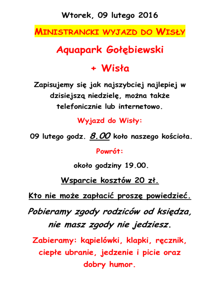 Wtorek, 09 lutego 2016 MINISTRANCKI WYJAZD DO WISŁY Aquapark Gołębiewski + Wisła Zapisujemy się jak najszybciej najlepiej w dzisiejszą niedzielę, można także telefonicznie lub internetowo. Wyjazd do Wisły: 09 lutego godz. 8.00 koło naszego kościoła. Powrót: około godziny 19.00. Wsparcie kosztów 20 zł. Kto nie może zapłacić proszę powiedzieć. Pobieramy zgody rodziców od księdza, nie masz zgody nie jedziesz. Zabieramy: kąpielówki, klapki, ręcznik, ciepłe ubranie, jedzenie i picie oraz dobry humor.