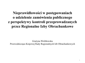 Nieprawidłowości w postępowaniach o udzielenie zamówienia publicznego z perspektywy kontroli przeprowadzanych przez Regionalne Izby Obrachunkowe Grażyna Wróblewska Przewodnicząca Krajowej Rady Regionalnych Izb Obrachunkowych 1 Regionalne Izby Obrachunkowe są państwowymi organami nadzoru i kontroli gospodarki finansowej podmiotów nad organami, o których mowa w art. 1 ust. 2 ustawy o rio 2 Zakres podmiotowy kontroli regionalnych izb obrachunkowych wyznacza treść art. 1 ust. 2 ustawy o rio, wg, którego izby kontrolują: 1) jednostek samorządu terytorialnego; 2) związków międzygminnych; 3) stowarzyszeń gmin oraz stowarzyszeń gmin i powiatów; 4) związków powiatów; 5) stowarzyszeń powiatów; 6) samorządowych jednostek organizacyjnych, w tym samorządowych osób prawnych; 7) innych podmiotów, w zakresie wykorzystywania przez nie dotacji przyznawanych z budżetów jednostek samorządu terytorialnego. 3 Zakres przedmiotowy kontroli (art. 5 ust. 1 ustawy o rio) Izby kontrolują gospodarkę finansową, w tym realizację zobowiązań podatkowych oraz zamówienia publiczne podmiotów, na podstawie kryterium zgodności z prawem i zgodności dokumentacji ze stanem faktycznym. 4 Kryteria kontroli: - kontrola w zakresie zadań własnych, - kontrola w zakresie zadań administracji rządowej. 5 Kontrola w zakresie zadań własnych: W przypadku zadań własnych jednostki RIO kontrolują gospodarkę finansową, w tym realizację zobowiązań podatkowych oraz zamówienia publiczne na podstawie kryterium zgodności z prawem i zgodności dokumentacji ze stanem faktycznym. 6 Kontrola w zakresie zadań administracji rządowej: Natomiast kontrola gospodarki finansowej jednostek samorządu terytorialnego w zakresie zadań administracji rządowej, wykonywanych przez te jednostki na podstawie umów lub zawieranych porozumień, dokonywana jest także z uwzględnieniem kryterium celowości, rzetelności i gospodarności, zatem przy wykonywaniu żądań zleconych jednostki samorządu terytorialnego są kontrolowane tak, jak administracja rządowa. 7 POSTĘPOWANIE KONTROLNE: Regionalne Izby Obrachunkowe przeprowadzają następujące rodzaje kontroli: 1) kompleksowe, obejmujące całość gospodarki finansowej jednostki samorządu terytorialnego; 2) problemowe, obejmujące wybrane zagadnienia w jednej lub kilku jednostkach kontrolowanych; 3) doraźne, podejmowane w razie potrzeby, 4) sprawdzające 8 Zakres kontroli kompleksowej został ustalony Uchwałą Nr 2/2011 Krajowej Rady Regionalnych Izb Obrachunkowych z dnia 17 marca 2011 r. w sprawie ramowego zakresu kontroli kompleksowej gospodarki finansowej jednostek samorządu terytorialnego 9 Zasady gospodarki finansowej określa przepis art. 44 ustawy o finansach publicznych Art. 44. 1. Wydatki publiczne mogą być ponoszone na cele i w wysokościach ustalonych w: 1) ustawie budżetowej; 2) uchwale budżetowej jednostki samorządu terytorialnego; 3) planie finansowym jednostki sektora finansów publicznych. 2. Jednostki sektora finansów publicznych dokonują wydatków zgodnie z przepisami dotyczącymi poszczególnych rodzajów wydatków. 3. Wydatki publiczne powinny być dokonywane: 1) w sposób celowy i oszczędny, z zachowaniem zasad: a) uzyskiwania najlepszych efektów z danych nakładów, b) optymalnego doboru metod i środków służących osiągnięciu założonych celów; 2) w sposób umożliwiający terminową realizację zadań; 3) w wysokości i terminach wynikających z wcześniej zaciągniętych zobowiązań. 4. Jednostki sektora finansów publicznych zawierają umowy, których przedmiotem są usługi, dostawy lub roboty budowlane, na zasadach określonych w przepisach o zamówieniach publicznych, o ile odrębne przepisy nie stanowią inaczej. 10 Ramowy zakres kontroli kompleksowej gospodarki finansowej jednostki samorządu terytorialnego obejmuje następujące zagadnienia: I. USTALENIA OGÓLNOORGANIZACYJNE II. KSIĘGOWOŚĆ I SPRAWOZDAWCZOŚĆ III. BUDŻET JEDNOSTKI SAMORZADU TERYTORIALNEGO IV. GOSPODARKA MIENIEM V. ROZLICZENIA JEDNOSTKI SAMORZĄDU TERYTORIALNEGO Z JEDNOSTKAMI ORGANIZACYJNYMI 11 Zakres kontroli koordynowanej jest ustalany przez Krajową Radę Regionalnych Izb Obrachunkowych. Kontrole te prowadzone są jako kontrole problemowe. 12 Z przeprowadzonej kontroli sporządza się protokół, który podpisują inspektorzy i kierownik kontrolowanej jednostki oraz skarbnik (główny księgowy) lub ich zastępcy. Ustawa przewiduje możliwość polemiki z ustaleniami zawartymi w protokole kontroli, ponieważ kierownik jednostki kontrolowanej lub jego zastępca może odmówić podpisania protokołu, składając w ciągu trzech dni od daty jego otrzymania pisemne wyjaśnienie co do przyczyn tej odmowy. Uprawianie takie przysługuje również skarbnikowi (głównemu księgowemu) lub je go zastępcy. Odmowę podpisania protokołu inspektor odnotowuje w protokole. Należy jednak pamiętać, że sama odmowa podpisania protokołu kontroli przez kierownika jednostki kontrolowanej nie stanowi przeszkody do podpisania protokołu przez inspektora i realizacji ustaleń kontroli. 13 Na podstawie wyników kontroli regionalna izba obrachunkowa kieruje do kontrolowanej jednostki wystąpienie pokontrolne, wskazując źródła i przyczyny nieprawidłowości, ich rozmiary, osoby odpowiedzialne oraz wnioski zmierzające do ich usunięcia i usprawnienia badanej działalności. Wystąpienie pokontrolne przekazuje się kontrolowanej jednostce nie później niż w terminie 60 dni od dnia podpisania protokołu kontroli. Do wystąpienia pokontrolnego właściwy organ jednostki kontrolowanej w terminie 14 dni od otrzymania wy stąpienia pokontrolnego za pośrednictwem prezesa RIO składa zastrzeżenia. Podstawą zgłoszenia zastrzeżenia może być tylko zarzut naruszenia prawa poprzez błędną jego wykładnię lub niewłaściwe zastosowanie. 14 Zgodnie z art. 25b ust. 1 RIOU zastrzeżenia do wniosków zawartych w wystąpieniach pokontrolnych rozpatruje k