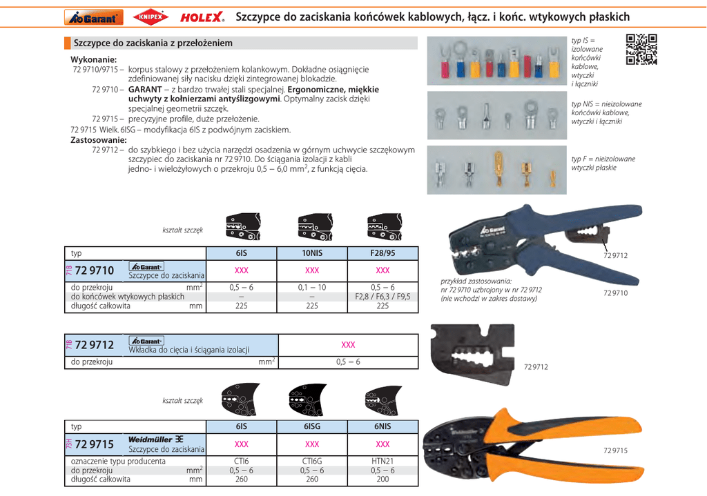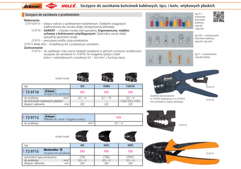 Szczypce do zaciskania końcówek kablowych, łącz. i końc. wtykowych płaskich typ IS = izolowane końcówki kablowe, wtyczki i łączniki Szczypce do zaciskania z przełożeniem Wykonanie: 72 9710/9715 – korpus stalowy z przełożeniem kolankowym. Dokładne osiągnięcie zdefiniowanej siły nacisku dzięki zintegrowanej blokadzie. 72 9710 – GARANT − z bardzo trwałej stali specjalnej. Ergonomiczne, miękkie uchwyty z kołnierzami antyślizgowymi. Optymalny zacisk dzięki specjalnej geometrii szczęk. 72 9715 – precyzyjne profile, duże przełożenie. 72 9715 Wielk. 6ISG – modyfikacja 6IS z podwójnym zaciskiem. Zastosowanie: 72 9712 – do szybkiego i bez użycia narzędzi osadzenia w górnym uchwycie szczękowym szczypiec do zaciskania nr 72 9710. Do ściągania izolacji z kabli jedno- i wielożyłowych o przekroju 0,5 − 6,0 mm2, z funkcją cięcia. typ NIS = nieizolowane końcówki kablowe, wtyczki i łączniki typ F = nieizolowane wtyczki płaskie kształt szczęk 71B typ 72 9710 71B Szczypce do zaciskania do przekroju mm2 do końcówek wtykowych płaskich długość całkowita mm 72 9712 6IS 10NIS F28/95 XXX XXX XXX 0,5 − 6 − 225 0,1 − 10 − 225 0,5 − 6 F2,8 / F6,3 / F9,5 225 przykład zastosowania: nr 72 9710 uzbrojony w nr 72 9712 (nie wchodzi w zakres dostawy) 72 9710 XXX Wkładka do cięcia i ściągania izolacji 0,5 − 6 mm2 do przekroju 72 9712 72 9712 kształt szczęk 73H typ 72 9715 Szczypce do zaciskania oznaczenie typu producenta mm2 do przekroju długość całkowita mm 6IS 6ISG 6NIS XXX XXX XXX CTI6 0,5 − 6 260 CTI6G 0,5 − 6 260 HTN21 0,5 − 6 200 72 9715 Szczypce do zaciskania końcówek kablowych, łączników i końcówek wtykowych płaskich ▶▶ kształt szczęk 6IS typ F48 F63 XXX XXX XXX XXX 0,5 − 6 − 220 0,5 − 10 − 220 0,1 − 2,5 F 4,8 220 0,5 − 6,0 F 6,3 220 6IS 10NIS F28/48 F48/63 XXX XXX XXX XXX 0,5 − 6 − 230 1,5 − 10 − 230 0,25 − 2,5 F2,8 / F4,8 230 0,5 − 6 F4,8 / F6,3 230 73F 72 9722 Szczypce do zaciskania do przekroju mm2 do końcówek wtykowych płaskich długość całkowita mm 10NIS kształt szczęk 72B typ 72 9720 Szczypce do zaciskania do przekroju mm2 do końcówek wtykowych płaskich długość całkowita mm 72 9722 F48/63 z uchwytem do wtyczek płaskich Szczypce do zaciskania bez przełożenia Wykonanie: Korpus szczypiec z płaskownika stalowego, ze szczękami dostosowanymi do różnych zacisków (zob. tabela). Obcinacz z gwintem do sworzni M2,6 − M5. Ściągacz do izolacji 0,75 − 6 mm2. Szczypce lakierowane na czarno, uchwyty z nasadkami z tworzywa sztucznego. Do ściągania izolacji, obcinania, zaciskania, itd., zwłaszcza w zakresie napraw. 72 9720 kształt szczęk 72B typ 72 9700 do przekroju Szczypce do zaciskania mm2 długość całkowita mm 6IS 6NIS 6F 6IS/F XXX XXX XXX XXX 1,5 − 6 1,5 − 6 1,5 − 2,5 220 220 230 1,5 − 6 (IS) 1,5 + 2,5 (F) 230 72 9700