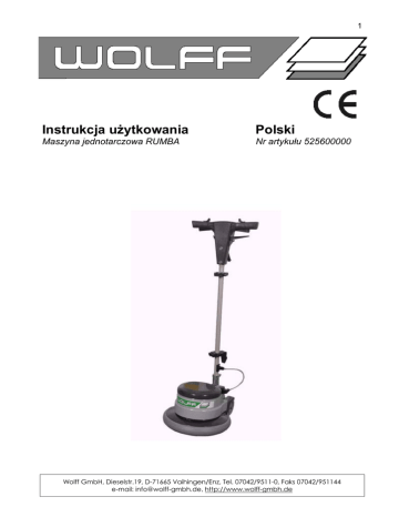 1 Instrukcja użytkowania Polski Maszyna jednotarczowa RUMBA Nr artykułu 525600000 Wolff GmbH, Dieselstr.19, D-71665 Vaihingen/Enz, Tel. 07042/9511-0, Faks 07042/951144 e-mail: [email protected], http://www.wolff-gmbh.de Strona 2 Nr art. K0000189 07/2002 Instrukcja użytkowania Polski Maszyna jednotarczowa RUMBA Nr artykułu 525600000 Przed uruchomieniem należy koniecznie zapoznać się z instrukcją, a następnie zachować ją. Spis treści 1.0 Dane techniczne Strona 3 2.0 Bezpieczeństwo Strona 3 3.0 Wskazówki dotyczące bezpieczeństwa Strona 3 4.0 Konserwacja i utrzymanie Strona 5 5.0 Zastosowanie Strona 5 6.0 Zastosowanie tarcz szlifierskich i czyszczących Strona 7 7.0 Usuwanie zakłóceń Strona 9 Strona 3 1.0 Dane techniczne Napięcie zasilania 230 V AC Pobór mocy 500 W Liczba obrotów 118 Obr/min. Poziom ciśnienia akustycznego 54 dB (A) Poziom hałasu podczas pracy 67 dB (A) Wibracje ręki / ramienia < 4,5/s2 Średnica szczotek i tarcz. 330 mm Waga 19 kg RUMBA, Instrukcja użytkowania, (bez tarcz polerujących Zakres dostawy: i zbiornika na płyn do czyszczenia) Elementy dodatkowego Szczotka czyszcząca miękka wyposażenia: (średnica 325 mm) Szczotka do polerowania twarda Tarcza polerująca do podkładek Podkładki polerujące Papier ścierny K 40 Papier ścierny K 60 525650000 525660000 525640000 525670000 525680000 525690000 2.0 Bezpieczeństwo Maszyna jednotarczowa do polerowania RUMBA została zbudowana według najnowszego stanu techniki oraz uznanych reguł technicznych. 3.0 Wskazówki dotyczące bezpieczeństwa W przypadku wszystkich prac wykonywanych przy urządzeniu należy najpierw wyciągnąć wtyczkę sieciową z gniazdka wtykowego. Należy używać jedynie czystych, niebudzących zastrzeżeń i przeznaczonych do danego rodzaju zastosowania tarcz polerujących oraz szczotek. Tarcze muszą posiadać równe powierzchnie. Należy stosować jedynie oryginalne tarcze oraz szczotki. Inne części zamienne mogą niekorzystnie wpłynąć na bezpieczeństwo pracy maszyny. Prace konserwacyjne może wykonywać tylko wykwalifikowany personel serwisowy. Należy stosować jedynie oryginalne części zamienne. Proszę zwrócić uwagę na zastosowanie odpowiednich środków czyszczących. Uwaga ! Przed uruchomieniem maszyny należy sprawdzić przewód sieciowy i wtyczkę. Oba elementy muszą być w stanie niebudzącym zastrzeżeń, izolacja nie może być uszkodzona. Uszkodzenia przewodu należy natychmiast usunąć, przed ponownym uruchomieniem urządzenia. W przeciwnym razie istnieje niebezpieczeństwo uszkodzenia ciała lub utraty życia użytkownika w wyniku porażenia prądem. 3.1 Wprowadzenie Niniejsza instrukcja użytkowania ma stanowić pomoc dla użytkownika podczas zapoznawania się z maszyną jednotarczową RUMBA oraz w celu jej optymalnego wykorzystania. Użytkownik znajdzie w niej pomocne informacje, dzięki którym będzie mógł w odpowiednim czasie rozpoznać niebezpieczeństwa i ich unikać. W ten sposób użytkownik przyczynia się nie tylko do zachowania własnego bezpieczeństwa, ale także minimalizuje koszty napraw oraz wydłuża okres użyteczności swojego urządzenia. Strona 4 3.2 Niebezpieczeństwa podczas kontaktu z urządzeniem Maszyna jednotarczowa RUMBA została zbudowana według najnowszego stanu techniki oraz uznanych reguł technicznych. Mimo to podczas użytkowania urządzenia mogą pojawić się zagrożenia uszkodzenia zdrowia lub utraty życia, jak również spowodowania strat materialnych. Maszyna może być wykorzystywana jedynie w następujący sposób: − w ramach wykorzystania zgodnego z przeznaczeniem, − w stanie technicznym niebudzącym zastrzeżeń. Zakłócenia, które mogą ujemnie wpływać na bezpieczeństwo, muszą zostać bezzwłocznie usunięte. 3.3 Użytkowanie zgodne z przeznaczeniem Maszyna jednotarczowa RUMBA jest przeznaczona wyłącznie do polerowania oraz czyszczenia na mokro twardych i dywanowych wykładzin podłogowych. Inne lub wykraczające poza określone w instrukcji użytkowanie traktowane jest jako niezgodne z przeznaczeniem. Za szkody powstałe z tego tytułu firma Wolff GmbH nie ponosi odpowiedzialności. Do użytkowania zgodnego z przeznaczeniem należy także: - przestrzeganie wszystkich wskazówek zawartych w instrukcji użytkowania, - przestrzeganie wykonywania inspekcji i prac konserwacyjnych. 3.4 Części oryginalne i bezpieczeństwo Oryginalne części oraz elementy wyposażenia dodatkowego zostały zaprojektowane specjalnie dla maszyny jednotarczowej RUMBA. Należy zwrócić szczególną uwagę na fakt, że nie jest dozwolone stosowanie innych części. W wyniku tego może nastąpić ograniczenie bezpieczeństwa pracy urządzenia. Zalecenie to obowiązuje szczególnie w przypadku tarcz polerujących oraz szczotek maszyny. Za szkody powstałe z powodu zastosowania nieoryginalnych części firma Wolff GmbH nie ponosi żadnej odpowiedzialności. 4.0 Konserwacja i utrzymanie Maszyna jednotarczowa RUMBA nie wymaga konserwacji. W okresie użytkowania maszyny wystarczy jedynie smarowanie łożyska. 5.0 Zastosowanie Uruchomienie Maszyna jednotarczowa RUMBA dostarczana jest w dwóch kartonach opakunkowych. Montaż uchwytu z ręcznym sterowaniem odbywa się za pomocą 4 śrub, tarcz zabezpieczających oraz nakrętek sześciokątnych, na powierzchni między kołami transportowymi. Następnie należy podłączyć sprzęgło dyszla do przewidzianej w tym celu wtyczki, która znajduje się pod kołpakiem ochronnym powyżej mocowania dyszla. Wskazówka: Wprowadzenie przewodu (5) musi zostać zamontowane z tylnej strony (w stronę osoby obsługującej). W przeciwnym razie maszyna nie będzie działać! Montaż tarcz polerujących oraz podkładek W celu montażu należy przewrócić maszynę i ułożyć na uchwycie ręcznym. W ten sposób uzyska się dostęp do napędu i tarcz polerujących. Tarcza ustawiana jest w środkowej części mechanizmu napędowego i mocowana poprzez dokręcanie w kierunku przeciwnym do ruc