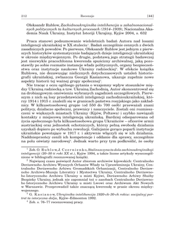 212 Recenzje [44] Ołeksandr Rublow, Zachidnoukrajinśka intelihencija u zahalnonacional nych politycznych ta kulturnych procesach (1914–1939), Nacionalna Akademia Nauk Ukrainy, Instytut Istoriji Ukrajiny, Kyjiw 2004, s. 632 Praca stanowi podsumowanie wieloletnich badań Autora nad losami inteligencji ukraińskiej w XX stuleciu. Badań szczególnie cennych z dwóch zasadniczych powodów. Po pierwsze, Ołeksandr Rublow jest jednym z pierwszych historyków systematycznie badających dzieje inteligencji ukraińskiej w okresie międzywojennym. Po drugie, podstawą jego strategii badawczej jest niezwykle pracochłonna kwerenda spuścizny archiwalnej, jaką pozostawiły po sobie rozmaite instancje władz politycznych, organy bezpieczeństwa oraz instytucje naukowe Ukrainy radzieckiej. W efekcie książka Rublowa, nie dezawuując nielicznych dotychczasowych ustaleń historiografii ukraińskiej, zwłaszcza Georgii Kasianowa, ukazuje zupełnie nowe aspekty historii tej ważnej grupy społecznej. Nie tracąc z oczu ogólnego pytania o wzajemny wpływ stosunków między Ukrainą radziecką a tzw. Ukrainą Zachodnią, Autor skoncentrował się na drobiazgowym omówieniu wybranych zagadnień szczegółowych. Pierwszym z nich są losy przedstawicieli inteligencji zachodnioukraińskiej, którzy 1914 i 1915 r. znaleźli się w granicach państwa rosyjskiego jako zakładnicy. W kilkusetosobowej grupie (od 550 do 700 osób) przeważali znani politycy, działacze społeczni, prawnicy i nauczyciele. Zostali oni rozmieszczeni w większych miastach Ukrainy (Kijów, Połtawa) i szybko nawiązali kontakty z miejscową inteligencją ukraińską. Bardziej odseparowana od życia społecznego była kilkusetosobowa grupa Ukraińców – oficerów armii austriackiej oraz jednostek ochotniczych, którzy pełną swobodę działania uzyskali dopiero po wybuchu rewolucji. Galicjanie gorąco poparli instytucje ukraińskie powstające w 1917 r. i aktywnie włączyli się w ich działania. Naddnieprzeńcy cenili ich kompetencje i oddanie dla sprawy, szczególnie na polu oświaty narodowej. Jednak warto przy tym podkreślić, że osoby Zob. O. R u b l o w, J. C z e r n i e n k o, Stalinszczyna ta dola zachinoukrajinśkoji inteligenciji (20–50 ti roki XX st.), Kyjiw 1994, a także liczne artykuły wyszczególnione w bibliografii recenzowanej książki. Najwięcej czasu poświęcił Autor zbiorom archiwów kijowskich: Centralnoho Derżawnoho Archiwu Wysszych Orhaniw Włady ta Uprawleninnja Ukrainy, Centralnoho Derżawnoho Arhiwu Gromadśkich Orhanizacji, Centralnoho Derżaw noho Archiwu-Muzeju Literatiry i Mystectwa Ukrainy, Centralnoho Derżawnoho Istorycznoho Archiwu Ukrainy u misti Kyjiwi, Derżawnoho Arhiwy Służby Bezpieky Ukrainy, jednak nie zapomniał też o zasobach Centralnoho Derżawnoho Istorycznoho Archiwu Ukrainy u misti Lwowi oraz Archiwum Akt Nowych w Warszawie. Przeprowadził także znaczącą kwerendę w prasie okresu między wojennego. G. K a s i a n o w, Ukrajinśka intelihencija 1920-ch-30-ch rokiw: socijalnyj portret ta istoryczna dolja, Kyjiw–Edmonton 1992. Zob. s. 76–77 recenzowanej pracy. [45] Recenzje 213 pochodzące z Galicji nie zajęły żadnego z najwyższych stanowisk w ukraińskich strukturach władzy. Wydarzenia wojny i rewolucji miały też jeszcze jedną ważną konsekwencję – upowszechniły w szerokiej świadomości społecznej mieszkańców Wielkiej Ukrainy przekonanie, że terytorium Galicji Wschodniej czy Bukowiny to obszary niezwykle istotne z punktu ogólnoukraińskich interesów narodowych. Jak podsumował to Łonhyn Cehielśkyj, „Kijów i Ukraina po raz pierwszy uświadomiły sobie, że Galicja dla Ukrainy to nie tylko jakiś tam obszar pograniczny, ale kuźnia myśli ukraińskiej, kulturowy most do Zachodu, laboratorium świadomego ukraiństwa i idei jedności ukraińskiej”. Po zakończeniu rewolucji i wojny domowej na Ukrainie radzieckiej pozostało kilka tysięcy Ukraińców pochodzących z Galicji. Przeważały wśród nich osoby niezaangażowane politycznie, które dostrzegły dla siebie szansę na karierę zawodową lub zbudowały satysfakcjonujące życie osobiste. Drugą grupę tworzyli ci, którzy nie mogli lub nie chcieli wrócić do Galicji z przyczyn politycznych, na przykład żołnierze Ukraińskiej Halickiej Czerwonej Armii. Wielu było też takich, dla których pozostanie było decyzją ideową. Wśród ideowców było trochę zaprzysięgłych bolszewików, jednak dominowali przekonani, że niezależnie od zwycięstwa bolszewików Ukraina radziecka daje szansę na realizację ukraińskiego programu narodowego. Potwierdzeniem słuszności takiego rozumowania mogła być pozycja w życiu naukowym USRR Mychajło Hruszewskiego (który po wyborze w 1924 r. na członka Ukraińskiej Akademii Nauk zdecydował się opuścić Pragę i zamieszkać w Kijowie), kulturalnym – Mykoły Chwylowego czy też szybki rozwój życia naukowego, kultury i szkolnictwa ukraińskiego wszystkich szczebli. Analizując losy kilkudziesięciu pracowników nauki i kultury, Autor wykazuje, że mieli oni możliwość nie tylko kariery indywidualnej, lecz także realizacji wielu ciekawych programów naukowych czy projektów organizacyjnych. Co więcej, Autor stwierdza, że od 1923 r. dało się zaobserwować zjawisko zwiększonego napływu „zagranicznej inteligencji na terytorium USRR. Poza urodzonymi na Naddnieprzu (reemigrantów) sporo było Galicjan, przeważnie młodzieży, która miała w pamięci doświadczenia wojny światowej oraz ukraińskiej walki niepodległościowej i która zdobyła wyższe wykształcenie w Niemczech, Austrii, Czechosłowacji lub w ukraińskich szkołach wyższych we Lwowie”. Stosunek władz do przybyszów był niejednoznaczny. Z jednej strony ich przybycie było zjawiskiem pozytywnie odbieranym. Dawało świadectwo sukcesu politycznego, zwiększało potencjał intelektualny kraju oraz pozwalało wzmacniać konsekwentną do 1928 r. politykę derusyfikacj