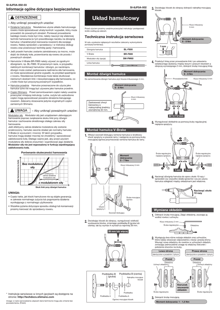 SI-8JF0A-002-03 SI-8JF0A-002 Informacje ogólne dotyczące bezpieczeństwa klocek do obręczy dokręcić nakrętkę mocującą 3. Dociskając klocek. Układ hamulcowy OSTRZEŻENIE – Aby uniknąć poważnych urazów: • Działanie hamulców Niewłaściwe użycie układu hamulcowego roweru może spowodować utratę kontroli i wypadek, który może prowadzić do poważnych obrażeń. Ponieważ prowadzenie każdego roweru może być inne, należy nauczyć się właściwej techniki hamowania (w tym prawidłowego nacisku na dźwignię hamulca i charakterystyk kierowania rowerem) dla swojego roweru. Należy sprawdzić u sprzedawcy i w instrukcji obsługi roweru oraz przećwiczyć technikę jazdy i hamowania. • Jeśli przedni hamulec zostanie zainstalowany za mocno, może dojść do blokady koła, przewrócenia się roweru do przodu i poważnych obrażeń. • Hamulców V-Brake BR-F800 należy używać ze zgodnymi dźwigniami, np. BL-F800. W przeciwnym razie, w przypadku niektórych kombinacji hamulców i dźwigni, po naciśnięciu dźwigni może zostać zastosowana nadmierna siła hamowania, co może spowodować groźne wypadki, na przykład spadnięcie z roweru. Niewłaściwa kombinacja może także skutkować nierównym skokiem linki i niewystarczającą siłą hamowania, co z kolei może być przyczyną poważnych wypadków. Techniczna instrukcja serwisowa W celu uzyskania najlepszych rezultatów zalecamy wykorzystanie poniższej kombinacji. UWAGA – Aby uniknąć poważnych urazów: Modulator siły Modulator siły jest urządzeniem ułatwiającym hamowanie poprzez zwiększenie skoku linki przy dźwigni hamulca i zachowanie określonego stałego zakresu siły hamowania. Jeśli efektywny zakres działania modulatora siły zostanie przekroczony, hamulec zacznie działać jak normalny hamulec V-Brake (z wyczuciem i mocno). W takim przypadku, hamulce mogą działać mocniej niż chcieliśmy i spowodować zablokowanie koła. Dlatego ważne jest, aby przed użyciem modulatora siły dobrze zrozumieć i wypróbować jego działanie. Modulator siły nie jest wyposażony w funkcję zapobiegającą zablokowaniu koła. 1 mm BR-F800 V-Brake SM-PM60 Modulator siły (opcja) linkę przez prowadzenie linki i po ustawieniu 4. Przełożyć ostatecznego dystansu między lewym i prawym klockiem a Linka hamulca obręczą wynoszącego 2 mm, dokręcić śrubę mocującą linkę. Moment dokręcania: 6 - 8 Nm Montaż dźwigni hamulca Prowadzenie linki Do zamontowania dźwigni hamulca użyć klucza imbusowego 4 mm. Klucz imbusowy 5 mm Moment dokręcania: 6 - 8 Nm Klucz imbusowy 4 mm Zastosować chwyt kierownicy o maksymalnej średnicy zewnętrznej 32 mm. B C B + C = 2 mm dokładnie za pomocą śruby regulacyjnej 5. Wyregulować napięcia sprężyny. Montaż hamulca V-Brake sworzeń blokujący ramiona hamulca w środkowy 1. Włożyć otwór sprężyny w piwocie ramy i następnie za pomocą śruby 2 mocującej ogniwa przymocować ramiona hamulca do ramy. Porównanie skuteczności hamowania Siła hamowania na kole Moment dokręcania: 6 - 8 Nm BL-F800 Dźwignia hamulca • Hamulce przednie Hamulce przeznaczone do użycia jako hamulce tylne nie mogą być używane jako hamulce przednie. • Części Shimano Przed zamontowaniem części należy uważnie przeczytać niniejszą instrukcję. Luźne, zużyte lub uszkodzone części mogą spowodować poważne obrażenia kierującego rowerem. Zalecamy stosowanie jedynie oryginalnych części zamiennych Shimano. Klucz imbusowy 5 mm Przed użyciem prosimy uważnie przeczytać instrukcję i postępować ściśle według jej zaleceń. Moment dokręcania: 5 - 7 Nm Bez modulatora siły 1 Śruba regulacyjna napięcia sprężyny Śruba regulacyjna napięcia sprężyny Klucz imbusowy 5 mm 2 Efektywny zakres działania modulatora siły 1 1 mm 1 mm 1 2 dźwignię hamulca do oporu około 10 razy i 6. Nacisnąć sprawdzić czy wszystko działa sprawnie i czy po użyciu hamulca odległość między okładzinami jest właściwa. z modulatorem siły Skok linki przy dźwigni hamulca Nacisnąć około 10 razy UWAGA: • Części takie, jak klocki hamulcowe nie są objęte gwarancją w zakresie normalnego zużycia lub pogorszenia działania wynikającego z normalnego użytkowania • Wszelkie pytania dotyczące sposobu obsługi lub konserwacji prosimy kierować do sprzedawcy roweru. Śruba mocująca ogniwo Otwór sprężyny Wymiana okładzin Sworzeń blokujący śrubę mocującą. Zdjąć okładzinę, zsuwając ją 1. Odkręcić wzdłuż rowka z uchwytu. klocek do obręczy, wyregulować wielkość 2. Dociskając wystawania klocka, zmieniając podkładkę B (gruba lub cienka), tak by wymiar A wynosił co najmniej 39 mm. Klucz imbusowy 2 mm Śruba regulacyjna Okładzina 39 mm lub więcej dwa różne rodzaje okładzin oraz uchwytów, 2. Występują które należy stosować odpowiednio z lewej i prawej strony. A Wsunąć nowe okładziny do rowków w uchwytach okładzin, zwracając jednocześnie uwagę na właściwy kierunek i położenie otworów na śruby. Lewa strona Prawa strona Identycznie w przednim i tylnym Identycznie w przednim i tylnym Przód Przód Okładzina Uchwyt okładziny Okładzina Uchwyt okładziny Podkładka B (gruba) * Instrukcje serwisowe w innych językach są dostępne na stronie: http://techdocs.shimano.com Uwaga: w razie wprowadzenia ulepszeń dane techniczne mogą ulec zmianie bez powiadomienia. (Polish) Podkładka B (cienka) Nakrętka mocująca klocek Podkładka Podkładka A Podkładka A Ogniwo mocujące klocek Śruba regulacyjna Kierunek wsuwania okładzin 3. Dokręcić śrubę mocującą. Moment dokręcania: 1 - 1,5 Nm Śruba regulacyjna