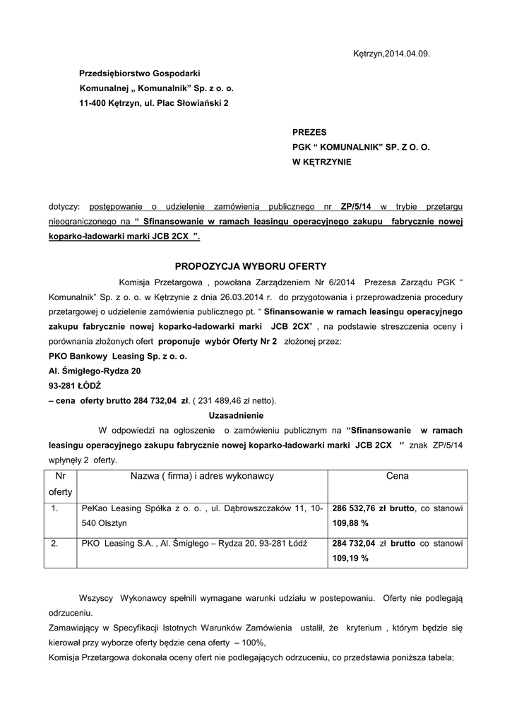 Kętrzyn,2014.04.09. Przedsiębiorstwo Gospodarki Komunalnej „ Komunalnik” Sp. z o. o. 11-400 Kętrzyn, ul. Plac Słowiański 2 PREZES PGK “ KOMUNALNIK” SP. Z O. O. W KĘTRZYNIE dotyczy: postępowanie o udzielenie zamówienia publicznego nr ZP/5/14 w nieograniczonego na “ Sfinansowanie w ramach leasingu operacyjnego zakupu trybie przetargu fabrycznie nowej koparko-ładowarki marki JCB 2CX ”. PROPOZYCJA WYBORU OFERTY Komisja Przetargowa , powołana Zarządzeniem Nr 6/2014 Prezesa Zarządu PGK “ Komunalnik” Sp. z o. o. w Kętrzynie z dnia 26.03.2014 r. do przygotowania i przeprowadzenia procedury przetargowej o udzielenie zamówienia publicznego pt. “ Sfinansowanie w ramach leasingu operacyjnego zakupu fabrycznie nowej koparko-ładowarki marki JCB 2CX” , na podstawie streszczenia oceny i porównania złożonych ofert proponuje wybór Oferty Nr 2 złożonej przez: PKO Bankowy Leasing Sp. z o. o. Al. Śmigłego-Rydza 20 93-281 ŁÓDŹ – cena oferty brutto 284 732,04 zł. ( 231 489,46 zł netto). Uzasadnienie W odpowiedzi na ogłoszenie o zamówieniu publicznym na “Sfinansowanie w ramach leasingu operacyjnego zakupu fabrycznie nowej koparko-ładowarki marki JCB 2CX ‘’ znak ZP/5/14 wpłynęły 2 oferty. Nr Nazwa ( firma) i adres wykonawcy Cena PeKao Leasing Spółka z o. o. , ul. Dąbrowszczaków 11, 10- 286 532,76 zł brutto, co stanowi 540 Olsztyn 109,88 % PKO Leasing S.A. , Al. Śmigłego – Rydza 20, 93-281 Łódź 284 732,04 zł brutto co stanowi oferty 1. 2. 109,19 % Wszyscy Wykonawcy spełnili wymagane warunki udziału w postepowaniu. Oferty nie podlegają odrzuceniu. Zamawiający w Specyfikacji Istotnych Warunków Zamówienia ustalił, że kryterium , którym będzie się kierował przy wyborze oferty będzie cena oferty – 100%, Komisja Przetargowa dokonała oceny ofert nie podlegających odrzuceniu, co przedstawia poniższa tabela; Nr Nazwa ( firma) i adres wykonawcy oferty 1 2 Liczba punktów w kryterium cena 100 pkt PeKao Leasing Spółka z o. o. , ul. Dąbrowszczaków 11, 10- 284 732,04 540 Olsztyn 286 532,76 x 100 = 99,37 pkt PKO Leasing Sp. z o. o.. , Al. Śmigłego – Rydza 20, 93-281 284 732,04 Łódź 284 532,04 x 100 = 100,00 pkt Mając na względzie powyższe najkorzystniejszą ofertę złożył Wykonawca PKO Leasing Sp. z o. Al. Śmigłego – Rydza 20, 93-281 Łódź . Komisja Przetargowa proponuje wybór wyżej wskazanej oferty do realizacji zadania „Sfinansowanie w ramach leasingu operacyjnego zakupu fabrycznie nowej koparko-ładowarki marki JCB 2CX ” ZATWIERDZIŁ Przewodnicząca PREZES ZARZĄDU Komisji Przetargowej ROMAN ŚWITAJ Zofia Zawistowska