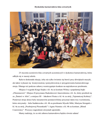 Dyskoteka karnawałowa klas czwartych 25 stycznia uczniowie klas czwartych uczestniczyli w dyskotece karnawałowej, która odbyła się w naszej szkole. Była to doskonała okazja, żeby nie tylko świetnie się bawić przy dźwiękach muzyki, ale także wykazać się kreatywnością i pomysłowością w przygotowaniu karnawałowego stroju. Dlatego też podczas zabawy rozstrzygnięto konkurs na najciekawsze przebranie. Miejsce I wygrała Kinga Siejko z kl. 4a za kostium Wilmy z popularnej bajki „Flinstonowie”. Miejsce II przyznano Radosławowi Janowskiemu z kl. 4c, który przebrał się za „Śmierć w Afro”, a miejsce III – Jakubowi Pestce z kl. 4c za strój „Tajemniczej Kobiety”. Ponieważ stroje dzieci były niesamowite postanowiliśmy przyznać także trzy wyróżnienia, które otrzymały: Julia Sudakowska z kl. 4b za przebranie Myszki Miki, Martyna Strzępek z kl. 4a za strój „Przebojowej Piosenkarki” i Agata Niemiec z kl. 4b za kostium „Blond Czarownicy”. Wszyscy nagrodzeni otrzymali upominki. Mamy nadzieję, że za rok zabawa karnawałowa będzie równie udana!