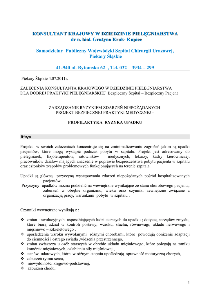 KONSULTANT KRAJOWY W DZIEDZINIE PIELĘGNIARSTWA dr n. biol. Grażyna Kruk- Kupiec Samodzielny Publiczny Wojewódzki Szpital Chirurgii Urazowej, Piekary Śląskie 41-940 ul. Bytomska 62 , Tel. 032 3934 – 299 Piekary Śląskie 4.07.2011r. ZALECENIA KONSULTANTA KRAJOWEGO W DZIEDZINIE PIELĘGNIARSTWA DLA DOBREJ PRAKTYKI PIELĘGNIARSKIEJ Bezpieczny Szpital – Bezpieczny Pacjent ZARZĄDZANIE RYZYKIEM ZDARZEŃ NIEPOŻĄDANYCH PROJEKT BEZPIECZNEJ PRAKTYKI MEDYCZNEJ – PROFILAKTYKA RYZYKA UPADKU Wstęp Projekt w swoich założeniach koncentruje się na zminimalizowaniu zagrożeń jakim są upadki pacjentów, które mogą wystąpić podczas pobytu w szpitalu. Projekt jest adresowany do pielęgniarek, fizjoterapeutów, ratowników medycznych, lekarzy, kadry kierowniczej, pracowników działów mających znaczenie w poprawie bezpieczeństwa pobytu pacjenta w szpitalu oraz członków zespołów problemowych funkcjonujących na terenie szpitala. Upadki są główną przyczyną występowania zdarzeń niepożądanych pośród hospitalizowanych pacjentów. Przyczyny upadków można podzielić na wewnętrzne wynikające ze stanu chorobowego pacjenta, zaburzeń w obrębie organizmu, wieku oraz czynniki zewnętrzne związane z organizacją pracy, warunkami pobytu w szpitalu . Czynniki wewnętrzne wynikają z : zmian inwolucyjnych usposabiających ludzi starszych do upadku ; dotyczą narządów zmysłu, które biorą udział w kontroli postawy; wzroku, słuchu, równowagi, układu nerwowego i mięśniowo – szkieletowego , upośledzenia wzroku wywołanymi różnymi chorobami, które powodują obniżenie adaptacji do ciemności i ostrego światła ,widzenia przestrzennego, zmian zwłaszcza u osób starszych w obrębie układu mięśniowego, które polegają na zaniku komórek mięśniowych, osłabieniu siły mięśniowej , stanów udarowych, które w różnym stopniu upośledzają sprawność motoryczną chorych, zaburzeń rytmu serca, niewydolności kręgowo-podstawnej, zaburzeń chodu, 1 założonych opatrunków gipsowych , upadków w przeszłości które predysponują do ryzyka upadku , każdej choroby infekcyjnej np. zapalenia dróg moczowych, nietrzymania moczu, które pogarszają stan ogólny i sprawność pacjenta. Czynniki zewnętrze środowiskowe predysponujące do wystąpienia upadków, związane są z otoczeniem w którym przebywa pacjent. Na upadki może mieć wpływ brak poręczy, uchwytów, nierówna podłoga, ślizga podłoga w łazience oddziału, oświetlenie, brak balkoników oraz wiele innych . Zagrożenia które wpływają na upadki pacjentów mogą mieć także charakter organizacyjny . Cele projektu: 1. Zwiększenie bezpieczeństwa pacjentów poprzez eliminację czynników zagrożenia dla zdrowia lub życia chorego, określenie przyczyn i wprowadzenie działań naprawczych w zakresie zarządzania ryzykiem upadków . 2. Zwiększenie odpowiedzialności pracowników medycznych za zachowanie bezpiecznych warunków pobytu pacjentów w szpitalu . 3. Szkolenia pracowników w zakresie zapobiegania upadkom pacjentów, rozpoznawania sytuacji krytycznych . 4. Edukacja pacjentów i rodzin , opracowanie poradników. 5. Opracowanie skali oceny ryzyka upadku . 6. Opracowanie systemu prowadzenia dokumentacji pielęgniarskiej w zakresie wywiadu , oceny ryzyka upadku , planowania opieki . 7. Poprawa jakości życia pacjentów . 8. Monitorowanie zdarzeń niepożądanych - upadków pacjentów . 9. Wdrażanie rozwiązań w zakresie usprzętowienia, eliminacji barier technicznych i organizacyjnych . Oczekiwany rezultat wdrożenia projektu : 1. Zmniejszenie liczby występowania zdarzeń niepożądanych – upadków pacjentów. 2. Zwiększenie świadomości pracowników medycznych w zakresie rozpoznawania i eliminacji czynników zewnętrznych, organizacyjnych, technicznych w środowisku szpitalnym, mogących wpływać na występowanie upadków . 3. Zwiększenie świadomości pacjentów oraz ich rodzin w zakresie czynników wpływających na występowanie upadków . 4. Poprawa bezpieczeństwa pobytu pacjenta w szpitalu. 5. Poprawa jakości opieki, zwiększenie odpowiedzialności za zachowanie bezpiecznych warunków pobytu pacjentów. 6. Otrzymanie informacji na temat przyczyn występowania zdarzeń niepożądanych. 7. Wprowadzenie nowych rozwiązań technicznych i organizacyjnych. 2 ZALECENIA Zalecenie I . W sprawie organizacji dobrej praktyki pielęgniarskiej w przedmiocie zarządzania ryzykiem zdarzeń niepożądanych . 1.Na poziomie podmiotu leczniczego (Ustawa z dnia 15 kwietnia 2011r.o działalności leczniczej. Dz. U. z dnia 1 czerwca 2011r.) jest powołany zespół ds. zdarzeń niepożądanych który analizuje występujące zdarzenia w tym upadki. Zadania zespołu : identyfikacja zdarzeń niepożądanych na podstawie kart zgłoszeń, gromadzenie i poddawanie analizie danych dotyczących zdarzeń niepożądanych , mapowanie danych i informacji , ustalanie przyczyn źródłowych zdarzenia, podjęcie działań wyjaśniających, wydanie zaleceń i wyciągnięcie wniosków , przekazanie informacji pracownikom , opracowywanie rocznych raportów . Zalecenie II W sprawie rejestru pacjentów u których wystąpiło zdarzenie niepożądane w tym upadek pacjenta. 1. Personel medyczny zgłasza wystąpienie zdarzenia niepożądanego ( zdarzenia dzielimy na rzeczywiste i potencjalne / niedoszłe ). 2. Zespół ds. analiz zdarzeń niepożądanych dokonuje analizy zgłoszonego przypadku . 3. Określenie kolejności zdarzeń. 4. Zidentyfikowanie przyczyn źródłowych. 5. Przygotowanie planu działań . 6. Sporządzenie raportu i przekazanie personelowi oddziału. Zalecenie III W sprawie oceny zagrożenia ryzyka upadku . 1. Każdy nowo przyjęty pacjent w okresie pierwszych godzin swojego pobytu w oddziale, podczas zebrania wywiadu pielęgniarskiego, zostaje oceniony pod kątem zagrożenia upadkiem przy użyciu skali mającej zastosowanie w ocenie stopnia zagrożenia. 2. Ocena jest powtarzana wg. przyjętego schematu 