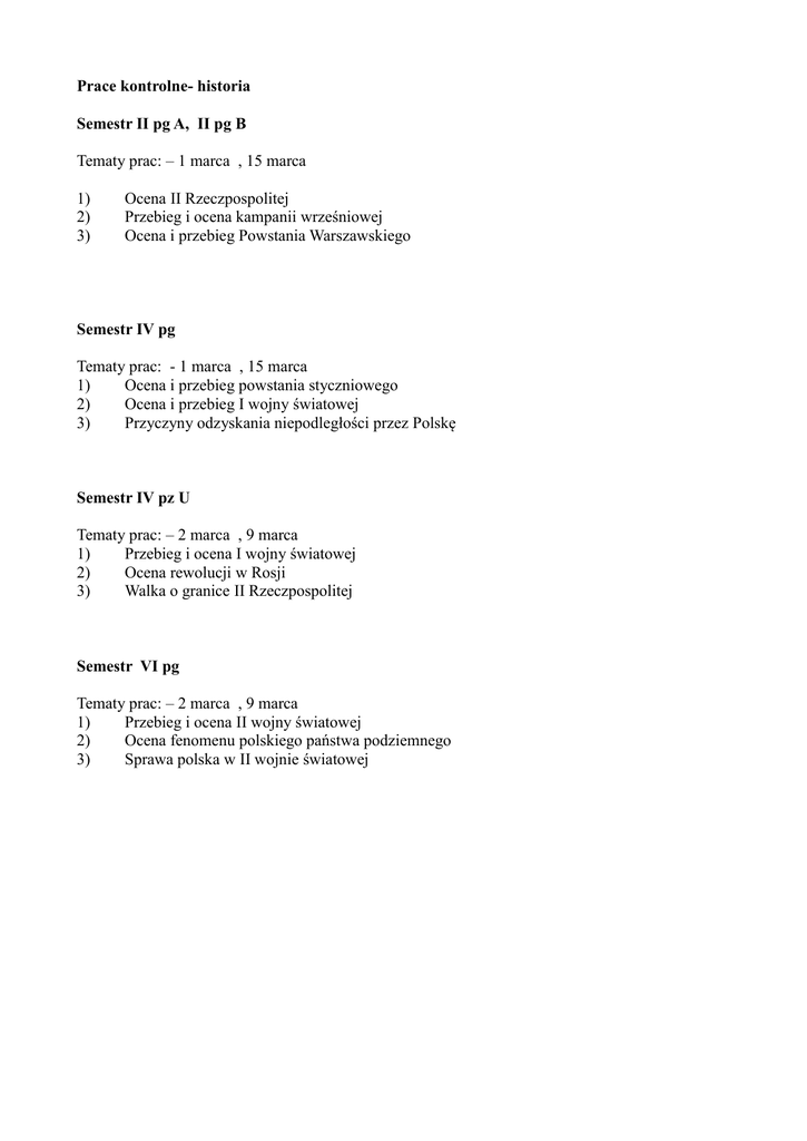 Prace kontrolne- historia Semestr II pg A, II pg B Tematy prac: – 1