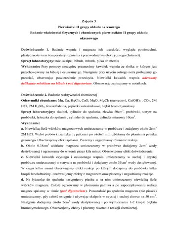 Zajęcia 3 Pierwiastki II grupy układu okresowego Badanie właściwości fizycznych i chemicznych pierwiastków II grupy układu okresowego Doświadczenie 1. Badanie wapnia i magnezu ich twardości, wyglądu powierzchni, plastyczności oraz temperatury topnienia i przewodnictwa elektrycznego (Internet). Sprzęt laboratoryjny: nóż, skalpel, bibuła, młotek, piłka do metalu Wykonanie: Przy pomocy szczypiec przenosimy kawałek wapnia ze słoika w którym jest przechowywany na bibułę i osuszamy go. Następnie przy użyciu ostrego noża próbujemy go przeciąć, obserwując powierzchnię przecięcia. Niewielki kawałek wapnia uderzamy delikatnie młotkiem na bibule i pod digestorium. Obserwacje zapisujemy w notatkach. Doświadczenie 2. Badanie reaktywności chemicznej Odczynniki chemiczne: Mg, Ca, HgCl2, CaO, MgO, MgCl2 (nasycony), Ca(OH)2 , CO2, 2M HCl, 2M H2SO4, fenoloftaleina, papierki wskaźnikowe, błękit bromotymolowy Sprzęt laboratoryjny: skalpel, cylinder do spalania, zlewka 50cm3, probówki, statyw na probówki, łyżeczka do spalania , cylinder do spalania, cylinder miarowy 10cm3. Wykonanie: a. Niewielką ilość wiórków magnezowych umieszczamy w probówce i zadajemy około 2cm3 2M HCl. Wylot probówki zamykamy palcem i po około1 min. zbliżamy do płomienia palnika gazowego. Obserwujemy efekt spalania. Piszemy i uzgadniamy równanie reakcji. b. Około 0.35cm3 wiórków magnezu umieszczamy w probówce dodajemy 2cm3 wody destylowanej i ogrzewamy do wrzenia przez kila minut. Obserwujemy efekt doświadczenia. c. Niewielki kawałek czystego i osuszonego wapnia umieszczamy w suchej i czystej probówce umieszczonej w statywie na probówki i dodajemy około 35cm3 wody destylowanej. W ciągu kilku minut obserwujemy efekt reakcji po którym dodajemy do probówki kilka kropli fenoloftaleiny. Porównujemy efekty z magnezem oraz piszemy i uzgadniamy reakcje. d. Na łyżeczkę do spalania nasypujemy piasku a na nim umieszczamy niewielką ilość wiórków magnezu. Całość ogrzewamy w płomieniu palnika a po zapoczątkowaniu reakcji magnez spalamy w tlenie (pod digestorium). Pozostałość po spaleniu magnezu (nie piasek) umieszczamy, gdy całość ostygnie i używając skalpela w czystej i suchej zlewce na 50 cm3. Następnie dodajemy około 2cm3 wody destylowanej i po wymieszaniu 1-2 krople błękitu bromotymolowego. Obserwujemy efekty i piszemy równanie reakcji chemicznej. e. Do zlewki na 10 cm3 nasypujemy około 0,5 grama MgO i następnie dodajemy do niego około 1cm3 nasyconego MgCl2 po kilku minutach badamy konsystencję mieszaniny. Piszemy równanie reakcji chemicznej. f. Do suchej probówki nasypujemy niewielką ilość CaO i dodajemy około 2cm3 wody destylowanej po wytrząśnięciu dzielimy na połowę. Do jednej części dodajemy kilka kropli fenoloftaleiny a do drugiej po dodaniu wskaźnika (kilka kropli błękitu bromotymolowego) dodajemy kroplami 2M HCl aż do odczynu kwaśnego. g. Do suchej probówki nasypujemy stałego Ca(OH)2 i dodajemy 2 cm3 wody destylowanej. Zawartość probówki wytrząsamy i po kilku minutach obserwujemy zawartość probówki oceniając stopień rozpuszczenia Ca(OH)2.Używając papierków uniwersalnych określamy pH roztworu nasyconego. h. Do dwóch probówek nalewamy klarownego roztworu Ca(OH)2 w ilości około 2 cm3 i do jednej z nich nalewamy 2M H2SO4 a do drugiej wprowadzamy CO2 przez około 5 minut obserwując zachodzące w nich zmiany. Po obserwacjach piszemy i uzgadniamy zachodzące w probówkach reakcje chemiczne.