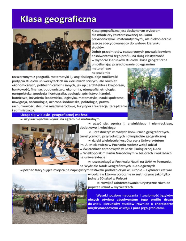 Klasa geograficzna Klasa geograficzna jest doskonałym wyborem dla młodzieży zainteresowanej naukami przyrodniczymi i matematycznymi, ale niekoniecznie jeszcze zdecydowanej co do wyboru kierunku studiów. Dobór przedmiotów rozszerzonych pozwala bowiem absolwentowi tego profilu na dużą elastyczność w wyborze kierunków studiów. Klasa geograficzna umożliwiając przygotowanie do egzaminu maturalnego na poziomie rozszerzonym z geografii, matematyki i j. angielskiego, daje możliwość podjęcia studiów uniwersyteckich na kierunkach ścisłych, ale również ekonomicznych, politechnicznych i innych, jak np.: architektura krajobrazu, bankowość, finanse, budownictwo, ekonomia, etnografia, etnologia, europeistyka, geodezja i kartografia, geologia, górnictwo, handel, hutnictwo, inżynieria środowiska, logistyka, matematyka, nauki społeczne, nawigacja, oceanologia, ochrona środowiska, politologia, prawo, rachunkowość, stosunki międzynarodowe, turystyka i rekreacja, zarządzanie i administracja. Ucząc się w klasie geograficznej możesz: • uzyskać wysokie wyniki na egzaminie maturalnym • uczyć się, oprócz j. angielskiego i niemieckiego, dodatkowo j. włoskiego • uczestniczyć w różnych konkursach geograficznych, turystycznych, przyrodniczych i olimpiadzie geograficznej • dzięki wieloletniej współpracy z Uniwersytetem im. A. Mickiewicza w Poznaniu możesz wziąć udział w ćwiczeniach terenowych w Bazie Ekologicznej UAM w Wielkopolskim Parku Narodowym w Jeziorach i wykładach na uniwersytecie • uczestniczyć w Festiwalu Nauki na UAM w Poznaniu, na Wydziale Nauk Geograficznych i Geologicznych • poznać fascynujące miejsca na największym festiwalu podróżniczym w Europie – Explorer Festiwal w Łodzi (w którym corocznie uczestniczymy, jako tylko jedna z 60 szkół w Polsce) • rozwijać zainteresowania turystyczne również poprzez udział w wycieczkach. Wysoki poziom nauczania i znajomość języków obcych otwiera absolwentom tego profilu drogę do wielu kierunków studiów również o charakterze międzynarodowym w kraju i poza jego granicami.