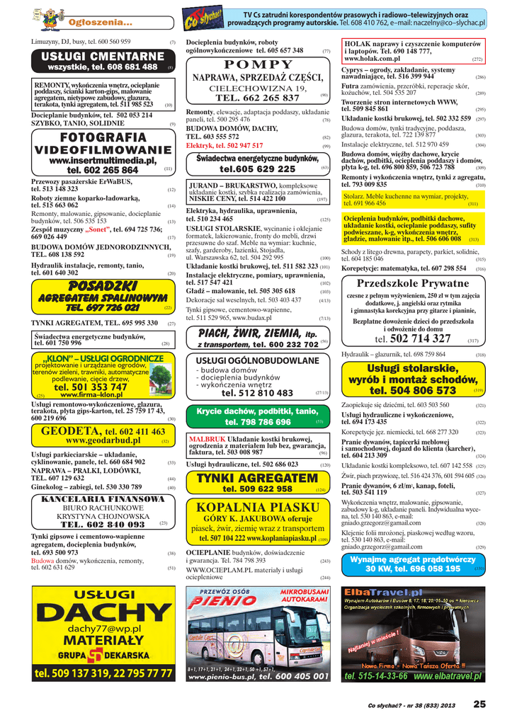 TV Cs zatrudni korespondentów prasowych i radiowo–telewizyjnych oraz prowadzących programy autorskie. Tel. 608 410 762, e–mail: naczelny@co–slychac.pl Ogłoszenia... Limuzyny, DJ, busy, tel. 600 560 959 (7) USŁUGI CMENTARNE wszystkie, tel. 608 681 488 (8) (10) (9) fotografia VIDEOFILMOWANIE www.insertmultimedia.pl, tel. 602 265 864 (11) Przewozy pasażerskie ErWaBUS, tel. 513 148 323 Roboty ziemne koparko-ładowarką, tel. 515 663 062 Remonty, malowanie, gipsowanie, docieplanie budynków, tel. 506 535 153 Zespół muzyczny „Sonet”, tel. 694 725 736; 669 026 449 (12) (14) (13) (17) Budowa domów jednorodzinnych, (19) tel. 608 138 592 Hydraulik instalacje, remonty, tanio, tel. 601 640 302 (20) Posadzki agregatem spalinowym tel. 697 726 021 (22) TYNKI AGREGATEM, TEL. 695 995 330 (27) (28) „KLON” – USŁUGI OGRODNICZE Usługi remontowo-wykończeniowe, glazura, terakota, płyta gips-karton, tel. 25 759 17 43, 600 219 696 (30) Geodeta, tel. 602 411 463 (32) Usługi parkieciarskie – układanie, cyklinowanie, panele, tel. 660 684 902 Naprawa – pralki, lodówki, tel. 607 129 632 Ginekolog – zabiegi, tel. 530 330 789 (33) (44) (40) Kancelaria finansowa Tynki gipsowe i cementowo-wapienne agregatem, docieplenia budynków, tel. 693 500 973 Budowa domów, wykończenia, remonty, tel. 602 631 629 (289) Tworzenie stron internetowych WWW, tel. 509 845 861 (295) Układanie kostki brukowej, tel. 502 332 559 (297) (82) Budowa domów, tynki tradycyjne, poddasza, glazura, terakota, tel. 722 139 877 (303) (99) Instalacje elektryczne, tel. 512 970 459 (304) (63) Budowa domów, więźby dachowe, krycie dachów, podbitki, ocieplenia poddaszy i domów, płyta k-g, tel. 696 800 859, 506 723 788 (309) (90) Remonty, elewacje, adaptacja poddaszy, układanie (78) paneli, tel. 500 295 476 BUDOWA DOMÓW, DACHY, TEL. 603 555 572 Elektryk, tel. 502 947 517 Świadectwa energetyczne budynków, tel.605 629 225 JuranD – Brukarstwo, kompleksowe układanie kostki, szybka realizacja zamówienia, niskie ceny, tel. 514 422 100 (197) Elektryka, hydraulika, uprawnienia, tel. 510 234 465 (125) Usługi stolarskie, wycinanie i oklejanie formatek, lakierowanie, fronty do mebli, drzwi przesuwne do szaf. Meble na wymiar: kuchnie, szafy, garderoby, łazienki, Stojadła, (100) ul. Warszawska 62, tel. 504 292 995 Układanie kostki brukowej, tel. 511 582 323 (101) Instalacje elektryczne, pomiary, uprawnienia, (102) tel. 517 547 421 Gładź – malowanie, tel. 505 305 618 (103) Dekoracje sal weselnych, tel. 503 403 437 (4/13) Tynki gipsowe, cementowo-wapienne, tel. 511 529 965, www.budax.pl (7/13) PIACH, ŻWIR, ZIEMIA, itp. (56) z transportem, tel. 600 232 702 tel. 512 810 483 www.firma–klon.pl tel. 602 840 093 (286) Futra zamówienia, przeróbki, reperacje skór, kożuchów, tel. 504 535 207 (27/13) Krycie dachów, podbitki, tanio, (53) tel. 798 786 696 MALBRUK Układanie kostki brukowej, ogrodzenia z materiałem lub bez, gwarancja, faktura, tel. 503 008 987 (96) Usługi hydrauliczne, tel. 502 686 023 (120) Tynki agregatem tel. 509 622 958 (124) GÓRY K. JAKUBOWA oferuje piasek, żwir, ziemię wraz z transportem tel. 507 104 222 www.koplaniapiasku.pl (109) (38) (51) Stolarz. Meble kuchenne na wymiar, projekty, (311) tel. 691 966 456 Ocieplenia budynków, podbitki dachowe, układanie kostki, ocieplanie poddaszy, sufity podwieszane, k-g, wykończenia wnętrz, gładzie, malowanie itp., tel. 506 606 008 (313) Schody z litego drewna, parapety, parkiet, solidnie, (315) tel. 604 185 046 Korepetycje: matematyka, tel. 607 298 554 (316) Przedszkole Prywatne czesne z pełnym wyżywieniem, 250 zł w tym zajęcia dodatkowe, j. angielski oraz rytmika i gimnastyka korekcyjna przy gitarze i pianinie, Bezpłatne dowożenie dzieci do przedszkola i odwożenie do domu tel. 502 714 327 (317) (318) Usługi stolarskie, wyrób i montaż schodów, tel. 504 806 573 (319) Zaopiekuje się dziećmi, tel. 603 503 560 (321) Usługi hydrauliczne i wykończeniowe, tel. 694 173 435 (322) Korepetycje jęz. niemiecki, tel. 668 277 320 (323) Pranie dywanów, tapicerki meblowej i samochodowej, dojazd do klienta (karcher), (324) tel. 604 213 309 Układanie kostki kompleksowo, tel. 607 142 558 (325) Żwir, piach przywiozę, tel. 516 424 376, 601 594 605 (326) KOPALNIA PIASKU (23) Remonty i wykończenia wnętrz, tynki z agregatu, (310) tel. 793 009 835 Hydraulik – glazurnik, tel. 698 759 864 - budowa domów - docieplenia budynków - wykończenia wnętrz tel. 501 353 747 biuro rachunkowe Krystyna Chojnowska TEL. 662 265 837 HOLAK naprawy i czyszczenie komputerów i laptopów. Tel. 690 148 777, (272) www.holak.com.pl Cyprys – ogrody, zakładanie, systemy nawadniające, tel. 516 399 944 Usługi ogólnobudowlane projektowanie i urządzanie ogrodów, terenów zieleni, trawniki, automatyczne podlewanie, cięcie drzew, www.geodarbud.pl POMPY CIELECHOWIZNA 19, Docieplanie budynków, tel. 502 053 214 SZYBKO, TANIO, SOLIDNIE (25) (77) NAPRAWA, SPRZEDAŻ CZĘŚCI, Remonty, wykończenia wnętrz, ocieplanie poddaszy, ścianki karton-gips, malowanie agregatem, nietypowe zabudowy, glazura, terakota, tynki agregatem, tel. 511 985 523 Świadectwa energetyczne budynków, tel. 601 750 996 Docieplenia budynków, roboty ogólnowykończeniowe tel. 605 657 348 OCIEPLANIE budynków, doświadczenie i gwarancja. Tel. 784 798 393 (243) WWW.OCIEPLAM.PL materiały i usługi ociepleniowe (244) Pranie dywanów, 6 zł/m2, kanap, foteli, tel. 503 541 119 (327) Wykończenia wnętrz, malowanie, gipsowanie, zabudowy k-g, układanie paneli. Indywidualna wycena, tel. 530 140 863, e-mail: (328) [email protected] Klejenie folii mrożonej, piaskowej według wzoru, tel. 530 140 863, e-mail: (329) [email protected] Wynajmę agregat prądotwórczy (330) 30 KW, tel. 696 058 195 USŁUGI [email protected] MATERIAŁY tel. 509 137 319, 22 795 77 77 Co słychać? - nr 38 (833) 2013 25