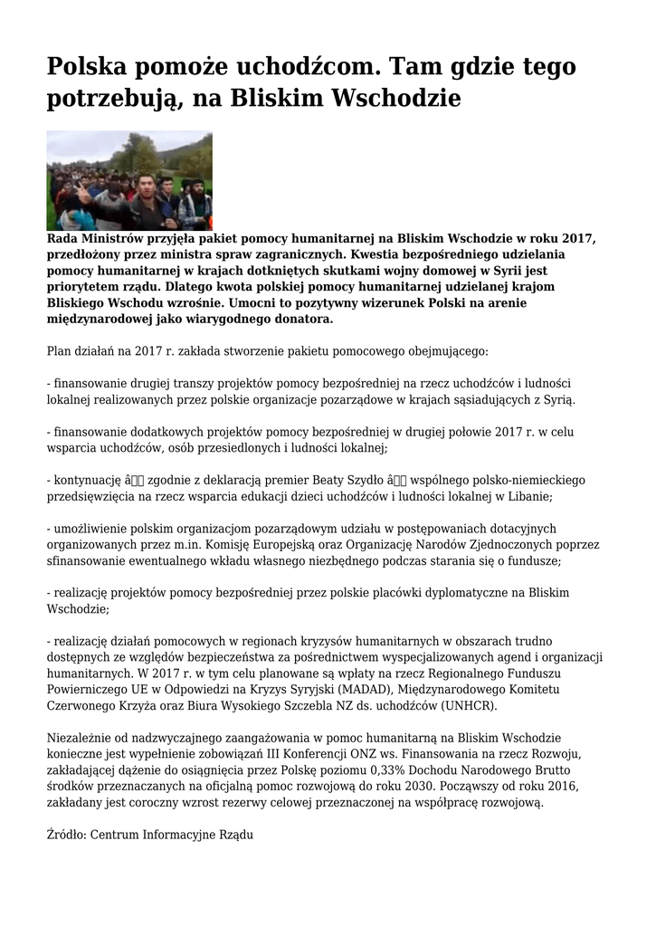 Polska pomoże uchodźcom. Tam gdzie tego potrzebują, na Bliskim Wschodzie Rada Ministrów przyjęła pakiet pomocy humanitarnej na Bliskim Wschodzie w roku 2017, przedłożony przez ministra spraw zagranicznych. Kwestia bezpośredniego udzielania pomocy humanitarnej w krajach dotkniętych skutkami wojny domowej w Syrii jest priorytetem rządu. Dlatego kwota polskiej pomocy humanitarnej udzielanej krajom Bliskiego Wschodu wzrośnie. Umocni to pozytywny wizerunek Polski na arenie międzynarodowej jako wiarygodnego donatora. Plan działań na 2017 r. zakłada stworzenie pakietu pomocowego obejmującego: - finansowanie drugiej transzy projektów pomocy bezpośredniej na rzecz uchodźców i ludności lokalnej realizowanych przez polskie organizacje pozarządowe w krajach sąsiadujących z Syrią. - finansowanie dodatkowych projektów pomocy bezpośredniej w drugiej połowie 2017 r. w celu wsparcia uchodźców, osób przesiedlonych i ludności lokalnej; - kontynuację â zgodnie z deklaracją premier Beaty Szydło â wspólnego polsko-niemieckiego przedsięwzięcia na rzecz wsparcia edukacji dzieci uchodźców i ludności lokalnej w Libanie; - umożliwienie polskim organizacjom pozarządowym udziału w postępowaniach dotacyjnych organizowanych przez m.in. Komisję Europejską oraz Organizację Narodów Zjednoczonych poprzez sfinansowanie ewentualnego wkładu własnego niezbędnego podczas starania się o fundusze; - realizację projektów pomocy bezpośredniej przez polskie placówki dyplomatyczne na Bliskim Wschodzie; - realizację działań pomocowych w regionach kryzysów humanitarnych w obszarach trudno dostępnych ze względów bezpieczeństwa za pośrednictwem wyspecjalizowanych agend i organizacji humanitarnych. W 2017 r. w tym celu planowane są wpłaty na rzecz Regionalnego Funduszu Powierniczego UE w Odpowiedzi na Kryzys Syryjski (MADAD), Międzynarodowego Komitetu Czerwonego Krzyża oraz Biura Wysokiego Szczebla NZ ds. uchodźców (UNHCR). Niezależnie od nadzwyczajnego zaangażowania w pomoc humanitarną na Bliskim Wschodzie konieczne jest wypełnienie zobowiązań III Konferencji ONZ ws. Finansowania na rzecz Rozwoju, zakładającej dążenie do osiągnięcia przez Polskę poziomu 0,33% Dochodu Narodowego Brutto środków przeznaczanych na oficjalną pomoc rozwojową do roku 2030. Począwszy od roku 2016, zakładany jest coroczny wzrost rezerwy celowej przeznaczonej na współpracę rozwojową. Źródło: Centrum Informacyjne Rządu