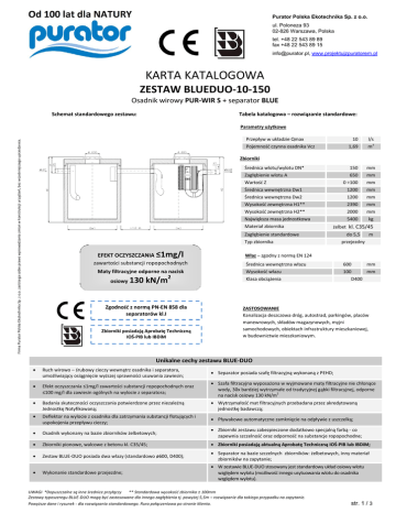 Purator Polska Ekotechnika Sp. z o.o. ul. Poloneza 93 02-826 Warszawa, Polska tel. +48 22 543 89 89 fax +48 22 543 89 15 [email protected], www.projektujzpuratorem.pl KARTA KATALOGOWA ZESTAW BLUEDUO-10-150 Osadnik wirowy PUR-WIR S + separator BLUE Schemat standardowego zestawu: Tabela katalogowa – rozwiązanie standardowe: Parametry użytkowe Firma Purator Polska Ekotechnika Sp. z o.o. zastrzega sobie prawo wprowadzania zmian w konstrukcji urządzeń, bez wcześniejszego uprzedzenia. Przepływ w układzie Qmax Pojemność czynna osadnika Vcz 10 1,69 l/s m3 150 650 0 ÷100 mm mm mm 1200 1200 2390 2000 5400 mm mm mm mm kg Zbiorniki Średnica wlotu/wylotu DN* Zagłębienie wlotu A Wartość Z Średnica wewnętrzna Dw1 Średnica wewnętrzna Dw2 Wysokość zewnętrzna H1** Wysokość zewnętrzna H2** Największa masa jednostkowa Materiał zbiornika żelbet kl. C35/45 Zagłębienie standardowe Typ zbiornika EFEKT OCZYSZCZANIA ≤1mg/l zawartości substancji ropopochodnych Maty filtracyjne odporne na nacisk 2 osiowy 130 kN/m Zgodność z normą PN-EN 858 dla separatorów kl.I Zbiorniki posiadają Aprobatę Techniczną IOŚ-PIB lub IBDiM do 5,5 m przejezdny Właz – zgodny z normą EN 124 Średnica wewnętrzna włazu Wysokość włazu Klasa obciążenia 600 100 mm mm D400 ZASTOSOWANIE Kanalizacja deszczowa dróg, autostrad, parkingów, placów manewrowych, składów magazynowych, myjni samochodowych, obiektach infrastruktury mieszkaniowej, w budownictwie mieszkaniowym. Unikalne cechy zestawu BLUE-DUO Ruch wirowo – śrubowy cieczy wewnątrz osadnika i separatora, umożliwiający osiągnięcie wyższej sprawności usuwania zawiesin; Separator posiada szafę filtracyjną wykonaną z PEHD; Efekt oczyszczania ≤1mg/l zawartości substancji ropopochodnych oraz ≤100 mg/l dla zawiesin ogólnych na wylocie z separatora; Szafa filtracyjna wyposażona w wyjmowane maty filtracyjne nie chłonące wody, 30x bardziej wytrzymałe od tradycyjnej gąbki filtracyjnej, odporne na nacisk osiowy 130 kN/m2 Badania skuteczności oczyszczania potwierdzone przez niezależną Jednostkę Notyfikowaną; Wytrzymałość mat filtracyjnych przebadana przez akredytowaną jednostkę badawczą; Deflektor na wylocie z osadnika dla zatrzymania substancji flotujących i uspokojenia przepływu cieczy; Pływakowe automatyczne zamknięcie na odpływie z uszczelką; Osadnik wykonany na bazie zbiorników żelbetowych; Zbiorniki zestawu zabezpieczone dodatkowo specjalną farbą - co zapewnia szczelność oraz odporność na substancje ropopochodne; Zbiorniki pionowe, walcowe z betonu kl. C35/45; Zbiorniki posiadają aktualną Aprobatę Techniczną IOŚ-PIB lub IBDiM; Zestaw BLUE-DUO posiada dwa włazy (standardowo ø600, D400); Separator na bazie szczelnych zbiorników: żelbetowych, inny materiał zbiorników na zapytanie; Wykonanie standardowe przejezdne; W zestawie BLUE-DUO stosowany jest standardowy układ osiowy wlotu względem wylotu (możliwość innego usytuowania wlotu do osadnika względem wylotu). UWAGI *Dopuszczalne są inne średnice przyłączy ** Standardowa wysokość zbiornika ± 100mm Zestawy typoszeregu BLUE-DUO mogą być zastosowane dla innego zagłębienia tj. powyżej 5,5m – rozwiązanie dla takiego przypadku na zapytanie. Powyższe dane i rysunek - dla rozwiązania standardowego. Rura połączeniowa po stronie klienta. str. 1 / 3 Purator Polska Ekotechnika Sp. z o.o. ul. Poloneza 93 02-826 Warszawa, Polska tel. +48 22 543 89 89 fax +48 22 543 89 15 [email protected], www.projektujzpuratorem.pl OPIS TECHNICZNY ZESTAWU BLUEDUO-10-150 Osadnik wirowy PUR-WIR S + separator BLUE Przeznaczenie Zestawu BLUE-DUO Zestaw typoszeregu BLUE-DUO przeznaczony jest do oddzielania substancji ropopochodnych zawartych w ściekach deszczowych oraz przemysłowych. Dzięki zastosowaniu w zestawie BLUE-DUO osadnika wirowego i wysokosprawnego separatora wirowokoalescencyjnego BLUE z dwustopniowym procesem oczyszczania (wirowym oraz koalescencyjnym) zgodny z oznaczeniem S-II-I-P wynikającym z normy PN-EN 858 ( znak CE), zestaw można stosować tam gdzie wymagany jest najwyższy stopień separacji substancji ropopochodnych – np. z terenów rafinerii ropy naftowej, stacji paliw, parkingów, a także w przypadku kierowania wód o zaostrzonych wymaganiach (np. rezerwaty przyrody, obszary NATURA 2000 itp.). Materiały wykonania Wizualizacja Zestawu BLUE-DUO. Zestaw BLUE-DUO zbudowany jest na bazie monolitycznych zbiorników żelbetowych z możliwością nadbudowy. Betonowe prefabrykaty wykonane są zgodnie z wymaganiami normy PN-EN 13369 z betonu klasy C35/45, gwarantującego następujące parametry: wytrzymałość na ściskanie ≥35 MPa, nasiąkliwość ≤5%, wodoszczelność co najmniej W8, mrozoodporność F150, klasy ekspozycji: XC4, XS3, XD3, XF1, XA1 (do XA3 na zapytanie). Zbiorniki zestawu zabezpieczone są dodatkowo specjalną farbą zapewniającą pełną szczelność oraz odporność na substancje ropopochodne. Wszystkie elementy wyposażenia wewnętrznego i zewnętrznego zestawu, wykonane są z materiałów odpornych na pracę w środowisku agresywnym i nie wymagają dodatkowego izolowania oraz uszczelniania. Budowa wewnętrzna i zasada działania Zestawu BLUE-DUO Zestaw BLUE-DUO składa się z osadnika wirowego PUR-WIR S oraz separatora wirowo-koalescencyjnego typoszeregu BLUE. Zanieczyszczone wody deszczowe wpływają przez wlot do specjalnie wyprofilowanej rury, która zapewnia lepszy przebieg procesu separacji zawiesin poprzez wytworzenie wirowo-śrubowego przepływu wewnątrz urządzenia – pozwala to w pełni wykorzystać pojemność osadnika. Już na wylocie z wyprofilowanej rury rozpoczyna się proces sedymentacji osadu zawartego w ściekach - opada on na dno zbiornika, a krople oleju mineralnych rozpoczynają proces flotacji. Na wylocie osadnika znajduje się deflektor, który zatrzymuje substancje flotujące i uspokaja strumień cieczy. Na wlocie do separatora również znajduje się specjalnie wyprofilowane