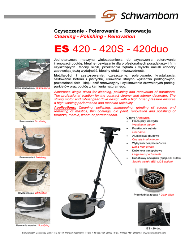 Czyszczenie - Polerowanie - Renowacja Cleaning - Polishing - Renovation ES 420 - 420S - 420duo Szamponowanie / shampooing Jednotarczowa maszyna wielozadaniowa, do czyszczenia, polerowania i renowacji podłóg. Idealne rozwiązanie dla profesjonalnych posadzkarzy i firm czyszczących. Mocny silnik, przekładnia zębata i wysoki nacisk roboczy zapewniają dużą wydajność, idealny efekt i niezawodność. Możliwości i zastosowanie: czyszczenie, polerowanie, krystalizacja, szlifowanie betonu i jastrychu, usuwanie starych wykładzin podłogowych, pozostałości farb i kleju, szlif renowacyjny i cyklinowanie drewnianych podłóg, parkietów oraz podłóg z kamienia naturalnego. Allpurpose single discs for cleaning, polishing and renovation of hardfloors. The professional solution for the contract cleaner and interior decorater. The strong motor and robust gear drive design with a high brush pressure ensures a high working performance and machine reliability. Applications: Cleaning, polishing, shampooing, grinding of screed and removing of mastics, thin coatings, old paint, renovation and polishing of terrazzo, marble, wood- or parquet floors. Szorowanie / Scrubbing Polerowanie / Polishing Krystalizacja / Vitrification Cechy / Features: • Praca przy krawędzi Working to the rim • Przekładnia zębata Gear drive • Aluminiowa obudowa Chassis in aluminum • Wyłącznik bezpieczeństwa Dead man switch • Duże koła transpotrowe Large transport wheels • Dodatkowy obciążnik (opcja ES 420S) Saddle weight (ES 420S option) Przekładnia zębata / Gear drive Usuwanie warstw / Scarifying ES 420 duo Schwamborn Gerätebau GmbH • D-73117 Wangen (Germany) • Tel.: + 49 (0) 7161 20050 • Fax.: +49 (0) 7161 200515 • www.schwamborn.com ... idealne rozwiązanie w każdym zastosowaniu ... for any application the right solution Szlifowanie parkietu / Sanding parquet Osprzęt do szamponowania Shampoo device Szczotka szorująca / Scrubbing brush Szczotka polerująca / Polishing brush Talerz napędowy, centrujący / drive plate with centering device Tarcza szlifierska WK / Tungsten carbide disc Kamień szlifierski, 5 segmentów / 5-head grinding ring corundum Dodatkowy obciążnik 5 kg * / 5 kg extra weight * Szczotka do szamponowania / Shampoo brush Talerz padowy / Padholder Agregat szlifierski, 5 głowic / 5-head grinding disc Talerz frezujący / Surface milling disc Kamień szlifierski, pierścień / Grinding ring corundum Talerz szlifierski, 3 głowice WK / 3-head WK-grinding disc Szczotka stalowa, 3 głowice / Spring steel brush Talerz szlifierski, segmenty diamentowe / Metal bond diamond grinding ring Talerz szlifierski, pady diamentowe Resin bond diamond grinding ring Talerz zacierający * / Smoothing plate * * tylko / only ES 420S Dane techniczne / Technical specification Napięcie / Częstotliwość / voltage/frequency V / Hz Moc / motor Watt Klasa bezpieczeństwa Stopień bezpieczeństwa Szerokość robocza Obroty ES 420 / S / protection class / protection grade / working width / tool speed / tool speed IP mm min-1 /r.p.m. 230 / 50-60 1200 / 1600/ 1300-1600 I 44 420 170 / 140 min-1 /r.p.m. 140-280 ES 420 duo Przekładnia zębata / gear drive TAK Nacisk roboczy / working pressure g/cm² Moment obrotowy / torque Nm Długość kabla Waga * Ø przyłącza odkurzacza Poziom hałasu Zabezpieczenie przeciwprzeciążeniowe CE Certyfikat / cable length / operating weight * / vacuum connection / Noise level / overload protection m kg mm dB(A) 50/ 54/ 60 56/ 102/ 99-55 12 40/ 43/ 43 38 62 / 63 Standard / CE-declaration * ES 420S: = 48 kg z dodatkowym obciążnikiem 5 kg Schwamborn Gerätebau GmbH • D-73117 Wangen (Germany) • Tel.: + 49 (0) 7161 20050 • Fax.: +49 (0) 7161 200515 • www.schwamborn.com TAK