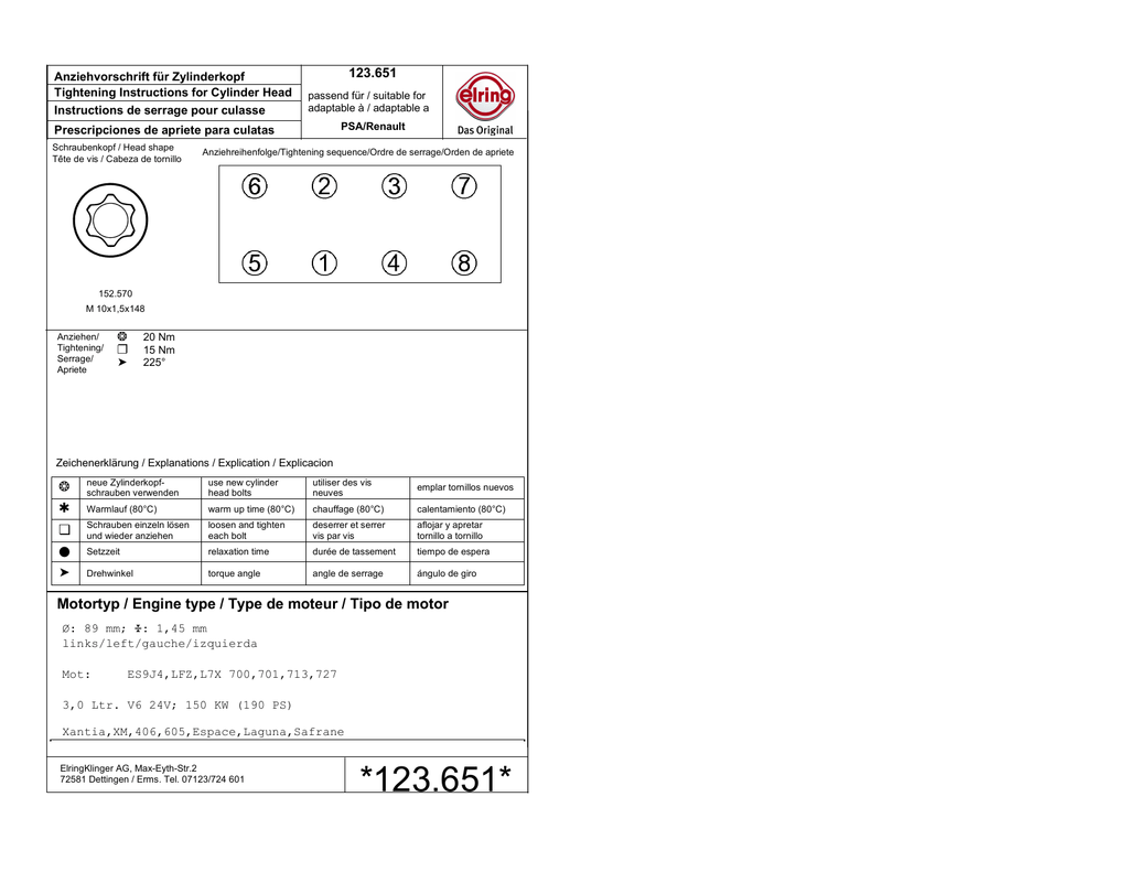 Anziehvorschrift für Zylinderkopf Tightening Instructions for Cylinder Head Instructions de serrage pour culasse 123.651 passend für / suitable for adaptable à / adaptable a PSA/Renault Prescripciones de apriete para culatas Schraubenkopf / Head shape Tête de vis / Cabeza de tornillo Anziehreihenfolge/Tightening sequence/Ordre de serrage/Orden de apriete 152.570 M 10x1,5x148 Anziehen/ Tightening/ Serrage/ Apriete ❂ ❐ ➤ 20 Nm 15 Nm 225° Zeichenerklärung / Explanations / Explication / Explicacion ❂ neue Zylinderkopfschrauben verwenden use new cylinder head bolts utiliser des vis neuves emplar tornillos nuevos ✱ Warmlauf (80°C) warm up time (80°C) chauffage (80°C) calentamiento (80°C) ❏ Schrauben einzeln lösen und wieder anziehen loosen and tighten each bolt deserrer et serrer vis par vis aflojar y apretar tornillo a tornillo ● Setzzeit relaxation time durée de tassement tiempo de espera ➤ Drehwinkel torque angle angle de serrage ángulo de giro Motortyp / Engine type / Type de moteur / Tipo de motor Ø: 89 mm; ¿: 1,45 mm links/left/gauche/izquierda Mot: ES9J4,LFZ,L7X 700,701,713,727 3,0 Ltr. V6 24V; 150 KW (190 PS) Xantia,XM,406,605,Espace,Laguna,Safrane ElringKlinger AG, Max-Eyth-Str.2 72581 Dettingen / Erms. Tel. 07123/724 601 *123.651*