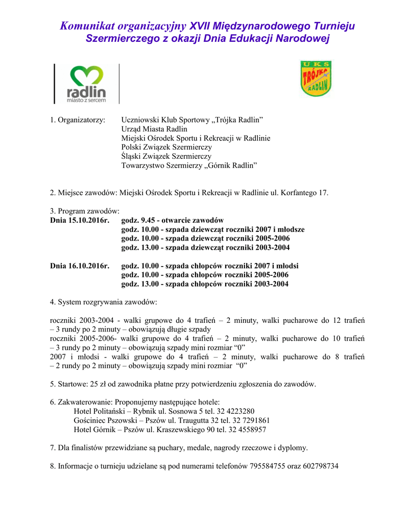 Komunikat organizacyjny XVII Międzynarodowego Turnieju Szermierczego z okazji Dnia Edukacji Narodowej 1. Organizatorzy: Uczniowski Klub Sportowy „Trójka Radlin” Urząd Miasta Radlin Miejski Ośrodek Sportu i Rekreacji w Radlinie Polski Związek Szermierczy Śląski Związek Szermierczy Towarzystwo Szermierzy „Górnik Radlin” 2. Miejsce zawodów: Miejski Ośrodek Sportu i Rekreacji w Radlinie ul. Korfantego 17. 3. Program zawodów: Dnia 15.10.2016r. godz. 9.45 - otwarcie zawodów godz. 10.00 - szpada dziewcząt roczniki 2007 i młodsze godz. 10.00 - szpada dziewcząt roczniki 2005-2006 godz. 13.00 - szpada dziewcząt roczniki 2003-2004 Dnia 16.10.2016r. godz. 10.00 - szpada chłopców roczniki 2007 i młodsi godz. 10.00 - szpada chłopców roczniki 2005-2006 godz. 13.00 - szpada chłopców roczniki 2003-2004 4. System rozgrywania zawodów: roczniki 2003-2004 - walki grupowe do 4 trafień – 2 minuty, walki pucharowe do 12 trafień – 3 rundy po 2 minuty – obowiązują długie szpady roczniki 2005-2006- walki grupowe do 4 trafień – 2 minuty, walki pucharowe do 10 trafień – 3 rundy po 2 minuty – obowiązują szpady mini rozmiar “0” 2007 i młodsi - walki grupowe do 4 trafień – 2 minuty, walki pucharowe do 8 trafień – 2 rundy po 2 minuty – obowiązują szpady mini rozmiar “0” 5. Startowe: 25 zł od zawodnika płatne przy potwierdzeniu zgłoszenia do zawodów. 6. Zakwaterowanie: Proponujemy następujące hotele: Hotel Politański – Rybnik ul. Sosnowa 5 tel. 32 4223280 Gościniec Pszowski – Pszów ul. Traugutta 32 tel. 32 7291861 Hotel Górnik – Pszów ul. Kraszewskiego 90 tel. 32 4558957 7. Dla finalistów przewidziane są puchary, medale, nagrody rzeczowe i dyplomy. 8. Informacje o turnieju udzielane są pod numerami telefonów 795584755 oraz 602798734