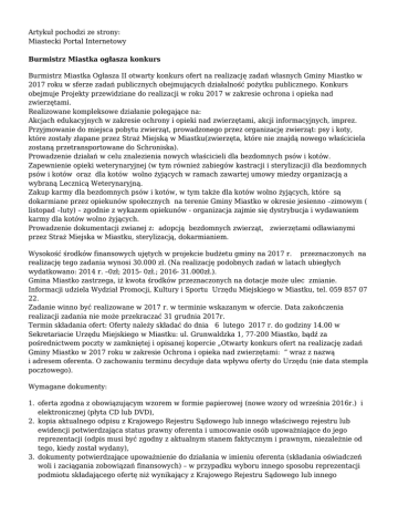 Artykuł pochodzi ze strony: Miastecki Portal Internetowy Burmistrz Miastka ogłasza konkurs Burmistrz Miastka Ogłasza II otwarty konkurs ofert na realizację zadań własnych Gminy Miastko w 2017 roku w sferze zadań publicznych obejmujących działalność pożytku publicznego. Konkurs obejmuje Projekty przewidziane do realizacji w roku 2017 w zakresie ochrona i opieka nad zwierzętami. Realizowane kompleksowe działanie polegające na: Akcjach edukacyjnych w zakresie ochrony i opieki nad zwierzętami, akcji informacyjnych, imprez. Przyjmowanie do miejsca pobytu zwierząt, prowadzonego przez organizację zwierząt: psy i koty, które zostały złapane przez Straż Miejską w Miastku(zwierzęta, które nie znajdą nowego właściciela zostaną przetransportowane do Schroniska). Prowadzenie działań w celu znalezienia nowych właścicieli dla bezdomnych psów i kotów. Zapewnienie opieki weterynaryjnej (w tym również zabiegów kastracji i sterylizacji) dla bezdomnych psów i kotów oraz dla kotów wolno żyjących w ramach zawartej umowy miedzy organizacją a wybraną Lecznicą Weterynaryjną. Zakup karmy dla bezdomnych psów i kotów, w tym także dla kotów wolno żyjących, które są dokarmiane przez opiekunów społecznych na terenie Gminy Miastko w okresie jesienno –zimowym ( listopad –luty) – zgodnie z wykazem opiekunów - organizacja zajmie się dystrybucja i wydawaniem karmy dla kotów wolno żyjących. Prowadzenie dokumentacji zwianej z: adopcją bezdomnych zwierząt, zwierzętami odławianymi przez Straż Miejska w Miastku, sterylizacją, dokarmianiem. Wysokość środków finansowych ujętych w projekcie budżetu gminy na 2017 r. przeznaczonych na realizację tego zadania wynosi 30.000 zł. (Na realizację podobnych zadań w latach ubiegłych wydatkowano: 2014 r. –0zł; 2015- 0zł.; 2016- 31.000zł.). Gmina Miastko zastrzega, iż kwota środków przeznaczonych na dotacje może ulec zmianie. Informacji udziela Wydział Promocji, Kultury i Sportu Urzędu Miejskiego w Miastku, tel. 059 857 07 22. Zadanie winno być realizowane w 2017 r. w terminie wskazanym w ofercie. Data zakończenia realizacji zadania nie może przekraczać 31 grudnia 2017r. Termin składania ofert: Oferty należy składać do dnia 6 lutego 2017 r. do godziny 14.00 w Sekretariacie Urzędu Miejskiego w Miastku: ul. Grunwaldzka 1, 77-200 Miastko, bądź za pośrednictwem poczty w zamkniętej i opisanej kopercie „Otwarty konkurs ofert na realizację zadań Gminy Miastko w 2017 roku w zakresie Ochrona i opieka nad zwierzętami: ” wraz z nazwą i adresem oferenta. O zachowaniu terminu decyduje data wpływu oferty do Urzędu (nie data stempla pocztowego). Wymagane dokumenty: 1. oferta zgodna z obowiązującym wzorem w formie papierowej (nowe wzory od września 2016r.) i elektronicznej (płyta CD lub DVD), 2. kopia aktualnego odpisu z Krajowego Rejestru Sądowego lub innego właściwego rejestru lub ewidencji potwierdzająca status prawny oferenta i umocowanie osób upoważniające do jego reprezentacji (odpis musi być zgodny z aktualnym stanem faktycznym i prawnym, niezależnie od tego, kiedy został wydany), 3. dokumenty potwierdzające upoważnienie do działania w imieniu oferenta (składania oświadczeń woli i zaciągania zobowiązań finansowych) – w przypadku wyboru innego sposobu reprezentacji podmiotu składającego ofertę niż wynikający z Krajowego Rejestru Sądowego lub innego właściwego rejestru lub ewidencji, 4. informacja podpisana przez upoważnione osoby o aktualnym składzie zarządu (zgodna z zapisami statutu) wraz z załączoną stosowną uchwałą z wyboru oraz wskazaniem osób upoważnionych do jego reprezentowania (składania oświadczeń woli i zaciągania zobowiązań finansowych), – jeżeli skład zarządu i umocowania osób nie wynikają z przedstawionej dokumentacji, tj. odpisu KRS lub innego właściwego rejestru lub ewidencji, 5. statut. Rozpatrywane będą wyłącznie oferty: 1. przygotowane na obowiązującym formularzu, wypełnione prawidłowo i bez błędów, podpisane oraz z kompletem załączników, 2. złożone w terminie określonym w ogłoszeniu konkursowym, Oferty nieprawidłowo wypełnione, niepodpisane, niezgodne z obowiązującym wzorem, oraz złożone po terminie nie będą rozpatrywane. UWAGA: Wszystkie niezbędne dokumenty dotyczące w/w konkursu znajdują się na stronie internetowej Urzędu Miejskiego w Miastku www.miastko.pl oraz dostępne są w Wydziale Promocji, Kultury i Sportu Urzędu (pokój nr 25), tel. 059 857 07 22, e-mail: [email protected] Załączniki: 1. Pełna treść ogłoszenia 2. Zaktualizowany kosztorys oraz harmonogram zadania 3. Wzór oferty data publikacji: 2016-08-17 00:00:00