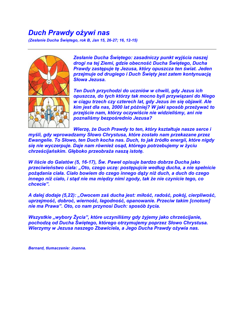 Duch Prawdy ożywi nas (Zesłanie Ducha Świętego, rok B, Jan 15, 26-27; 16, 12-15) Zesłanie Ducha Świętego: zasadniczy punkt wyjścia naszej drogi na tej Ziemi, gdzie obecność Ducha Świętego, Ducha Prawdy zastępuje tę Jezusa, który opuszcza ten świat. Jeden przejmuje od drugiego i Duch Święty jest zatem kontynuacją Słowa Jezusa. Ten Duch przychodzi do uczniów w chwili, gdy Jezus ich opuszcza, do tych którzy tak mocno byli przywiązani do Niego w ciągu trzech czy czterech lat, gdy Jezus im się objawił. Ale kim jest dla nas, 2000 lat później? W jaki sposób przeżywać to przejście nam, którzy oczywiście nie widzieliśmy, ani nie poznaliśmy bezpośrednio Jezusa? Wierzę, że Duch Prawdy to ten, który kształtuje nasze serce i myśli, gdy wprowadzamy Słowo Chrystusa, które zostało nam przekazane przez Ewangelie. To Słowo, ten Duch kocha nas. Duch, to jak źródło energii, które nigdy się nie wyczerpuje. Daje nam również osąd, którego potrzebujemy w życiu chrześcijańskim. Głęboko przeobraża naszą istotę. W liście do Galatów (5, 16-17), Św. Paweł opisuje bardzo dobrze Ducha jako przeciwieństwo ciała: „Oto, czego uczę: postępujcie według ducha, a nie spełnicie pożądania ciała. Ciało bowiem do czego innego dąży niż duch, a duch do czego innego niż ciało, i stąd nie ma między nimi zgody, tak że nie czynicie tego, co chcecie”. A dalej dodaje (5,22): „Owocem zaś ducha jest: miłość, radość, pokój, cierpliwość, uprzejmość, dobroć, wierność, łagodność, opanowanie. Przeciw takim [cnotom] nie ma Prawa”. Oto, co nam przynosi Duch: sposób życia. Wszystkie „wybory Życia”, które uczyniliśmy gdy żyjemy jako chrześcijanie, pochodzą od Ducha Świętego, którego otrzymujemy poprzez Słowo Chrystusa. Wierzymy w Jezusa naszego Zbawiciela, a Jego Ducha Prawdy ożywia nas. Bernard, tłumaczenie: Joanna.