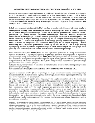 OBWIESZCZENIE O DRUGIEJ LICYTACJI NIERUCHOMOŚCI nr KW 7658 Komornik Sądowy przy Sądzie Rejonowym w Nakle nad Notecią Tadeusz Matusiak na podstawie art. 953 kpc podaje do publicznej wiadomości, że: w dniu 24-02-2017r. o godz. 12:30 w Sądzie Rejonowym w Nakle nad Notecią 89-100 Nakło n.Not. , ul.Sądowa 3 odbędzie się druga licytacja lokalu mieszkalnego położonego: 89-100 Nakło, Bydgoska 41/12, dla którego Sąd Rejonowy w Nakle nad Notecią IV Wydział Ksiąg Wieczystych prowadzi księgę wieczystą o numerze KW 7658 [NKW: BY1N/00007658/5]. Lokal o powierzchni użytkowej 22,25m 2 zgodnie z pomiarami dokonanymi przez biegłą w dniu oględzin (według stanu wskazanego w księdze wieczystej KW 7658- 36,14 m 2), położony na IV piętrze budynku mieszkalnego. Składa się z czterech pomieszczeń: pokoju i kuchni, położonych po jednej stronie korytarza stanowiącego własność wspólną wszystkich mieszkańców, a także pokoju i łazienki bez w.c. położonych po drugiej stronie korytarza. Na klatce schodowej w części wspólnej znajduje się w.c. w którym mieści się piec gazowy dla mieszkania nr 12. Mieszkanie wyposażone w instalację gazową, elektryczną i wodociągową, które aktualnie są odłączone oraz domofon znajdujący się w części wspólnej. Lokal mieszkalny niski, wysokość pomieszczeń waha się od 2,04 m do 2,27 m, a więc poniżej wymagalnej prawem wysokości dopuszczalnej dla lokali mieszkalnych na stały pobyt ludzi (2,40 m). Stan techniczny lokalu średni, mieszkanie do remontu kapitalnego. Suma oszacowania wynosi 40 800,00 zł, zaś cena wywołania jest równa 2/3 sumy oszacowania i wynosi: 27 200,00 zł. Licytant przystępujący do przetargu powinien złożyć rękojmię w wysokości jednej dziesiątej sumy oszacowania, to jest 4 080,00 zł. Rękojmia powinna być złożona w gotówce albo książeczce oszczędnościowej banków uprawnionych według prawa bankowego zaopatrzonej w upoważnienie właściciela książeczki do wypłaty całego wkładu stosownie do prawomocnego postanowienia sądu o utracie rękojmi. Rękojmię nalezy uiścic w kasie w kancelarii komornika lub na konto komornika (najpóźniej w dniu poprzedzającym przetarg): Powszechna Kasa Oszczędnosci Bank Polski SA 90 1020 1462 0000 7102 0022 4303. Zgodnie z przepisem art.976 §1 kpc w przetargu nie mogą uczestniczyć osoby, które mogą nabyć nieruchomość tylko za zezwoleniem organu państwowego, a zezwolenia tego nie przedstawiły oraz inne osoby wymienione w tym artykule. W ciągu dwóch ostatnich tygodni przed licytacją wolno oglądać nieruchomość w dni powszednie od godz. 10.00 do godz.14.00 oraz przeglądać akta egzekucyjne w Sądzie Rejonowym w Nakle nad Notecią 89-100 Nakło n.Not. , ul.Sądowa 3, operat szacunkowy do wglądu w Kancelarii. Prawa osób trzecich nie będą przeszkodą do licytacji i przysądzenia własności na rzecz nabywcy bez zastrzeżeń, jeżeli osoby te przed rozpoczęciem przetargu nie złożą dowodu, że wniosły powództwo o zwolnienie nieruchomości lub przedmiotów razem z nią zajętych od egzekucji i uzyskały w tym zakresie orzeczenie wstrzymujące egzekucję. Użytkowanie, służebności i prawa dożywotnika, jeżeli nie są ujawnione w księdze wieczystej lub przez złożenie dokumentu do zbioru dokumentów i nie zostaną zgłoszone najpóźniej na trzy dni przed rozpoczęciem licytacji, nie będą uwzględnione w dalszym toku egzekucji i wygasną z chwilą uprawomocnienia się postanowienia o przysądzeniu własności. Zgodnie z § 23 rozporządzenia Ministra finansów z dnia 28 marca 2011 r. w sprawie zwrotu podatku niektórym podatnikom, wystawiania faktur, sposobu ich przechowywania oraz listy towarów i usług, do których nie mają zastosowania zwolnienia od podatku od towarów i usług (Dz.U. Nr 68, poz.360) komornicy sądowi wykonujący czynności egzekucyjne w rozumieniu przepisów ustawy z dnia 17 listopada 1964 r. - Kodeks postępowania cywilnego, w przypadku sprzedaży towarów, wystawiają w imieniu dłużnika i na jego rachunek faktury potwierdzające dokonanie sprzedaży tych towarów. Fakturę wystawia się, jeżeli na dłużniku spoczywa obowiązek podatkowy związany ze sprzedażą towarów.