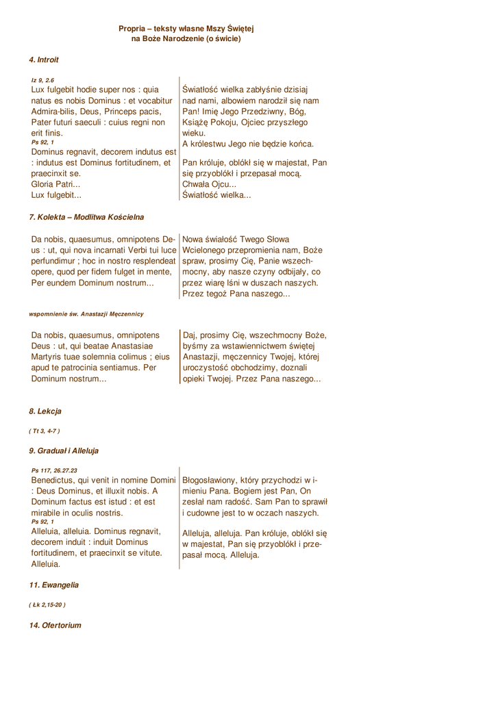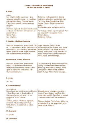 Propria – teksty własne Mszy Świętej na Boże Narodzenie (o świcie) 4. Introit Iz 9, 2.6 Lux fulgebit hodie super nos : quia natus es nobis Dominus : et vocabitur Admira-bilis, Deus, Princeps pacis, Pater futuri saeculi : cuius regni non erit finis. Ps 92, 1 Dominus regnavit, decorem indutus est : indutus est Dominus fortitudinem, et praecinxit se. Gloria Patri... Lux fulgebit... Światłość wielka zabłyśnie dzisiaj nad nami, albowiem narodził się nam Pan! Imię Jego Przedziwny, Bóg, Książę Pokoju, Ojciec przyszłego wieku. A królestwu Jego nie będzie końca. Pan króluje, oblókł się w majestat, Pan się przyoblókł i przepasał mocą. Chwała Ojcu... Światłość wielka... 7. Kolekta – Modlitwa Kościelna Da nobis, quaesumus, omnipotens Deus : ut, qui nova incarnati Verbi tui luce perfundimur ; hoc in nostro resplendeat opere, quod per fidem fulget in mente, Per eundem Dominum nostrum... Nowa świałość Twego Słowa Wcielonego przepromienia nam, Boże spraw, prosimy Cię, Panie wszechmocny, aby nasze czyny odbijały, co przez wiarę lśni w duszach naszych. Przez tegoż Pana naszego... wspomnienie św. Anastazji Męczennicy Da nobis, quaesumus, omnipotens Deus : ut, qui beatae Anastasiae Martyris tuae solemnia colimus ; eius apud te patrocinia sentiamus. Per Dominum nostrum... Daj, prosimy Cię, wszechmocny Boże, byśmy za wstawiennictwem świętej Anastazji, męczennicy Twojej, której uroczystość obchodzimy, doznali opieki Twojej. Przez Pana naszego... 8. Lekcja ( Tt 3, 4-7 ) 9. Graduał i Alleluja Ps 117, 26.27.23 Benedictus, qui venit in nomine Domini : Deus Dominus, et illuxit nobis. A Dominum factus est istud : et est mirabile in oculis nostris. Błogosławiony, który przychodzi w imieniu Pana. Bogiem jest Pan, On zesłał nam radość. Sam Pan to sprawił i cudowne jest to w oczach naszych. Ps 92, 1 Alleluia, alleluia. Dominus regnavit, decorem induit : induit Dominus fortitudinem, et praecinxit se vitute. Alleluia. 11. Ewangelia ( Łk 2,15-20 ) 14. Ofertorium Alleluja, alleluja. Pan króluje, oblókł się w majestat, Pan się przyoblókł i przepasał mocą. Alleluja. Ps 92, 1-2 Deus firmavit orbem terrae, qui non commovebitur : parata sedes tua, Deus, ex tunc, a saeculo tu es. Bóg utwierdził okrąg ziemski, iż się nie zachwieje. Tron Twój, Boże, stoi mocno z dawna, Ty jesteś od wieków. 22. Sekreta Munera nostra, quaesumus, Domine, Nativitatis hodiernae mysteriis apata proveniant, et pacem nobis semper infundant : ut, sicut homo genitus idem refulsit et Deus, sic nobis haec terrena substantia conferat, quod divinum est. Per eundem Dominum nostrum... Prosimy Cię, Panie, niechaj danina nasza godna się okaże dzisiejszej tajemnicy Narodzenia i pokój w nas zawsze wprowadza, a jako Ten, który stawszy się człowiekiem, Bogiem się okazał, tak niechaj i te ziemskie dary przysporzą nam tego, co jest Boże, przez tegoż Pana naszego... za św. Anastazję Accipe, quaesumus, domine, munera dignanter oblata : et veatae Anastasiae Martyris tuae suffragantibus meritis, ad nostrae salutis auxilium provenire concede. Per Dominum nostrum... Łaskawie przyjmij, Panie, ofiarę Tobie składaną i spraw, by przez zasługi świętej Anastazji, Twojej męczennicy, była nam pomocą ku zbawieniu. Przez Pana naszego... 23. Prefacja ( O Bożym Narodzeniu ) Vere dignum et iustum est, aequum et salutare, nos tibi semper et ubique grati-as agere : Domine, sancte Pater, omni-potens aeterne Deus: Zaprawdę godne to i sprawiedliwe, słuszne i zbawienne, abyśmy zawsze i wszędzie Tobie składali dziękczynienie, Panie, Ojcze Święty, wszechmogą-cy, wieczny Boże: Quia per incarnati Verbi mysterium, no- Albowiem przez tajemnicę wcielonego va mentis nostrae oculis lux tuae Słowa zajaśniał oczom naszej duszy clarita-tis infulsit : ut, dum visibiliter no-wy blask Twojej światłości, abyśmy Deum co-gnoscimus, per hunc in po-znając Boga w widzialnej postaci, invisibilium amorem rapiamur. zosta-li przezeń porwani do umiłowania rze-czy niewidzialnych. Et ideo cum Angelis et Archangelis, Przeto z Aniołami i Archaniołami, cum Thronis et Dominationibus, cum- z Tronami i Panowaniami oraz ze que omni militia caelestis exercitus, wszystkimi hufcami wojska niebiehymnum gloriae tuae canimus, sine skiego śpiewamy hymn ku Twej fine dicentes: chwale, wołając bez końca: Communicantes na Boże Narodzenie Communicantes, et diem sacratissimum celebrantes, quo beatae Mariae inteme-rata virginitas huic mundo edidit Salva-torem : sed et memoriam venerantes, in primis eiusdem gloriosae semper Virgi-nis Mariae, Genitricis eiusdem Dei et Domini nostri Iesu Christi : 39. Komunia W Świętych obcowaniu, obchodzimy prześwięty dzień, w którym Najświętsza Dziewica Maryja porodziła temu światu Zbawiciela, i ze czcią wspominamy przede wszystkim wsławioną zawsze Dziewicę Maryję, Rodzicielkę tegoż Boga i Pana naszego Jezusa Chrystusa: Za 9,9 Exsulta, filia Sion, lauda, filia Ierusalem : ecce rex tuus venit sanctus, et salvator mundi. Raduj się wielce córko Syjonu, wykrzykuj, córko Jeruzalem, oto Król twój przychodzi, On Święty i zbawiciel świata. 40. Pokomunia Huius nos, Domine, sacramenti semper novitas natalis instauret : cuius Nativitas singularis humanam repulit vetustatem. Per Dominum nostrum... Niechaj nas zawsze odradza, Panie, Wznowienie tajemnicy przyjścia na świat Tego, którego Narodzenie zniosło starą ludzkości przewinę. Przez tegoż Pana naszego... za św. Anastazję Satiasti, Domine, familiam tuam muneribus sacris : eius, quaesumus, semper interventione nos refove, cuius solemnia celebramus. Per Dominum nostrum... Nasyciłeś, Panie, dzieci Twoje świętymi darami, prosimy Cię, racz nas stale ożywiać za wstawiennictwem tej, której uroczystość obchodzimy. Przez Pana naszego...