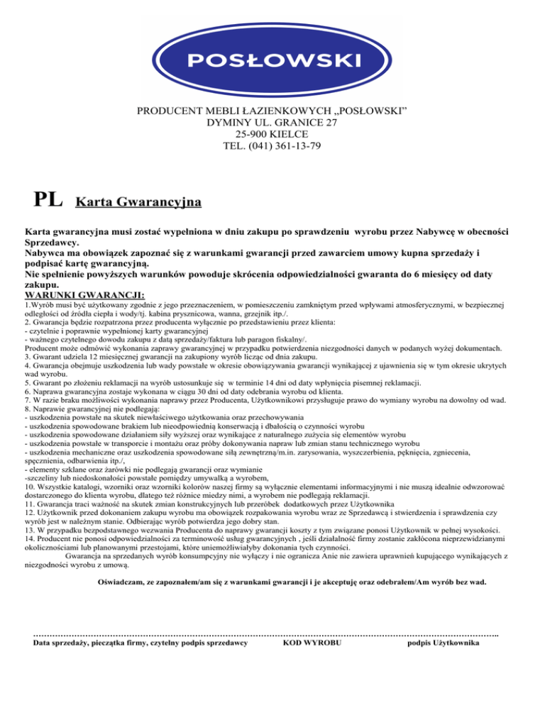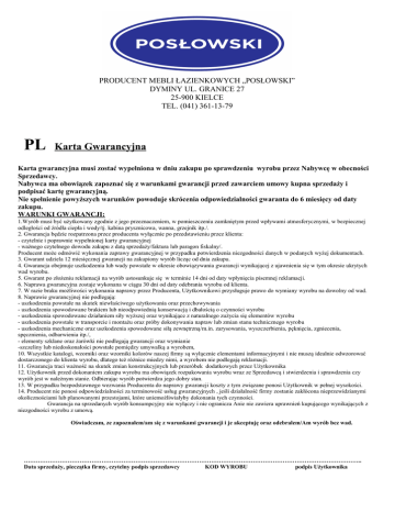PRODUCENT MEBLI ŁAZIENKOWYCH „POSŁOWSKI” DYMINY UL. GRANICE 27 25-900 KIELCE TEL. (041) 361-13-79 PL Karta Gwarancyjna Karta gwarancyjna musi zostać wypełniona w dniu zakupu po sprawdzeniu wyrobu przez Nabywcę w obecności Sprzedawcy. Nabywca ma obowiązek zapoznać się z warunkami gwarancji przed zawarciem umowy kupna sprzedaży i podpisać kartę gwarancyjną. Nie spełnienie powyższych warunków powoduje skrócenia odpowiedzialności gwaranta do 6 miesięcy od daty zakupu. WARUNKI GWARANCJI: 1.Wyrób musi być użytkowany zgodnie z jego przeznaczeniem, w pomieszczeniu zamkniętym przed wpływami atmosferycznymi, w bezpiecznej odległości od źródła ciepła i wody/tj. kabina prysznicowa, wanna, grzejnik itp./. 2. Gwarancja będzie rozpatrzona przez producenta wyłącznie po przedstawieniu przez klienta: - czytelnie i poprawnie wypełnionej karty gwarancyjnej - ważnego czytelnego dowodu zakupu z datą sprzedaży/faktura lub paragon fiskalny/. Producent może odmówić wykonania zaprawy gwarancyjnej w przypadku potwierdzenia niezgodności danych w podanych wyżej dokumentach. 3. Gwarant udziela 12 miesięcznej gwarancji na zakupiony wyrób licząc od dnia zakupu. 4. Gwarancja obejmuje uszkodzenia lub wady powstałe w okresie obowiązywania gwarancji wynikającej z ujawnienia się w tym okresie ukrytych wad wyrobu. 5. Gwarant po złożeniu reklamacji na wyrób ustosunkuje się w terminie 14 dni od daty wpłynięcia pisemnej reklamacji. 6. Naprawa gwarancyjna zostaje wykonana w ciągu 30 dni od daty odebrania wyrobu od klienta. 7. W razie braku możliwości wykonania naprawy przez Producenta, Użytkownikowi przysługuje prawo do wymiany wyrobu na dowolny od wad. 8. Naprawie gwarancyjnej nie podlegają: - uszkodzenia powstałe na skutek niewłaściwego użytkowania oraz przechowywania - uszkodzenia spowodowane brakiem lub nieodpowiednią konserwacją i dbałością o czynności wyrobu - uszkodzenia spowodowane działaniem siły wyższej oraz wynikające z naturalnego zużycia się elementów wyrobu - uszkodzenia powstałe w transporcie i montażu oraz próby dokonywania napraw lub zmian stanu technicznego wyrobu - uszkodzenia mechaniczne oraz uszkodzenia spowodowane siłą zewnętrzną/m.in. zarysowania, wyszczerbienia, pęknięcia, zgniecenia, spęcznienia, odbarwienia itp./, - elementy szklane oraz żarówki nie podlegają gwarancji oraz wymianie -szczeliny lub niedoskonałości powstałe pomiędzy umywalką a wyrobem, 10. Wszystkie katalogi, wzorniki oraz wzorniki kolorów naszej firmy są wyłącznie elementami informacyjnymi i nie muszą idealnie odwzorować dostarczonego do klienta wyrobu, dlatego też różnice miedzy nimi, a wyrobem nie podlegają reklamacji. 11. Gwarancja traci ważność na skutek zmian konstrukcyjnych lub przeróbek dodatkowych przez Użytkownika 12. Użytkownik przed dokonaniem zakupu wyrobu ma obowiązek rozpakowania wyrobu wraz ze Sprzedawcą i stwierdzenia i sprawdzenia czy wyrób jest w należnym stanie. Odbierając wyrób potwierdza jego dobry stan. 13. W przypadku bezpodstawnego wezwania Producenta do naprawy gwarancji koszty z tym związane ponosi Użytkownik w pełnej wysokości. 14. Producent nie ponosi odpowiedzialności za terminowość usług gwarancyjnych , jeśli działalność firmy zostanie zakłócona nieprzewidzianymi okolicznościami lub planowanymi przestojami, które uniemożliwiałyby dokonania tych czynności. Gwarancja na sprzedanych wyrób konsumpcyjny nie wyłączy i nie ogranicza Anie nie zawiera uprawnień kupującego wynikających z niezgodności wyrobu z umową. Oświadczam, ze zapoznałem/am się z warunkami gwarancji i je akceptuję oraz odebrałem/Am wyrób bez wad. …………………………………………………………………………………………………………………………………………………….. Data sprzedaży, pieczątka firmy, czytelny podpis sprzedawcy KOD WYROBU podpis Użytkownika
