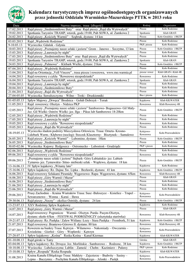 Kalendarz turystycznych imprez ogólnodostępnych organizowanych przez jednostki Oddziału Warmińsko-Mazurskiego PTTK w 2013 roku Data 17.02.2013 19.02.2013 24.02.2013 03.03.2013 9-10.03.13 10.03.2013 15.03.2013 17.03.2013 19.03.2013 24.03.2013 07.04.2013 13.04.2013 14.04.2013 16.04.2013 19.04.2013 20.04.2013 21.04.2013 27.04-05.05 01-05.05.13 11.05.2013 12.05.2013 12.05.2013 17.05.2013 19.05.2013 19.05.2013 18-19.05.13 26.05.2013 26.05.2013 30.05-02.06 02.06.2013 09.06.2013 09.06.2013 13-16.06.13 15-16.06.13 16.06.2013 16.06.2013 16.06.2013 21.06.2013 23.06.2013 29.06.2013 29-30.06.13 13-23.07.13 14.07.2013 14.07.2013 19-21.07.13 21.07.2013 27.07.2013 27-28.07.13 01-10.08.13 03-04.08.13 10-18.08.13 15-18.08.13 31.08.2013 Nazwa imprezy, trasa [długość] Rajd pieszy „Siedmiomilowe Buty” oraz Rajd pieszy „Rajd dla Wytrwałych” Spotkania Turystów TRAMP, wtorek, godz.19:00, Pub SOWA, ul. Zamkowa 2 Rajd pieszy „Kościoły Warmii” – Sząbruk, dystans: 14 km Rajd „Wędrówki Rodzinne” Wycieczka: Gdańsk - Gdynia Rajd pieszy „Poznajemy nasze szlaki i jeziora” Grom – Janowo – Szczytno, 13 km Rajd pieszy „Laurencja by night” Rajd pieszy „Siedmiomilowe Buty” oraz Rajd pieszy „Rajd dla Wytrwałych” Spotkania Turystów TRAMP, wtorek, godz.19:00, Pub SOWA, ul. Zamkowa 2 Rajd pieszy „Palmowa” – Klebark Wielki, dystans: 21km Rajd pieszy „Wędrówki Rodzinne” Rajd na Orientację „Vell Vincere” , trasa piesza i rowerowa, www.rno.warmia.pl Rajd rowerowy z cyklu "Rowerowe niespodzianki" Spotkania Turystów TRAMP, wtorek, godz.19:00, Pub SOWA, ul. Zamkowa 2 Rajd pieszy „Laurencja by night” Rajd pieszy „Siedmiomilowe Buty” Rajd pieszy „Rajd dla Wytrwałych” Wycieczka: Suwalszczyzna – Wilno – Troki - Druskienniki Spływ Majowy „Drwęca” Brodnica – Golub Dobrzyń – Toruń Rajd rowerowy: Olsztyn – Nidzica PKP Rajd pieszy „Poznajemy nasze szlaki i jeziora” Samborowo- Boguszewo- Gil MałyJez. Gil Wielki- Ostrów Wielki- jez. Iłga – Pikus lub Samborowo 18-20km Rajd pieszy „Wędrówki Rodzinne” Rajd pieszy „Laurencja by night” Rajd rowerowy z cyklu "Rowerowe niespodzianki" Rajd pieszy „Rajd dla Wytrwałych” Wycieczka śladem podróży Mieczysława Orłowicza. Trasa: Orneta- KrosnoLidzbark Warm.- Kłębowo (nocleg)- Stoczek Klasztorny- Bisztynek- - Samulewo Rajd pieszy „Kościoły Warmii” – Lubomino, dystans: 18km Rajd pieszy „Siedmiomilowe Buty” Wycieczka: Kujawy: Bydgoszcz – Ostromecko – Lubostroń - Grudziądz Rajd pieszy „Wędrówki Rodzinne” Rajd rowerowy z cyklu "Rowerowe niespodzianki" „Poznajemy nasze szlaki i jeziora” Stębark- Góry Łubiańskie- jez. LubieńTymawa- jez. Tymawskie- Sitno- niebieski szlak – Waplewo, dystans: 18 km IV Spływ kajakowy „Witamy lato” Spływ kajakowy: Rz. Dajna: Św. Lipka – Bezławki, dystans: 41 km Rajd rowerowy Szlakami Piramidy: Węgorzewo- Rapa- Węgorzewo, dystans: 65km Rajd pieszy „Góry Warmii i Mazur” Rajd pieszy „Siedmiomilowe Buty” Rajd pieszy „Laurencja by night” Rajd pieszy „Rajd dla Wytrwałych” Prusy Zachodnie – Kraina Wiatraków Trasa: Susz -Bałoszyce – Kisielice – Trupel – Szwarcenowo – Wonna – Karaś – Iława Rajd pieszy „Nocny” - okolice Ostródy, dystans: 24 km XXV Rodzinny Spływ Kajakowy Rajd pieszy „Góry Warmii i Mazur” Rajd rowerowy: Pogranicze Warmii– Olsztyn- Purda- Pasym-Olsztyn, dystans: około 65km - FESTIWAL PODRÓŻNICZY (olsztyńska starówka) Rajd pieszy: Rz. Pasłęka / Zalew Wiślany: Łozy - Stara Pasłęka – Frombork, 51 km Rajd rowerowy: Braniewo-Górowo Ił. dystans: 80 km Rowerem na bunkry Trasa: Kętrzyn – Wilamowo – Nakomiady – Owczarnia – Kwiedzina – Gierłoż – Góry – Wopławki – Kętrzyn Spływ kajakowy: „Kośna” Rzeka Kośna – Kanał Kiermas Rajd górski w Tatry Spływ kajakowy: Rz. Drwęca: Jez. Morlińskie - Samborowo - Rodzone, 38 km Wycieczka - Lubelszczyzna: Lublin – Zamość – Chełm – Kazimierz – Puławy Spływ „Rospuda” Rzeka Rospuda Kraina Kanału Elbląskiego Trasa: Małdyty – Zajezierze – Budwity – Sasiny – Lepno – Buczyniec – Pochylnie Kanału Elbląskiego – Jelonki – Pasłęk Rodzaj Piesza Organizator Koło Rodzinne Spotkanie Piesza Klub GRAŃ Koło Grodzkie i RKTP Piesza PKP, piesza Koło Rodzinne Koło Rodzinne Piesza Piesza Piesza Koło Grodzkie i RKTP Koło Rodzinne Koło Rodzinne Spotkanie Piesza Klub GRAŃ Koło Grodzkie i RKTP Piesza piesza/ rower Koło Rodzinne Klub GRAŃ i Klub 4R Rowerowa Spotkanie Piesza Piesza Piesza Bus i piesza Koło Rodzinne Klub GRAŃ Koło Rodzinne Koło Rodzinne Koło Rodzinne Koło Rodzinne Kajakowa Klub KILWATER Rowerowa Klub Rowerowy 4R Piesza Koło Grodzkie i RKTP Piesza Piesza Koło Rodzinne Koło Rodzinne Rowerowa Piesza Koło Rodzinne Koło Rodzinne KolejowoRowerowa Koło Przewodników Piesza Piesza PKP i piesze Koło Grodzkie i RKTP Koło Rodzinne Koło Rodzinne Piesza Koło Rodzinne Rowerowa Koło Rodzinne Piesza Koło Grodzkie i RKTP Kajakowa Koło Rodzinne Kajakowa Rowerowa Piesza Piesza Piesza Piesza Koło Grodzkie i RKTP Klub Rowerowy 4R Klub GRAŃ Koło Rodzinne Koło Rodzinne Koło Rodzinne KolejowoRowerowa Koło Przewodników Piesza Koło Grodzkie i RKTP Kajakowa Piesza Koło Rodzinne Klub GRAŃ Rowerowa Klub Rowerowy 4R Kajakowa Rowerowa Koło Grodzkie i RKTP Klub Rowerowy 4R KolejowoRowerowa Koło Przewodników Kajakowa Klub KILWATER Górska Kajakowa PKP i piesze Klub GRAŃ Koło Grodzkie i RKTP Koło Rodzinne Kajakowa Klub KILWATER KolejowoRowerowa Koło Przewodników 01.09.2013 01.09.2013 08.09.2013 09-15.09.13 15.09.2013 20.09.2013 22.09.2013 Wycieczka „Szlak św. Jakuba”: Olsztyn -Toruń - Olsztyn 16km Rajd pieszy „Wędrówki Rodzinne” „Poznajemy nasze szlaki i jeziora” Godki – Łomy - Mątki – Gutkowo 17 km Rejs Śródlądowy Wielkie Jeziora Mazurskie, lub Jeziorak Rajd pieszy „Siedmiomilowe Buty” Rajd pieszy „Laurencja b