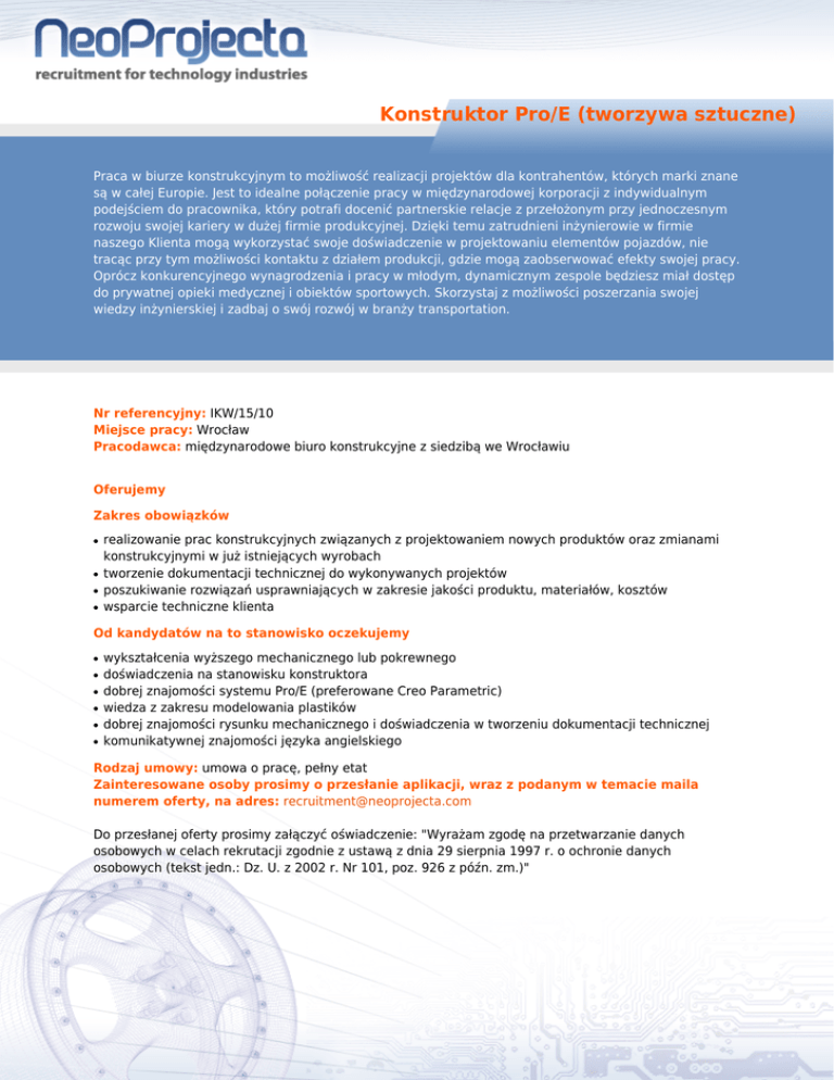 Konstruktor Pro/E (tworzywa sztuczne) Praca w biurze konstrukcyjnym to możliwość realizacji projektów dla kontrahentów, których marki znane są w całej Europie. Jest to idealne połączenie pracy w międzynarodowej korporacji z indywidualnym podejściem do pracownika, który potrafi docenić partnerskie relacje z przełożonym przy jednoczesnym rozwoju swojej kariery w dużej firmie produkcyjnej. Dzięki temu zatrudnieni inżynierowie w firmie naszego Klienta mogą wykorzystać swoje doświadczenie w projektowaniu elementów pojazdów, nie tracąc przy tym możliwości kontaktu z działem produkcji, gdzie mogą zaobserwować efekty swojej pracy. Oprócz konkurencyjnego wynagrodzenia i pracy w młodym, dynamicznym zespole będziesz miał dostęp do prywatnej opieki medycznej i obiektów sportowych. Skorzystaj z możliwości poszerzania swojej wiedzy inżynierskiej i zadbaj o swój rozwój w branży transportation. Nr referencyjny: IKW/15/10 Miejsce pracy: Wrocław Pracodawca: międzynarodowe biuro konstrukcyjne z siedzibą we Wrocławiu Oferujemy Zakres obowiązków ● ● ● ● realizowanie prac konstrukcyjnych związanych z projektowaniem nowych produktów oraz zmianami konstrukcyjnymi w już istniejących wyrobach tworzenie dokumentacji technicznej do wykonywanych projektów poszukiwanie rozwiązań usprawniających w zakresie jakości produktu, materiałów, kosztów wsparcie techniczne klienta Od kandydatów na to stanowisko oczekujemy ● ● ● ● ● ● wykształcenia wyższego mechanicznego lub pokrewnego doświadczenia na stanowisku konstruktora dobrej znajomości systemu Pro/E (preferowane Creo Parametric) wiedza z zakresu modelowania plastików dobrej znajomości rysunku mechanicznego i doświadczenia w tworzeniu dokumentacji technicznej komunikatywnej znajomości języka angielskiego Rodzaj umowy: umowa o pracę, pełny etat Zainteresowane osoby prosimy o przesłanie aplikacji, wraz z podanym w temacie maila numerem oferty, na adres: [email protected] Do przesłanej oferty prosimy załączyć oświadczenie: "Wyrażam zgodę na przetwarzanie danych osobowych w celach rekrutacji zgodnie z ustawą z dnia 29 sierpnia 1997 r. o ochronie danych osobowych (tekst jedn.: Dz. U. z 2002 r. Nr 101, poz. 926 z późn. zm.)"