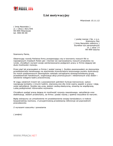 List motywacyjny Milanówek 15.11.12 ( Imię Nazwisko ) ul. ( Ulica ) 821/345 99-999 Milanówek tel. 999-99-99 ( podaj nazwę ) Sp. z o.o. Szanowny Pan ( Imię Nazwisko odbiorcy ) Dyrektor d/s personalnych ul. ( ulica ) 5 99-999 Gdynia Szanowny Panie, Obserwując rozwój Państwa firmy przejawiający się w tworzeniu nowych filii w największych miastach Polski jak i również we wprowadzaniu nowych produktów na rynek, chciałbym wyrazić swoje zainteresowanie podjęciem pracy w firmie dającej tak duże możliwości rozwoju. Przez pięć lat pracowałem w firmie ( podać nazwę ). Szybko awansowałem ze stanowiska przedstawiciela handlowego na stanowisko Koordynatora terenowego punktu dystrybucji. Do moich podstawowych obowiązków należało zarządzanie dziesięcioosobową grupą przedstawicieli handlowych, organizacja akcji promocyjnych i reklamowych oraz dobór i szkolenie wstępne kadry pracowniczej. W ciągu ostatnich trzech lat z powodzeniem pełniłem funkcje kierownicze. Łatwo nawiązuję kontakty z innymi ludźmi, stanowią one dla mnie ważny aspekt w pracy i dają wiele satysfakcji. Szybko się uczę, jestem osobą elastyczną, otwartą na współpracę. Lubię podejmować różnorodne wyzwania. Chciałbym podjąć pracę dającą mi możliwość rozwoju zawodowego, satysfakcje oraz stabilizację. Jestem przekonany, że firma ( podać nazwę ) spełnia wszystkie te warunki. Będę wdzięczny za umożliwienie mi przedstawienia swojej kandydatury w trakcie bezpośredniej rozmowy. Z przyjemnością przedstawię referencje od poprzednich pracodawców. Z wyrazami szacunku i poważania ( podpis) WWW.PRACA.NET