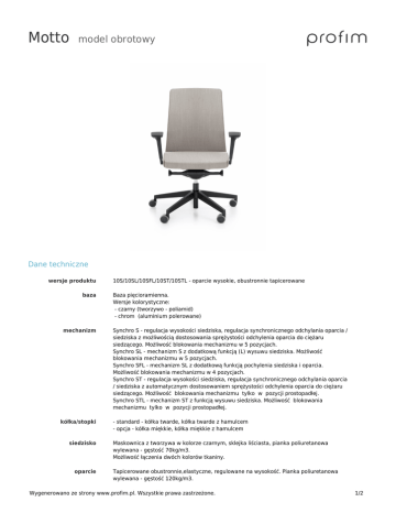 Motto model obrotowy Dane techniczne wersje produktu baza mechanizm kółka/stopki siedzisko oparcie 10S/10SL/10SFL/10ST/10STL - oparcie wysokie, obustronnie tapicerowane Baza pięcioramienna. Wersje kolorystyczne: - czarny (tworzywo - poliamid) - chrom (aluminium polerowane) Synchro S - regulacja wysokości siedziska, regulacja synchronicznego odchylania oparcia / siedziska z możliwością dostosowania sprężystości odchylenia oparcia do ciężaru siedzącego. Możliwość blokowania mechanizmu w 5 pozycjach. Synchro SL - mechanizm S z dodatkową funkcją (L) wysuwu siedziska. Możliwość blokowania mechanizmu w 5 pozycjach. Synchro SFL - mechanizm SL z dodatkową funkcją pochylenia siedziska i oparcia. Możliwość blokowania mechanizmu w 4 pozycjach. Synchro ST - regulacja wysokości siedziska, regulacja synchronicznego odchylania oparcia / siedziska z automatycznym dostosowaniem sprężystości odchylenia oparcia do ciężaru siedzącego. Możliwość blokowania mechanizmu tylko w pozycji prostopadłej. Synchro STL - mechanizm ST z funkcją wysuwu siedziska. Możliwość blokowania mechanizmu tylko w pozycji prostopadłej. - standard - kółka twarde, kółka twarde z hamulcem - opcja - kółka miękkie, kółka miękkie z hamulcem Maskownica z tworzywa w kolorze czarnym, sklejka liściasta, pianka poliuretanowa wylewana - gęstość 70kg/m3. Możliwość łączenia dwóch kolorów tkaniny. Tapicerowane obustronnie,elastyczne, regulowane na wysokość. Pianka poliuretanowa wylewana - gęstość 120kg/m3. Wygenerowano ze strony www.profim.pl. Wszystkie prawa zastrzeżone. 1/2 Możliwość łączenia dwóch kolorów tkaniny. podłokietniki P60PU - Podłokietnik stały, nakładka poliuretanowa. P61PU - Podłokietnik regulowany góra-dół (zakres regulacji 80 mm), nakładka poliuretanowa. P59PU - Podłokietnik regulowany góra-dół (80 mm), nakładka przód-tył (+/- 50 mm), nakładka regulowana na boki (+/- 30 mm). Kolor stelaża podłokietnika: czarny. waga netto 10S/10SL/10SFL – 18,5 kg 10ST/10STL – 18,0 kg waga brutto 10S/10SL/10SFL – 12,5 kg 10ST/10STL – 12,0 kg Wymiary Wygenerowano ze strony www.profim.pl. Wszystkie prawa zastrzeżone. 2/2