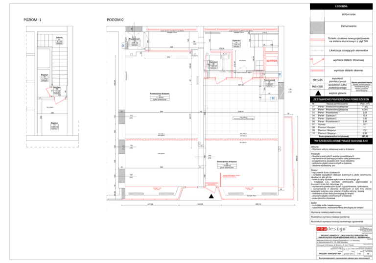 LEGENDA Wyburzenia POZIOM -1 POZIOM 0 45 Zamurowania wnęka okienna wys.85cm x szer.597cm hparapet 250cm 20 218,2 90 210 Zaplecze1 04 13,4 m2 lastryko 424 Ścianki działowe nowoprojektowane na stelażu aluminiowym z płyt G/K 102 145 160 140 130 210 15 55 Likwidacja istniejących elementów 374 HP=393cm 41 SE wymiana stolarki okiennej HP=285 Przedsionek2 06 2,95 m2 lastryko 67 430,26 597,38 Hsk=368 194 10 135 210 90 70 Korytarz 08 1,1 m2 lastryko 123 wymiana stolarki drzwiowej SERWER 212,39 177,26 159,99 Zaplecze2 05 1,82 m2 lastryko wys. ścianki działowej 268cm Magazyn 09 2,2 m2 lastryko 105 175,36 186,54 Przedsionek1 03 2,08 m2 lastryko 33 SE Schody 07 6,7 m2 lastryko demontaż skrzynki elektrycznej wnęka okienna wys.85cm x szer.400cm hparapet 250cm 149 Powierzchnia sklepowa 01 71,85 m2 plytki ceramiczne BE 43 Nr. 01 02 03 04 05 06 07 08 09 10 70 Hsk=368cm - likwidacja sufitu podwieszanego 128 Magazyn 10 6,95 m2 lastryko HP=378cm HP=389cm HP=378cm HP=389cm 110 210 110 Pow. [m2] 71,85 54,04 2,08 13,4 1,82 2,95 6,7 1,1 2,2 6,95 293,95 Nazwa pomieszczenia Parter - Powierzchnia sklepowa Parter - Powierzchnia sklepowa Parter - Przedsionek 1 Parter - Zaplecze 1 Parter - Zaplecze 2 Parter - Przedsionek 2 Schody Piwnica - Korytarz Piwnica - Magazyn Piwnica - Magazyn Suma powierzchni użytkowej WYSZCZEGÓLNIONE PRACE BUDOWLANE HP=285cm Witryna: - Wymiana witryny sklepowej wraz z drzwiami 51 584 Powierzchnia sklepowa 02 54,04 m2 plytki ceramiczne 51 169 109 210 140 210 669,59 125 140 HP=285cm nowoprojektowana ścianka działowa przeszklona Kurtyna powietrzna nad drzwiam 42 109 Numer pomieszczenia Powierzchnia [m2] Rodzaj posadzki demontowanej ZESTAWIENIE POWIERZCHNI POMIESZCZEŃ 596,85 552 113 210 113 292 584 507,77 51 Nazwa pomieszczenia wejście główne HP=238cm 238 wysokość pomieszczenia wysokość sufitu podwieszanego Parapet - stół h= 75cm 85,49 Parapet - stół h= 75cm 45 hparapet 74cm 457,29 340,28 585,18 Posadzki: - likwidacja wszystkich warstw posadzkowych - wyrównanie do jednego poziomu calej powierzchni - przygotowanie posadzki pod nowe okładziny - układanie płytek ceramicznych w toalecie, - ułozenie wykładziny pvc Ściany: - wyburzenie ścian działowych - zerwanie wszystkich okładzin ściennych tj płytki ceramiczne, obudowy z płyt g/k itp. - nowe ściany działowe wykonane w technologii g/k - instalacjie c.o., wod-kan, elektryczne, poprowadzić w bruzdach ścian lub zabudowa g/k - wyrównanie powierzchni ścian, szpachlowanie, tynkowanie, - zamurowanie 5 otworów drzwiowych w tym trzy otwory wewnątrz budynku oraz przerwy między witryną i ścianą - malowanie ścian farbą emulsyjną do wnętrz - układanie płytek ceramicznych w toalecie - nowa stolarka drzwiowa Sufity: - rozbiórka sufitu kasetonowego - szpachlowanie, malowanie farbą emulsyjną do wnętrz Wymiana instalacji elektrycznej Rozbiórka i wymiana instalacji sanitarnej Rozbiórka i wymiana instalacji centralnego ogrzewania JEDNOSTKA ODPOWIEDZIALNA ZA OPRACOWANIE REA Design sp. z o.o. ul.Ogrodowa 5a, 55-093 Kiełczów tel. 501 874787, 501 87 4747 [email protected] TEMAT OPRACOWANIA PROJEKT ARANŻACJI LOKALU NA CELE BIBLIOTECZNE ZNAJDUJĄCEGO SIĘ W WARSZAWIE PRZY UL. BROWARNEJ 4 INWESTOR Biblioteka Publiczna w Dzielnicy Śródmieście m. st. Warszawy, ul. Marszałkowska 9/15, 00 - 626 Warszawa ADRES INWESTYCJI Warszawa Śródmieście, ul. Browarna 4, rejon Powiśle PROJEKTANT WNĘTRZ PROJEKTANT ARCHITEKTURY AGNIESZKA OPIELA mgr inż. arch. ANNA JAWOROWSKA-SWARBUŁA upr. nr 175/00/DUW STADIUM PROJEKT KONCEPCYJNY DATA grudzień 2013 SKALA 1:50 NR. RYSUNKU 02 NAZWA RYSUNKU Rzut pomieszczeń z zaznaczeniem zakresu prac remontowych