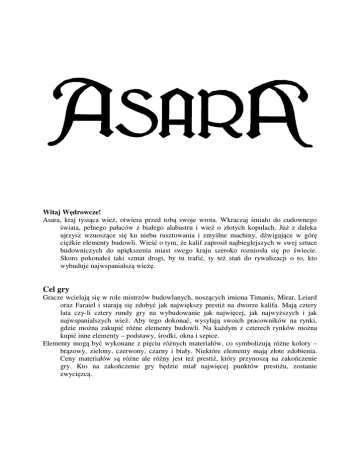Witaj Wędrowcze! Asara, kraj tysiąca wież, otwiera przed tobą swoje wrota. Wkraczaj śmiało do cudownego świata, pełnego pałaców z białego alabastru i wież o złotych kopułach. Już z daleka ujrzysz wznoszące się ku niebu rusztowania i zmyślne machiny, dźwigające w górę ciężkie elementy budowli. Wieść o tym, że kalif zaprosił najbieglejszych w swej sztuce budowniczych do upiększenia miast swego kraju szeroko rozniosła się po świecie. Skoro pokonałeś taki szmat drogi, by tu trafić, ty też stań do rywalizacji o to, kto wybuduje najwspanialszą wieżę. Cel gry Gracze wcielają się w role mistrzów budowlanych, noszących imiona Timanis, Mirar, Leiard oraz Faraiel i starają się zdobyć jak największy prestiż na dworze kalifa. Mają cztery lata czy-li cztery rundy gry na wybudowanie jak najwięcej, jak najwyższych i jak najwspanialszych wież. Aby tego dokonać, wysyłają swoich pracowników na rynki, gdzie można zakupić różne elementy budowli. Na każdym z czterech rynków można kupić inne elementy – podstawy, środki, okna i szpice. Elementy mogą być wykonane z pięciu różnych materiałów, co symbolizują różne kolory – brązowy, zielony, czerwony, czarny i biały. Niektóre elementy mają złote zdobienia. Ceny materiałów są różne ale różny jest też prestiż, który przynoszą na zakończenie gry. Kto na zakończenie gry będzie miał najwięcej punktów prestiżu, zostanie zwycięzcą. Przygotowanie gry Elementy gry należy rozłożyć według schematu, pokazanego na dużej kwadratowej kartce. Przy pierwszej rozgrywce autorzy polecają wybranie podstawowego wariantu gry. 1. Najpierw należy złożyć 5 kwadratowych elementów w formie krzyża tak, aby tor punktacji przebiegał od 0 do 100. W rogach należy umieścić 4 trójkątne elementy. Jeżeli rozgrywany jest wariant podstawowy, trójkąty ze studniami układa się studniami do góry, a dwa pozostałe trójkąty budynkami do góry. 2. Płytki z elementami wież należy posortować według rodzajów (20 podstaw, 20 elementów środkowych, 25 okien, 20 szpiców). 15 elementów ze świecącymi oknami (oznaczonych na odwrocie kolorem czerwonym) należy przy rozgrywaniu podstawowej wersji gry odłożyć do pudełka. Każdy rodzaj należy osobno potasować i położyć obrazkami do dołu w formie stosu na odpowiednich polach planszy (na środkach bocznych kwadratów). 3. Z wierzchu każdego stosu należy wziąć i wyłożyć na planszę tyle płytek, ile jest miejsc na planszy (7 lub 8). Wyłożone płytki stanowią aktualną ofertę rynku poszczególnych części wież. 4. Każdy gracz wybiera kolor i stawia swój znacznik na polu 0 toru punktacji. 5. Znacznik Roku ustawia się na polu z cyfrą 1 na jednym z trójkątów planszy. 6. Każdy gracz bierze jeden trzyczęściowy parawan w swoim kolorze. 52 monety (25x1, 16x5, 11x10) należy posortować według wartości. Gracz, który ostatnio wspinał się na wieżę, zostaje rozpoczynającym. Otrzymuje on monety o wartości 20 Asari i znacznik Łaski Kalifa. Każdy następny gracz otrzymuje o jeden Asari więcej (a więc 21, 22 względnie 23). Gracze trzymają monety za parawanami. 7. Karty w 5 kolorach oznaczają pracowników. Karty należy potasować i rozdać graczom: - przy 2 graczach po 9 - przy 3 graczach po 8 - przy 4 graczach po 7 Karty należy trzymać tak, by nie widzieli ich inni gracze. 8. Przy grze w wariancie zaawansowanym, trójkąty ze studniami należy obrócić obrazkami do góry. Płytki ze świecącymi oknami należy potasować i położyć w formie stosu na odpowiednim polu na jednym z trójkątnych elementów planszy. Przebieg gry Ruch każdego gracza składa się z dwóch czynności: 1. Wysłanie pracownika (zagranie karty) 2. Wykonanie akcji (np. zakup elementu wieży) Gdy gracz wykona obie te czynności, kolejka przechodzi na sąsiada z lewej. 1. Wysyłanie pracowników Gracz, na którego przypada kolejka, kładzie jedną ze swoich kart obrazkiem do góry na wybranym pustym polu planszy. Obowiązują przy tym następujące zasady: • Jeżeli na danym obszarze nie ma jeszcze żadnej karty, można położyć kartę dowolnego koloru. • Jeżeli na danym obszarze jest już jedna lub więcej kart, gracz musi położyć kartę takiego samego koloru, jak został położony wcześniej. • Jeżeli gracz chce położyć kartę na jakimś obszarze, a nie ma (lub nie chce zagrać) karty w kolorze, który został wcześniej na tym obszarze umieszczony, może położyć dwie dowolne karty obrazkami do dołu na jednym polu tego obszaru. Obowiązek dokładania kart w tym samym kolorze dotyczy wszystkich obszarów planszy (a więc rynków poszczególnych elementów, banku, koła budowy itd.) Przykład 1 (rysunek na stronie 2 u góry) Tina ma 6 kart na ręce. Chce kupić środkowy element wieży. Ponieważ na tym obszarze nie ma jeszcze żadnej karty, może na jednym z czterech pól tego obszaru dowolną kartę. Przykład 2 (rysunek na stronie 2 w środku) Wolfgang chciałby również kupić środkowy element wieży. Ponieważ Tina położyła na jednym z pól tego obszaru niebieską kartę, a Wolfgang nie ma karty tego koloru, musi położyć na jednym z pól tego obszaru dwie karty dowolnego koloru, obrazkami do dołu. 2. Wykonanie akcji W zależności od tego, jaki obszar gracz wybrał, gracz może wykonać jedną z pięciu akcji. • Zakup elementu wieży Są cztery obszary-rynki, na których można kupić różne elementy wieży (podstawy, elementy środkowe, okna, szpice). Jeżeli gracz zdecyduje się na wykonanie takiej akcji, może kupić jedną z wyłożonych płytek. Zakupioną płytkę chowa za swoim parawanem. Za zakupioną płytkę gracz płaci w zależności od jej koloru. Wszystkie płytki tego samego koloru kosztują tyle samo, niezależnie od tego, czy jest to podstawa, element środkowy, okno czy szpic oraz niezależnie od tego, czy płytka ma złoty symbol. Ceny poszczególnych kolorów są podane