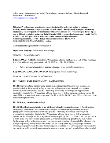 Adres strony internetowej, na której Zamawiający udostępnia Specyfikację Istotnych Warunków Zamówienia: www.szpitalwincentego.pl Gdynia: Przedmiotem niniejszego zamówienia jest świadczenie usług w zakresie wykonywania okresowych przeglądów technicznych i konserwacji sprzętu i aparatury medycznej stanowiących wyposażenie oddziałów Szpitala Św. Wincentego a Paulo Sp. z o.o. w Gdyni zgodnie z ustawą z dnia 20 maja 2010 r. o wyrobach medycznych (tj. Dz. U. z 2010 r. Nr 107, poz. 679. z późn. zm.) oraz zaleceniami producenta. Numer ogłoszenia: 243740 - 2013; data zamieszczenia: 25.06.2013 OGŁOSZENIE O ZAMÓWIENIU - usługi Zamieszczanie ogłoszenia: obowiązkowe. Ogłoszenie dotyczy: zamówienia publicznego. SEKCJA I: ZAMAWIAJĄCY I. 1) NAZWA I ADRES: Szpital Św. Wincentego a Paulo Spółka z o.o. , ul. Wójta Radtkego 1, 81-348 Gdynia, woj. pomorskie, tel. 58 6207501, faks 58 6201114. Adres strony internetowej zamawiającego: www.szpitalwincentego.pl I. 2) RODZAJ ZAMAWIAJĄCEGO: Inny: spółka prawa handlowego. SEKCJA II: PRZEDMIOT ZAMÓWIENIA II.1) OKREŚLENIE PRZEDMIOTU ZAMÓWIENIA II.1.1) Nazwa nadana zamówieniu przez zamawiającego: Przedmiotem niniejszego zamówienia jest świadczenie usług w zakresie wykonywania okresowych przeglądów technicznych i konserwacji sprzętu i aparatury medycznej stanowiących wyposażenie oddziałów Szpitala Św. Wincentego a Paulo Sp. z o.o. w Gdyni zgodnie z ustawą z dnia 20 maja 2010 r. o wyrobach medycznych (tj. Dz. U. z 2010 r. Nr 107, poz. 679. z późn. zm.) oraz zaleceniami producenta.. II.1.2) Rodzaj zamówienia: usługi. II.1.4) Określenie przedmiotu oraz wielkości lub zakresu zamówienia: 1. Przedmiotem niniejszego zamówienia jest świadczenie usług w zakresie wykonywania okresowych przeglądów technicznych i konserwacji sprzętu i aparatury medycznej stanowiących wyposażenie oddziałów Szpitala Św. Wincentego a Paulo Sp. z o.o. w Gdyni zgodnie z ustawą z dnia 20 maja 2010 r. o wyrobach medycznych (tj. Dz. U. z 2010 r. Nr 107, poz. 679. z późn. zm.) oraz zaleceniami producenta. 2.W ramach realizacji przedmiotu zamówienia Wykonawca będzie zobowiązany do: 1) wykonywania regularnych przeglądów okresowych sprzętu i aparatury medycznej - interwały i zakres przeglądów wg wymagań producenta, terminy przeglądów uzgodnione z Zamawiającym w zakresie: a) sprawdzenia bezpieczeństwa mechanicznego b) kontroli występowania usterek zewnętrznych c) inspekcji zużycia części d) oczyszczenia dróg chłodzenia i odprowadzenia ciepła e) smarowania ruchomych części mechanicznych f) sprawdzenia bezpieczeństwa elektrycznego g) konserwacji softwareu systemowego i aplikacyjnego h) porządkowania przestrzeni dyskowej i bazy danych i) sprawdzenia funkcjonowania urządzenia i jego gotowości do pracy j) dokumentacji przeglądów k) dostawy materiałów niezbędnych do przeprowadzenia przeglądów l) kalibracji - jeżeli przepisy szczególe tego wymagają m) wymiany zestawów serwisowych (części objętych przeglądem rocznym) 2) przeprowadzania kontroli jakości urządzeń medycznych podczas przeglądów okresowych: a) sprawdzenia jakości obrazu b) sprawdzenia wartości pomiarowych i aplikacyjnych aparatury c) ustawienia i regulacji odpowiednich wartości nastawień w przypadkach ich odchylenia od wartości optymalnych 3) dokonywania modyfikacji - wdrożenia środków zapobiegawczych w celu zwiększenia bezpieczeństwa pracy urządzenia, po uprzedniej konsultacji modyfikacji z Zamawiającym. 4) Dostosowanie oprogramowania do sprzętu znajdującego się na oddziałach szpitala - po uprzedniej konsultacji z Zamawiającym 5) W przypadku, jeśli zaistnieje konieczność wykonywania usług stanowiących przedmiot zamówienia w siedzibie Wykonawcy, poinformowanie Zamawiającego o takiej sytuacji oraz dostarczenia na czas przeglądu sprzętu zastępczego o takich samych lub równorzędnych parametrach technicznych, kompatybilnego z posiadanymi przez Zamawiającego urządzeniami.. II.1.6) Wspólny Słownik Zamówień (CPV): 50.42.00.00-5, 50.42.12.00-4, 50.80.00.00-3. II.1.7) Czy dopuszcza się złożenie oferty częściowej: tak, liczba części: 129. II.1.8) Czy dopuszcza się złożenie oferty wariantowej: nie. II.2) CZAS TRWANIA ZAMÓWIENIA LUB TERMIN WYKONANIA: Okres w miesiącach: 12. SEKCJA III: INFORMACJE O CHARAKTERZE PRAWNYM, EKONOMICZNYM, FINANSOWYM I TECHNICZNYM III.1) WADIUM Informacja na temat wadium: Zamawiający nie wymaga zabezpieczenia oferty wadium III.2) ZALICZKI III.3) WARUNKI UDZIAŁU W POSTĘPOWANIU ORAZ OPIS SPOSOBU DOKONYWANIA OCENY SPEŁNIANIA TYCH WARUNKÓW III.3.5) Sytuacja ekonomiczna i finansowa Opis sposobu dokonywania oceny spełniania tego warunku o Warunek będzie spełniony jeżeli wykonawca wykaże, że posiada ubezpieczenie od odpowiedzialności cywilnej w zakresie prowadzonej działalności związanej z przedmiotem zamówienia na sumę ubezpieczenia nie niższą niż 100.000,00 zł (słownie: sto tysięcy złotych 00/100); III.4) INFORMACJA O OŚWIADCZENIACH LUB DOKUMENTACH, JAKIE MAJĄ DOSTARCZYĆ WYKONAWCY W CELU POTWIERDZENIA SPEŁNIANIA WARUNKÓW UDZIAŁU W POSTĘPOWANIU ORAZ NIEPODLEGANIA WYKLUCZENIU NA PODSTAWIE ART. 24 UST. 1 USTAWY III.4.1) W zakresie wykazania spełniania przez wykonawcę warunków, o których mowa w art. 22 ust. 1 ustawy, oprócz oświadczenia o spełnianiu warunków udziału w postępowaniu należy przedłożyć: opłaconą polisę, a w przypadku jej braku, inny dokument potwierdzający, że wykonawca jest ubezpieczony od odpowiedzialności cywilnej w zakresie prowadzonej działalności związanej z przedmiotem zamówienia. Wykonawca powołujący się przy wykazywaniu spełnienia warunków udziału w postępowaniu, o których mowa w art. 22 ust. 1 pkt 4 ustawy, na zasoby innych podmiotów przedkłada następujące dokumenty dotyczące podmiotów, zasobami których będzie dysponował wykonawca: opłaconą polisę, a w przypadku jej braku, inny dokument p