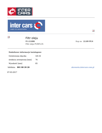 Filtr oleju Kup za: 22.89 PLN PX LS188B Filtr oleju PURFLUX Dodatkowe informacje katalogowe Gwintowana złączka 3/4-16 średnica zewnętrzna [mm] 76 Wysokość [mm] 85 Infolinia: 801 80 20 20 07-03-2017 akcesoria.intercars.com.pl
