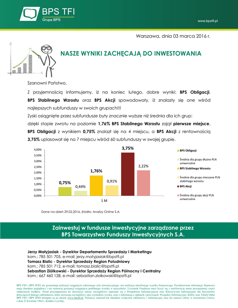 Warszawa, dnia 03 marca 2016 r. NASZE WYNIKI ZACHĘCAJĄ DO INWESTOWANIA Szanowni Państwo, Z przyjemnością informujemy, iż na koniec lutego, dobre wyniki: BPS Obligacji, BPS Stabilnego Wzrostu oraz BPS Akcji spowodowały, iż znalazły się one wśród najlepszych subfunduszy w swoich grupach!!! Zyski osiągnięte przez subfundusze były znacznie wyższe niż średnia dla ich grup: dzięki stopie zwrotu na poziomie 1,76% BPS Stabilnego Wzrostu zajął pierwsze miejsce, BPS Obligacji z wynikiem 0,75% znalazł się na 4 miejscu, a BPS Akcji z rentownością 3,75% uplasował się na 7 miejscu wśród 60 subfunduszy w swojej grupie. 3,75% 4,00% BPS Obligacji 3,50% 3,00% 2,22% 2,50% 1,76% 2,00% 1,50% 1,00% 0,50% 0,75% 0,91% 0,44% Średnia dla grupy dłużne PLN uniwersalne BPS Stabilnego Wzrostu Średnia dla grupy mieszane PLN stabilnego wzrostu BPS Akcji 0,00% 1M Średnia dla grupy akcji PLN uniwersalne Dane na dzień 29.02.2016, źródło: Analizy Online S.A. Zainwestuj w fundusze inwestycyjne zarządzane przez BPS Towarzystwo Funduszy Inwestycyjnych S.A. Jerzy Matyjasiak - Dyrektor Departamentu Sprzedaży i Marketingu kom.: 785 501 705, e-mail: [email protected] Tomasz Bialic - Dyrektor Sprzedaży Region Południowy kom.: 785 501 712, e-mail: [email protected] Sebastian Ziółkowski - Dyrektor Sprzedaży Region Północny i Centralny kom.: 667 460 128, e-mail: [email protected] BPS FIO i BPS SFIO nie gwarantują realizacji osiągnięcia założonego celu inwestycyjnego, ani realizacji określonego wyniku finansowego. Przedstawione informacje finansowe mają charakter poglądowy i nie stanowią gwarancji osiągnięcia podobnego wyniku w przyszłości. Uczestnik Funduszu musi liczyć się z możliwością utraty przynajmniej części wpłaconych środków. Przed przystąpieniem do inwestycji należy szczegółowo zapoznać się z Prospektem Informacyjnym oraz Kluczowymi Informacjami dla Inwestorów dotyczących danego subfunduszu, które zawierają szczegółowy opis czynników ryzyka, oraz z informacją o opłatach i prowizjach. Prospekty Informacyjne, KIIDy oraz Tabele Opłat BPS FIO i BPS SFIO dostępne są na stronie www.bpstfi.pl. Niniejszy materiał ma charakter wyłącznie reklamowy i informacyjny oraz nie stanowi oferty w rozumieniu Ustawy z dnia 23 kwietnia 1964 r. Kodeks Cywilny.