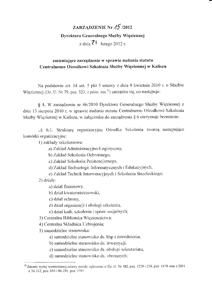 ZARZĄDZENIE Nr / j 5 /2012 Dyrektora Generalnego Służby Więziennej z dnia'?' lutego 2012 r. zmieniające zarządzenie w sprawie nadania statutu Centralnemu Ośrodkowi Szkolenia Służby Więziennej w Kaliszu Na podstawie art. 14 ust. 5 pkt 3 ustawy z dnia 9 kwietnia 2010 r. o Służbie Więziennej (Dz. U. Nr 79, poz. 523, z późn. zra. l) ) zarządza się, co następuje: § 1. W zarządzeniu nr 46/2010 Dyrektora Generalnego Służby Więziennej z dnia 13 sierpnia 2010 r. w sprawie nadania statutu Centralnemu Ośrodkowi Szkolenia Służby Więziennej w Kaliszu, w załączniku do zarządzenia § 6 otrzymuje brzmienie: ,.§ 6.1. Strukturę organizacyjną Ośrodka Szkolenia tworzą następujące komórki organizacyjne: 1) zakłady szkoleniowe: a) Zakład Administracyjno-Logistyczny, b) Zakład Szkolenia Ochronnego, c) Zakład Szkolenia Penitencjarnego, d) Zakład Technologii Informatycznych i Edukacyjnych, e) Zakład Technik Interwencyjnych i Szkolenia Strzeleckiego; 2) działy: a) dział finansowy, b) dział kwatermistrzowski, c) dział ochrony, d) dział organizacji i obsługi szkolenia, e) dział kadr, szkolenia i spraw socjalnych; 3) Centralna Biblioteka Więziennictwa; 4) Centralna Składnica Uzbrojenia; 5) samodzielne stanowiska: a) samodzielne stanowisko ds. bhp i zatrudnienia, b) samodzielne stanowisko ds. inwestycji, c) samodzielne stanowisko ds. obsługi sekretariatu, d) samodzielne stanowisko ds. obronnych; 0 Zmiany wyżej wymienionej ustawy zostały ogłoszone w Dz. U. Nr 182, poz. 1228 i 238, poz. 1578 oraz z 2011 r. Nr 112, poz. 654 i Nr 291, poz. 1707. 6) pełnomocnik do spraw ochrony informacji niejawnych; 7) radca prawny. 2. Powołanie innej, niż wymieniona w ust. 1, komórki organizacyjnej może nastąpić za zgodą Dyrektora Generalnego Służby Więziennej, na pisemny wniosek komendanta Ośrodka Szkolenia. 3. Komendant Ośrodka Szkolenia może powoływać nieetatowe zespoły celem prowadzenia prac naukowo-badawczych w zakresie efektywności szkolenia oraz problemów penitencjarnych wymagających diagnozy i oceny lub inne celowe zespoły. 4. Zespoły, o których mowa w ust. 3, mogą prowadzić swoją działalność w porozumieniu z merytorycznymi komórkami organizacyjnymi Centralnego Zarządu S łużby Wi ęzi en n ej. 5. Ośrodek Szkolenia może także, na podstawie zawieranych umów, współdziałać w zakresie realizacji prac, o których mowa w ust. 1 i 3, z placówkami naukowymi. 1 '§ 2. Zarządzenie wchodzi w życie z dniem 1 marca 2012 r. A f ^ t c^-J n •mtffi H A* DYREK C I TT SŁU GENERALNY ENNEJ todarski