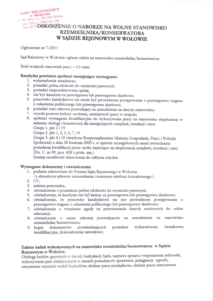 RZE.NAWOLNE STANOWISKO RZEMIESrxxn / KoNsERv/ATo RA w s4DzrEREJONOWYM WWOLOVTE Ogloszeniew7 /2011 S4d Reionowy w Wolowie ogLaszanab6r na stanowisko rzemie5lnika/konserwatora Ilo66 wolnych stanowisk pracy - 0,5 eatu Ibndydat powinien spetnia6 nastgpui4ce wymagania: 1. wyksztalcetie zasadticze; posiadai peln4 zdolnoS6 do czynnodci prawnych; ?. 3. posiada6 nieposzlakowan4 opinig, 4. nie by6 karanym z ptzestepstszalub pzest€pstwa skarbowe; 5. przeciwko kandydatowi nie mo2e by6 prowadzone post€powanie o przest€pstwo Scigane z oskadenia publicznego lub przestgpstwa skarbowe, 6' posiadad stan zdrowiaponvalajecy na zatrudnienie na danym sanowisku; 7. wysoki poziom kultury osobistej, umiejgtno66 pracy w zespole; 8. spelniad urymagania hvalifikacyine do wykonywania pniy n^ stanowisku eksploatacji w zaktesie obslugi i konserwacji dla nastgpuf4cych vrz4dzei,instalacji i sieci: Grupa 1. pkt 2 i 19 G r u p a2 . p k t 7 , 2 , 5 , 6 , 7 , 7 0 Gnrpa 3. pkt 6 i 10 okre6lone Rozpotz4dzetiemMinistra Gospodarki, Pracy i Polityki Spolecznej z dnia 28 kwietnia 2003 r. w sprawie szczeg6Nowychzasad strvierdzania posiadania kwalifikacyi przez osoby zajmujqce sig eksploatacj4vrz4dzeri, instalacji i sieci (Dr. U. nr 89, poz. 828 z poln. zm.) Istnieje mo2liwo56 skierowania do odbycia szkoie6. Wymagane dokumenty i oSwiad czeniaz 1. podanie adtesowane do PrezesaS4du Rejonowego w Wolowie /z aknnlnym adresem zarnieszkznizi numerem telefonu kontaktowego/, 2. CV, 3. ankieta personalra, 4. o6wiadczenie o posiadaniu pelnej zdotro6ci do carnno6ci ptawnych; 5. o6wiadczenie, 2e kandydat nie byl karany z pflestepstwa lub pzestepstwa skarbowe; 6. o6wiadczenie, 2e przeciwko kandydatowi nie iest prowadzone postepowanie o przest€pstwo Sciganez oskarienia publicznego lub przestqpstwo skarbowe; 7. o6wiadczenie o wyta2eniu zgody nz pflet.watz rie danych osobowych do cel6w rekrutacii; 8. o6wiadczenie o stanie zdrowia pozwzlzjaqrn na zatrudnienie na stanowisku rzemieSlnika/ konserwatota ; 6wiadectwa posiadane wyksztalcenie, pot'wierdzaia.y"h dokument6w 9. kopie kwdifikacyjne, do6wiad czerie zawodowe; Zalces z dafrwykonywanych na stanowisku rzemieSlnika/konsetwatota w S4dzie S4du,naprawa sPrz€tu i wlposa2enia iednostki, adanych uprawnieri, pielggnacfa ogtodu, ptace porz4dkowe, drobne Prace remontowe' Oferty Pf2cy z zzznaczeniemmrmenr ogloszenia naleLysklada6w Oddziale Administacinym S4du Reionowegow \Wolowie,ul. Mikolaja Reja 11, pok. 22, w terminie do dnia 31 sieqpnia 20llt. do godz. 15.30. Oferty zN.oionepo terminie nie bgda rozpzrftlw^rre. Lista kandydat6w zakwalifikowanych do II etapu postgpowania rekrutacfnego zostanie opublikowaf,^ poprzez umieszczenie na tablicy ogloszerl i na stronie intemetowei S4du: http: / /www.wolow.sr.g ov.pI/