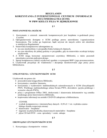 REGULAMIN KORZYSTANIA Z INTERNETOWEGO CENTRUM INFORMACJI MULTIMEDIALNEJ (ICIM) W PBW KIELCE FILIA W JĘDRZEJOWIE §1 POSTANOWIENIA OGÓLNE 1. Korzystanie z czterech stanowisk komputerowych jest bezpłatne w godzinach pracy Czytelni. 2. Oprogramowanie dostępne w ICIM podlega prawu autorskiemu i ograniczeniom licencyjnym. Nie wolno go kopiować, bądź używać do innych celów niż określone w niniejszym Regulaminie. 3. Stanowiska komputerowe udostępniane są: na czas nieokreślony w przypadku braku kolejnych chętnych, na czas określony do jednej godziny w przypadku, gdy na stanowisko oczekuje kolejny użytkownik. 4. Z ICIM mogą korzystać zarejestrowani czytelnicy Biblioteki, a także pozostali mieszkańcy powiatu jędrzejowskiego. 5. Sprzęt komputerowy należy użytkować zgodnie z wymogami BHP i jego przeznaczeniem. 6. Użytkownik przyjmuje do wiadomości i akceptuje monitorowanie jego pracy przez bibliotekarza. §2 UPRAWNIENIA UŻYTKOWNIKÓW ICIM Użytkownik ma prawo do: przeszukiwania księgozbioru Biblioteki, korzystania z zasobów Internetu, korzystania z wydawnictw multimedialnych zainstalowanych w ICIM (Encyklopedii PWN, Wielkiego multimedialnego atlasu Świata PWN, słowników: języka polskiego i wyrazów obcych PWN), pracy z programem Office 2003, drukowania i skanowania dokumentów wg cennika ustalonego przez kierownictwo Biblioteki, kopiowania informacji na nośniki CD/DVD zakupione u bibliotekarza. CENNIK wydruk komputerowy z internetu/bazy danych - 0,50 zł / 1 str. wydruku czarnobiałego (każda rozpoczęta strona) skanowanie – bezpłatne nagranie na płytę/dyskietkę skanowanych materiałów - bezpłatne płyta CD lub DVD – cena sprzedaży = cenie zakupu §3 OBOWIĄZKI UŻYTKOWNIKÓW ICIM 1. Korzystający z komputerów winien: 1 zostawić kartę biblioteczną lub inny dokument tożsamości u dyżurującego bibliotekarza, dokonać rejestracji w zeszycie odwiedzin, posiadać elementarną znajomość obsługi komputera i programu, z którego chce skorzystać - dyżurujący bibliotekarz nie udziela stałej pomocy w obsługiwaniu stanowiska komputerowego i oprogramowania, zgłaszać dyżurnemu bibliotekarzowi uszkodzenie lub nieprawidłowości w pracy komputerów, po zakończeniu pracy pozostawić komputer w niezmienionej konfiguracji. 2. Z jednego stanowiska komputerowego może korzystać tylko jedna osoba. 3. Zabrania się : wykorzystywania komputerów do celów zarobkowych, tworzenia, wyszukiwania i prezentowania materiałów o treści obrażającej uczucia innych, w tym treści pornograficznych, korzystania z wszelkich gier, zabaw komputerowych oraz komunikatorów internetowych i prowadzenia prywatnej korespondencji, zakładania własnych katalogów na dyskach, korzystania z własnych nośników, podłączania przenośnych komputerów do bibliotecznej sieci komputerowej, korzystania z telefonów komórkowych, instalowania innych programów i dokonywania zmian w oprogramowaniu. 4. Ponosi odpowiedzialność finansową za uszkodzenia sprzętu. §4 POSTANOWIENIA KOŃCOWE 1. W przypadku nie przestrzegania Regulaminu bibliotekarz ma prawo do natychmiastowego przerwania korzystania z komputera. 2. Rozstrzyganie spraw nie uregulowanych postanowieniami niniejszego regulaminu leży w kompetencji kierownika Biblioteki. DANE OSOBOWE CZYTELNIKÓW 1. Administratorem danych osobowych czytelników jest Pedagogiczna Biblioteka Wojewódzka w Kielcach, ul. Jana Pawła II 5, 25-025 Kielce. 2. Celem zbierania danych osobowych jest umożliwienie korzystania z usług Biblioteki, w tym: udostępniania materiałów bibliotecznych na miejscu, wypożyczania książek do domu, korzystania z różnych źródeł informacji, umożliwienie dochodzenia należności przewidzianych regulaminem, a także prowadzenie badań czytelniczych i statystycznych. 3. Dane osobowe podlegają ochronie i nie będą wykorzystywane i udostępniane w celach innych niż wymienione wyżej. 4. Czytelnikowi przysługuje prawo wglądu do własnych danych oraz ich poprawiania na warunkach określonych prawem. 5. Dane osobowe podawane są dobrowolnie, co jest niezbędne do nabycia prawa do korzystania z usług Biblioteki. 2 Regulamin obowiązuje od 01.09.2015 r. Podstawa prawna : 1. Statut Pedagogicznej Biblioteki Wojewódzkiej w Kielcach. 2. Ustawa z 27 czerwca 1997 r. o bibliotekach (Dz. U. Nr 85 1997, Nr 106 1998) 3. Ustawa z dn. 29 sierpnia 1997 r. o ochronie danych osobowych (Dz.U. nr 133, poz. 883 ze zm. ) 3