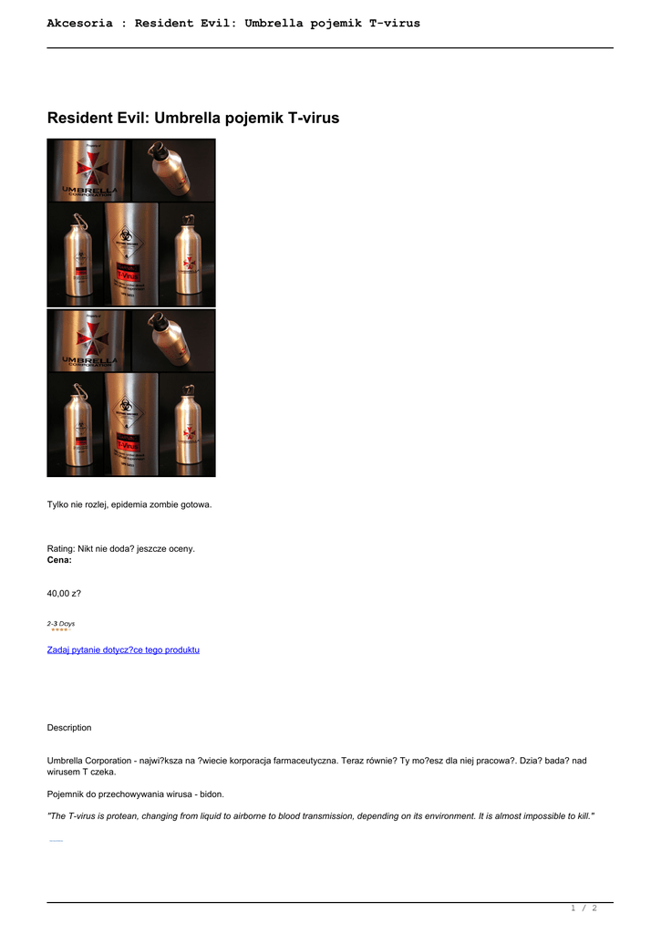 Akcesoria : Resident Evil: Umbrella pojemik T-virus Resident Evil: Umbrella pojemik T-virus Tylko nie rozlej, epidemia zombie gotowa. Rating: Nikt nie doda? jeszcze oceny. Cena: 40,00 z? Zadaj pytanie dotycz?ce tego produktu Description Umbrella Corporation - najwi?ksza na ?wiecie korporacja farmaceutyczna. Teraz równie? Ty mo?esz dla niej pracowa?. Dzia? bada? nad wirusem T czeka. Pojemnik do przechowywania wirusa - bidon. "The T-virus is protean, changing from liquid to airborne to blood transmission, depending on its environment. It is almost impossible to kill." Informacje dodatkowe 1 / 2 Akcesoria : Resident Evil: Umbrella pojemik T-virus ?redni czas dostawy 2-3 dni Dost?pne kolory: jak na zdj?ciu Zwroty i reklamacja Wed?ug regulaminu sklepu Dost?pno?? Na terenie Polski Dost?pne ?rodki p?atno?ci Przedp?ata na konto / p?atno?ci elektroniczne online 2 / 2 Powered by TCPDF (www.tcpdf.org)