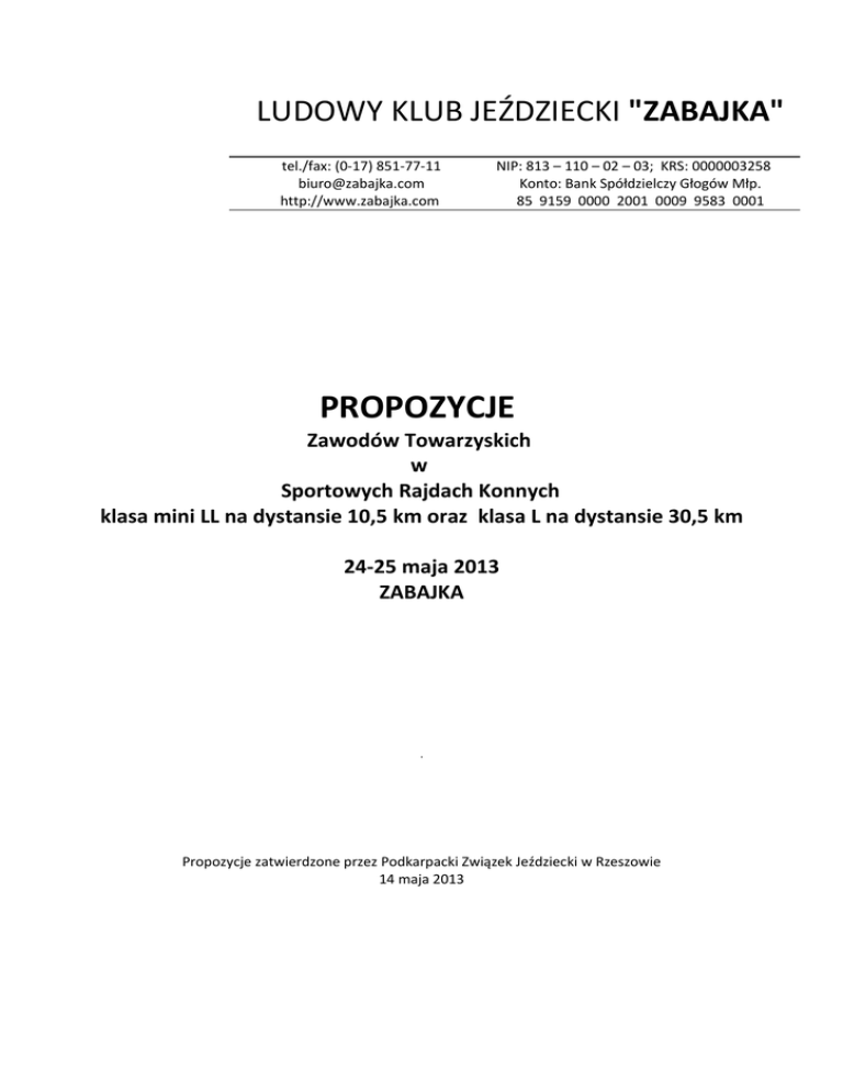 LUDOWY KLUB JEŹDZIECKI "ZABAJKA" tel./fax: (0-17) 851-77-11 [email protected] http://www.zabajka.com NIP: 813 – 110 – 02 – 03; KRS: 0000003258 Konto: Bank Spółdzielczy Głogów Młp. 85 9159 0000 2001 0009 9583 0001 PROPOZYCJE Zawodów Towarzyskich w Sportowych Rajdach Konnych klasa mini LL na dystansie 10,5 km oraz klasa L na dystansie 30,5 km 24-25 maja 2013 ZABAJKA Propozycje zatwierdzone przez Podkarpacki Związek Jeździecki w Rzeszowie 14 maja 2013 INFORMACJE OGÓLNE T ERMIN ZAWODÓW: 24 – 25 maja 2013(piątek-sobota) MIEJSCE ZAWODÓW: Hipodrom LKJ „Zabajka” ORGANIZATOR : Ludowy Klub Jeździecki „Zabajka”, 36-060 Głogów Młp., Zabajka 358 Tel/fax (0-17) 851-77-11, http://www.zabajka.org, [email protected] ODPOWIEDZIALNOŚĆ ORGANIZATORA : OSOBY OFICJALNE: U CZESTNICTWO: Z GŁOSZENIA: Organizatorzy nie ponoszą odpowiedzialności z tytułu wypadków i zachorowań trenerów, zawodników, luzaków i koni, jak również w przypadku kradzieży, zniszczeń, pożarów i innych wydarzeń wynikłych w czasie transportu i trwania zawodów. • • • • Komisja sędziowska: Przewodnicząca – Eulalia Michalik Sędzia WZJ - Agnieszka Kloc Członkowie - Grażyna Kańka - Anna Hadała • • • Komisja Weterynaryjna : Przewodniczący – Jacek Kańka Członkowie - Jacek Sołtyski - Agnieszka Kobos W zawodach amatorskich mogą startować tylko osoby nie zarejestrowane jako zawodnicy w WZJ i PZJ – "wszystkie kategorie wiekowe". Chętni uczestniczą w zawodach na własny koszt i ryzyko. Termin przyjmowania zgłoszeń: do dnia 22 maja 2013 r. Zgłoszenia prosimy nadsyłać na drukach, na fax (0-17) 851-77-11 bądź na e-mail: [email protected]. Tel. komórkowy: 509-827-725 OPŁATY : Patrz punkt I DOKUMENTACJA: Sprawdzanie dokumentów koni i zawodników odbędzie się w biurze zawodów w dniu 24 maja 2013 r. (piątek) od godz. 15.30. LISTY STARTOWE: Dokonanie zmian na listach startowych (po ich wywieszeniu) jest możliwe tylko za zgodą Sędziego Głównego i wniesieniu opłaty (patrz punkt I) - nie dotyczy skreśleń koni z danego konkursu czy też zawodów. NAGRODY FINANSOWE: KLASYFIKACJA OGÓLNA: PROTESTY I SKARGI: • Flots dla 25% startujących w konkursie. Dekoracja zwycięzców odbędzie się 25 maja 2013 o godz. 16.30. Wyłącznie na piśmie z dołączeniem kaucji (podstawa prawna - art. 65 i art. 66 przepisów ogólnych PZJ); wysokość kaucji - patrz punkt I. PROGRAM ZAWODÓW UWAGA: w nadzwyczajnych okolicznościach nieprzewidzianych przepisami, organizator zastrzega sobie prawo do zmian w programie zawodów. UWAGA! DZIEŃ 1, 24 maja 2013 (piątek) Zasady punktacji we wszystkich konkursach wg Regulaminu Sportowych Rajdów Konnych z dnia 24.04.2013. godz. 18.00 PRZEGLĄD WETERYNARYJNY Dla koni, które ukończyły 4 lata i zawodników od 10 roku życia na kucach i od 12 roku życia na dużych koniach Start w grupach 2-3 osobowych lub indywidualnie Dla Koni, które ukończyły 4 lata i zawodników od 12 roku życia. Start indywidualny lub w grupach 2-3 osobowych lub indywidualnie Zakończenie zawodów . godz. 19.30 ZEBRANIE TECHNICZNE DZIEŃ 2, 25 maja 2013 (sobota) godz 8.30 KONKURS nr T-5 kl. LL , NA DYSTANSIE 10,5 km – KLASYFIKACJA INDYWIDUALNA Dystans: 10,5 km Tętno maksymalne: 60 ud./min. Prędkość minimalna: 8 km/godz. Prędkość maksymalna: 14 km/godz. Czas przedstawienia konia do badania na bramce weterynaryjnej: 20 min. Czas przejazdu zamykany na linii mety. Na ostatnich 500 m trasy koń musi poruszać się chodem wyższym, niż stęp pod rygorem eliminacji. Godz. 8.00 KONKURS nr T- 6 kl. L NA DYSTANSIE 30,5 km – KLASYFIKACJA INDYWIDUALNA Dystans: 30,5 km Tętno maksymalne: 60 ud./min. Prędkość minimalna: 10 km/godz. Prędkość maksymalna: 14 km/godz. Czas przedstawienia konia do badania na bramce weterynaryjnej: 20 min.. Czas przejazdu zamykany na linii mety. Na ostatnich 500 m trasy (pętli) koń musi poruszać się chodem wyższym, niż stęp pod rygorem eliminacji. Godz 14.30 SPRAWY ORGANIZACYJNO-TECHNICZNE I NFORMACJE O TRASIE : U BIÓR : WYMAGANA DOKUMENTACJA Pętle o długości 30,5 km i 10,5 km. Trasa bardzo przyjemna, przebiega przez obszary leśne, tereny łąk, drogi polne i gminne, podłoże piaszczyste, trawiaste z korzeniami, możliwość tworzenia kałuż przy opadach deszczu. Teren płaski, różnica wzniesień na pętli do ok. 50 m. Trasy zostały zmodyfikowane, ułatwione, omijają drogi asfaltowe. Przygotowane z myślą o możliwości łatwiejszego zagrywania koni. W czasie rajdu i treningów przed zawodami, zawodnika obowiązuje twarde nakrycie głowy (kask z atestem lub toczek z trzypunktowym mocowaniem) zapięte pod brodą oraz obuwie jeździeckie z obcasami lub strzemiona zamknięte (z koszyczkiem). Zabronione palcaty i ostrogi. • DLA ZAWODNIKÓW I KONI • S CHEMAT SZCZEPIEŃ PRZECIWKO GRYPIE : Konie – paszport PZJ lub Urzędowy z wpisanymi aktualnymi szczepieniami przeciwko grypie koni. Schemat szczepień – niżej. Uczestnicy - badania lekarskie zezwalające na start w zawodach ważne co najmniej na czas trwania zawodów. Dla zawodników niepełnoletnich pisemna zgoda rodziców lub opiekunów prawnych na start w zawodach. Każdy zawodnik musi posiadać ubezpieczenie NNW ważne co najmniej na czas trwania zawodów PRZEGLĄD WETERYNARYJNY : Szczepienia ochronne przeciwko grypie koni. Obowiązuje następujący schemat szczepień: • Szczepienie podstawowe: pierwsze szczepienie – w dniu rozpoczęcia szczepień, drugie szczepienie –pomiędzy 21 i 92 dniem od pierwszego szczepienia, • Szczepienie przypominające: pierwsze szczepienie przypominające w terminie przed upływem 6-ciu miesięcy i 21 dni od drugiego szczepienia podstawowego kolejne szczepienie przypominające dla koni zgłoszonych do zawodów, musi się odbyć przed upływem terminu 6 miesięcy przed dniem przyjazdu na zawody, dopuszczalny jest okres 21 dni przekroczenia terminu żadne szczepienie przypominające nie może się odbywać później niż