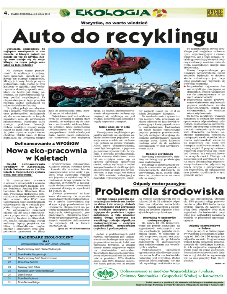 4. PIĄTEK-NIEDZIELA, 6-8 MAJA 2016 Wszystko, co warto wiedzieć Auto do recyklingu Utylizacja samochodu to najlepsze rozwiązanie w momencie, w którym pojazd nie nadaje się już do użytku. Kiedy auto nadaje się do recyklingu, na czym polega oraz jakie są jego rodzaje? Na wstępie warto przypomnieć, że utylizacja to jedyny, poza sprzedażą, sposób na pozbycie się starego samochodu. Minęły już czasy, kiedy po wyrejestrowaniu auta można je było zostawić w ogródku oraz wykorzystać w dowolny sposób. Auto, które nie będzie już dłużej potrzebne, po wyrejestrowaniu należy poddać recyklingowi. Za nieprzestrzeganie tego przepisu możemy zostać pociągnięci do odpowiedzialności karnej. Recykling polega na odzyskaniu z pojazdu wszystkich części oraz podzespołów, nadających się do zamontowania w innych pojazdach albo do powtórnego przetworzenia. Następnie auto zostaje poddane kasacji. Dobrze działające zespoły mogą nawet od razu trafić do sprzedaży, jako używane części samochodowe. Dzięki temu, że firma zajmująca się utylizacją czerpie zysk ze złomowania auta, zarobić może też właściciel. Największa część aut oddawanych do utylizacji to zatem stare pojazdy, nie nadające się do użytku – zardzewiałe, niekompletne, nie jeżdżące. Wiele samochodów utylizowanych to również auta powypadkowe. Jeżeli szkoda jest duża, bardzo często zezłomowanie samochodu jest najlepszą Dofinansowanie z WFOŚiGW Nowa eko-pracownia w Kaletach Dzięki dofinansowaniu WFOŚiGW w Katowicach, Szkoła Podstawowa nr 1 w Kaletach k. Częstochowy zyskała nową eko-pracownię. W uroczystości otwarcia z udziałem nauczycieli i uczniów szkoły uczestniczyli też m.in.: prezes Funduszu Andrzej Pilot oraz burmistrz Kalet Klaudiusz Kandzia. Pracownia ekologiczno-przyrodnicza ma służyć przede wszystkim uczniom klas IV-VI oraz uczestnikom zajęć pozalekcyjnych odbywających się w ramach projektu „Kropla wody pełna życia”. Na wyposażenie pracowni składa się 35 sztuk mikroskopów z preparatami, sprzęt elektroniczny (zestaw multimedialny, aparat fotograficzny, ekran sufitowy, laptop, projektor, tablica multimedialna, nagłośnienie i laminator) oraz uzupełnienie pracowni w filmy i wydawnictwa edukacyjne. Kupione zostały również ławki i krzesła dla uczniów, biurko nauczycielskie oraz szafy i gabloty oraz wykonano remont sali (wymiana wykładziny PCV, malowanie ścian i położenie fototapety). WFOŚiGW w Katowicach dofinansował utworzenie pracowni dotacją w wysokości 13 105,60 zł. „Zielona pracownia” to konkurs skierowany do organów prowadzących placówki oświatowe z terenu województwa śląskiego, a jego przedmiotem było utworzenie ekopracowni na potrzeby nauk przyrodniczych, biologicznych, ekologicznych, geograficznych, chemiczno-fizycznych czy geologicznych. Z 53 złożonych wniosków dofinansowanie uzyskały 24 w kwocie 780 000,00 zł. Oprac. ad, WFOŚiGW Katowice KALENDARZ EKOLOGICZNY MAJ pierwsza niedziela maja: Dzień Leśnika i Drzewiarza 12 Międzynarodowy Dzień Ptaków Wędrownych 15 Dzień Polskiej Niezapominajki 22 Międzynarodowy Dzień Bioróżnorodności 22 Dzień Praw Zwierząt 23 Światowy Dzień Żółwia 24 Europejski Dzień Parków Narodowych 24 Dzień Ślimaka 31 Dzień Bez Papierosa 31 Dzień Bociana Białego opcją. Co ważne, przetransportowanie takiego wraku do firmy zajmującej się utylizacją nie jest trudne, ponieważ sam odbiorca z reguły zapewnia transport. Gdzie udać się w celu kasacji auta Kasacją oraz recyklingiem pojazdów zajmują się specjalne zakłady demontażu pojazdów. Kasacja sama w sobie nic nie kosztuje, jednak są pewne warunki. Auto, które przyprowadzimy, musi być kompletne, a jego waga powinna wynosić tyle, ile wynika z dowodu rejestracyjnego. Jeżeli chcemy dodatkowo zarobić na zużytym aucie, np. za sprawą sprzedaży sprawnych części, należy się liczyć z dodatkowymi kosztami. Jeśli specjalista stwierdzi, że auto jest wybrakowane, a jego waga jest niższa niż 90% wartości widniejącej w dowodzie rejestracyjnym, może- my zapłacić nawet do 10 zł za każdy „brakujący” kilogram. Po zważeniu auta i sprawdzeniu numeru VIN, pracownik zakładu odbierze od nas dowód rejestracyjny i kartę pojazdu w celu unieważnienia. Unieważnia się także tablice rejestracyjne poprzez potrójne przewiercenie. Po tych zabiegach dostajemy dokument zatwierdzający kasację naszego auta, dzięki któremu możemy udać się do wydziału komunikacji, w celu wyrejestrowania auta. Rodzaje recyklingu Recykling samochodowy dzielimy na dwie grupy: produkcyjny oraz materiałowy. Ten drugi to przetwarzanie zużytych materiałów na produkt o właściwościach zbliżonych do pierwotnego, m.in. zużyte oleje, które są przetwarzane na nowe lub na smary. To najtrudniejsza forma recyklingu pod względem technicznym, organizacyjnym i ekonomicznym, ale z tego rodzaju recyklingu wynikają korzyści dotyczące ochrony zasobów naturalnych, oszczędności energii oraz środowiska. Formą bezpośredniego, ponownego wykorzystania części zespołów będących w dobrym stanie technicznym jest recykling produktowy. Wyróżnia się dwie jego odmiany: l bezpośredni: najprostsza forma recyklingu, polegająca na demontażu części nadających się do zamontowania w innych samochodach; l regeneracja części: przywrócenie właściwości użytkowych poprzez nakładanie warstw regeneracyjnych takich jak chromowanie, co wydłuża okres użytkowania. Ta forma recyklingu wymaga nakładów w postaci siły roboczej opracowania odpowiedniej technologii, zastosowania surowców. Proces ten obejmuje wstępny demontaż, następnie mycie wszystkich elementów, na końcu następuje regeneracja elementów nadających się do obróbki. Minimalna wytrzymałość elementu po regeneracji nie może być mniejsza niż 80% w stosunku do nowej części. Z przyczyn ekonomicznych regeneracja nie może być droższa niż wyprod
