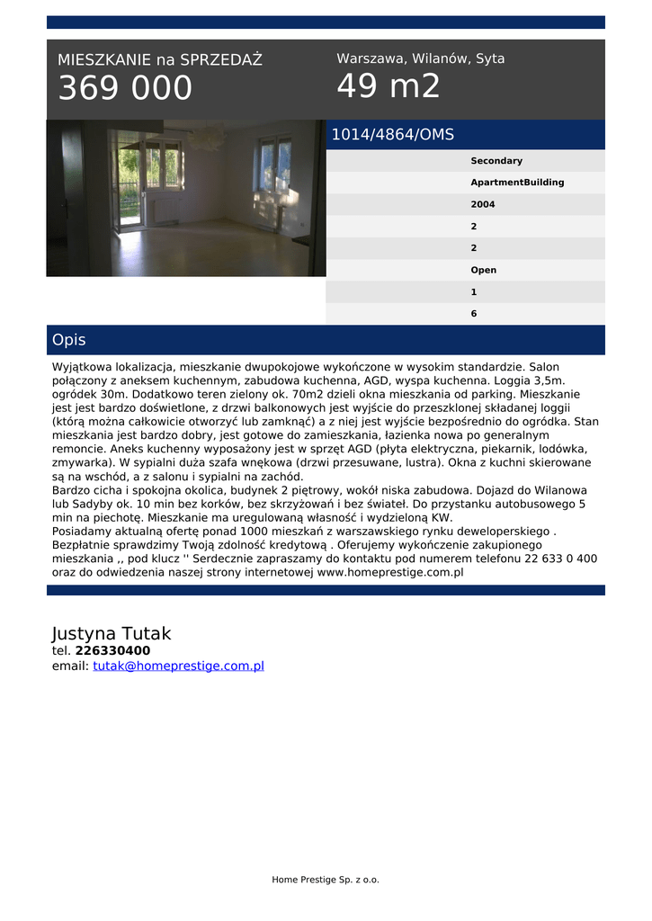 MIESZKANIE na SPRZEDAŻ 369 000 Warszawa, Wilanów, Syta 49 m2 1014/4864/OMS Secondary ApartmentBuilding 2004 2 2 Open 1 6 Opis Wyjątkowa lokalizacja, mieszkanie dwupokojowe wykończone w wysokim standardzie. Salon połączony z aneksem kuchennym, zabudowa kuchenna, AGD, wyspa kuchenna. Loggia 3,5m. ogródek 30m. Dodatkowo teren zielony ok. 70m2 dzieli okna mieszkania od parking. Mieszkanie jest jest bardzo doświetlone, z drzwi balkonowych jest wyjście do przeszklonej składanej loggii (którą można całkowicie otworzyć lub zamknąć) a z niej jest wyjście bezpośrednio do ogródka. Stan mieszkania jest bardzo dobry, jest gotowe do zamieszkania, łazienka nowa po generalnym remoncie. Aneks kuchenny wyposażony jest w sprzęt AGD (płyta elektryczna, piekarnik, lodówka, zmywarka). W sypialni duża szafa wnękowa (drzwi przesuwane, lustra). Okna z kuchni skierowane są na wschód, a z salonu i sypialni na zachód. Bardzo cicha i spokojna okolica, budynek 2 piętrowy, wokół niska zabudowa. Dojazd do Wilanowa lub Sadyby ok. 10 min bez korków, bez skrzyżowań i bez świateł. Do przystanku autobusowego 5 min na piechotę. Mieszkanie ma uregulowaną własność i wydzieloną KW. Posiadamy aktualną ofertę ponad 1000 mieszkań z warszawskiego rynku deweloperskiego . Bezpłatnie sprawdzimy Twoją zdolność kredytową . Oferujemy wykończenie zakupionego mieszkania ,, pod klucz '' Serdecznie zapraszamy do kontaktu pod numerem telefonu 22 633 0 400 oraz do odwiedzenia naszej strony internetowej www.homeprestige.com.pl Justyna Tutak tel. 226330400 email: [email protected] Home Prestige Sp. z o.o. Powered by TCPDF (www.tcpdf.org)