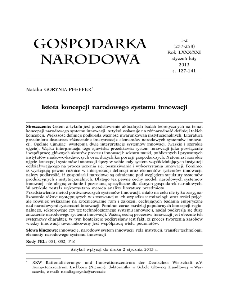 GOSPODARKA NARODOWA 1-2 (257-258) Rok LXXX/XXI styczeń-luty 2013 s. 127-141 Natalia GORYNIA-PFEFFER* Istota koncepcji narodowego systemu innowacji Streszczenie: Celem artykułu jest przedstawienie aktualnych badań teoretycznych na temat koncepcji narodowego systemu innowacji. Artykuł wskazuje na różnorodność definicji takich koncepcji. Większość definicji podkreśla ważność uwarunkowań instytucjonalnych. Literatura przedmiotu dostarcza różnorodne interpretacje elementów narodowych systemów innowacji. Ogólnie ujmując, występują dwie interpretacje systemów innowacji (wąskie i szerokie ujęcie). Wąska interpretacja tego zjawiska przedstawia system innowacji jako powiązanie i współpracę głównych aktorów procesu innowacji: sektora nauki, publicznych i prywatnych instytutów naukowo-badawczych oraz dużych korporacji gospodarczych. Natomiast szerokie ujęcie koncepcji systemów innowacji łączy w sobie cały system współdziałających instytucji oddziaływającego na proces uczenia się, poszukiwania i wykorzystania innowacji. Pomimo, iż występują pewne różnice w interpretacji definicji oraz elementów systemów innowacji, należy podkreślić, iż gospodarki narodowe są odmienne pod względem struktury systemów produkcyjnych i instytucjonalnych. Dlatego też pewne cechy modeli narodowych systemów innowacji nie ulegną zmianie i pozostaną specyficzne dla danych gospodarek narodowych. W artykule została wykorzystana metoda analizy literatury przedmiotu. Przedstawienie metod porównawczych systemów innowacji, miało na celu nie tylko zasygnalizowanie różnic występujących w stosowanej w ich wypadku terminologii oraz treści pojęć, ale również wskazanie na zróżnicowanie ram i założeń, cechujących badania empiryczne nad narodowymi systemami innowacji. Pomimo coraz bardziej popularnych koncepcji regionalnego, sektorowego czy też technologicznego systemu innowacji, nadal podkreśla się duże znaczenie narodowego systemu innowacji. Ważną cechą procesów innowacji jest obecnie ich systemowy charakter. W tym kontekście podkreślany jest fakt, iż proces tworzenia zasobów wiedzy innowacji uwarunkowany jest współpracą wielu podmiotów. Słowa kluczowe: innowacje, narodowy system innowacji, rola instytucji, transfer technologii, elementy narodowego systemu innowacji Kody JEL: 031, 032, P16 Artykuł wpłynął do druku 2 stycznia 2013 r. * RKW Rationalisierungs- und Innovationszentrum der Deutschen Wirtschaft e.V. Kompetenzzentrum Eschborn (Niemcy); doktorantka w Szkole Głównej Handlowej w Warszawie, e-mail: [email protected] 128 GOSPODARKA NARODOWA Nr 1-2/2013 Wprowadzenie Pod koniec XX wieku wzrosło znaczenie innowacji oraz technologii w procesach trwałego wzrostu i rozwoju gospodarczego. Niewątpliwy stał się fakt, iż zdolność do tworzenia i wykorzystywania innowacji w danym kraju determinują nie tylko czynniki wewnętrzne, wynikające z posiadanych zasobów i zdolności do ich uruchomienia takie jak np. kapitał przeznaczony na tworzenie wiedzy czy też zasoby ludzkie, ale również czynniki zewnętrzne, związane z intensywnością i kierunkami powiązań gospodarczych z zagranicą. Całokształt powiaząnych ze sobą czynników instytucjonalnych i strukturalnych mających wpływ na rozwój, selekcjonowanie i wchłanianie innowacji, tworzących jednocześnie otoczenie, w ramach którego rząd formułuje i realizuje politykę innowacyjną określany jest pojęciem narodowych systemów innowacji (NSI) [Edquist, 1997, s. 14]. Analiza tego pojęcia pozwala na poznanie znaczenia uwarunkowań, regulacji prawnych i pozostałych elementów polityki państwa, w szerokim konteście funkcjonowania rynku, konkurencyjności przedsiębiorstw i gospodarki narodowej. Dotychczasowe doświadczenia wskazują, iż trudno jest określić idealny, uniwersalny NSI odpowiadający wszystkim krajom. Każdy kraj charakteryzuje się specyficznymi uwarunkowaniami o charakterze historycznym, geograficznym, kulturowym, odpowiednim ustrojem społecznym i politycznym, a także możliwościami gospodarczymi i demograficznymi. Ponadto systemy innowacji podlegają ciągłym zmianom i ewolucjom i dlatego też nowoczesne ujęcie procesu innowacyjnego określane jest dynamicznym interakcyjnym modelem innowacji. Współczesne podejście polityki innowacyjnej odchodzi od „modelu liniowego”, w którym największą rolę odgrywały badania i rozwój na rzecz modelu rozproszonego (systemowego), polegającego na współdziałaniu i powiązaniach między najważniejszymi podmiotami należącymi do modelu NSI (np. firmy krajowe oraz międzynarodowe, instytucje naukowe, jednostki rządowe, państwo itd.). Model systemowy podkreśla, iż innowacja stanowi efekt interakcji między ludźmi, organizacjami, a ich otoczeniem. Fakt ten podkreśla Weresa „współdziałanie i powiązania między firmami to istotny element NSI, a rosnące współzależności między poszczególnymi podmiotami gospodarki światowej decydują o tym, iż systemy narodowe są elastyczne, otwarte i stają się coraz bardziej transnarodowe” [Weresa, 2006, s. 67]. W związku z tym polityka innowacyjna powinna rozszerzyć swoje działania nie skupiając się tylko i wyłącznie na działalności B+R. Celem tego artykułu jest przedstawienie koncepcji narodowego systemu innowacji, z wyróżnieniem najważniejszych definicji, elementów, a także rodzajów badań empirycznych związanych z narodowymi systemami innowacyjnymi. Definicje koncepcji narodowego systemu innowacji Pionierem koncepcji narodowego systemu innowacji był Freeman, który po raz pierwszy użył terminu narodowego systemu innowacji w swoich pracach Natalia Gorynia-Pfeffer, Istota koncepcji narodowego systemu innowacji 129 na temat wzrostu gospodarczego i innowacyjności w Japonii [Freeman, 1987, s. 4]. Według Freemana narodowy system innowacyjny obejmuje zbiór powiązanych ze sobą czynników instytucjonalnych i strukturalnych m
