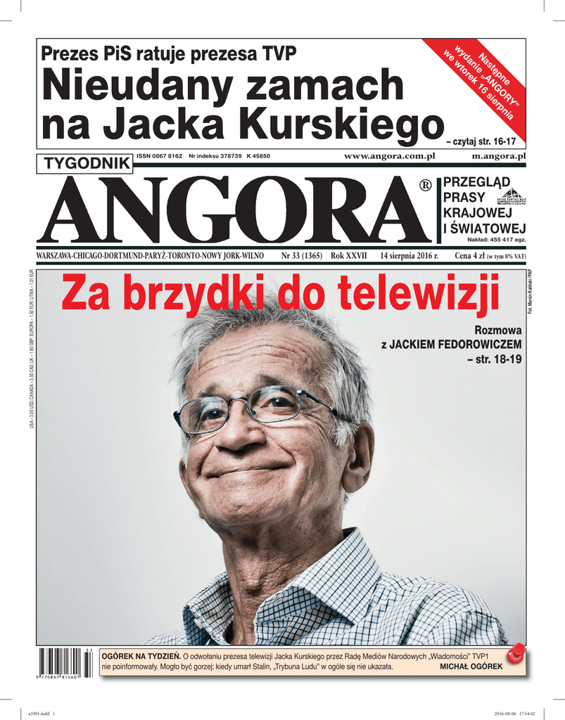 ” e RY nia pn O rp tę NG ie as A s N ie „ 16 an rek yd to w w e w Prezes PiS ratuje prezesa TVP Nieudany zamach na Jacka Kurskiego ISSN 0867 8162 Nr indeksu 378739 K 45850 www.angora.com.pl – czytaj str. 16-17 m.angora.pl PRZEGLĄD PRASY KRAJOWEJ I ŚWIATOWEJ Nakład: 455 417 egz. Nr 33 (1365) Rok XXVII 14 sierpnia 2016 r. Cena 4 zł (w tym 8% VAT) Za brzydki do telewizji Fot. Marcin Kaliński /PAP USA – 3.00 USD; CANADA – 3.50 CAD; UK – 1.80 GBP; EUROPA – 1.50 EUR; LITWA – 1,01 EUR WARSZAWA-CHICAGO-DORTMUND-PARYŻ-TORONTO-NOWY JORK-WILNO Rozmowa z JACKIEM FEDOROWICZEM – str. 18-19 OGÓREK NA TYDZIEŃ. O odwołaniu prezesa telewizji Jacka Kurskiego przez Radę Mediów Narodowych „Wiadomości” TVP1 nie poinformowały. Mogło być gorzej: kiedy umarł Stalin, „Trybuna Ludu” w ogóle się nie ukazała. MICHAŁ OGÓREK a3301.indd 1 2016-08-06 17:54:42 ANGORA nr 33 (14 VIII 2016) 3 KTO CZYTA, NIE BŁĄDZI Na dobry początek 36 Grafika Muncha W tym tygodniu imieniny obchodzą: Zagadka kryminalna Wojciecha Chądzyńskiego. Poniedziałek 8.08. Cyprian, Emilian Wtorek 9.08. Roman, Roland, Romuald Środa 10.08. Dzień Przewodników i Ratowników Górskich ANGORKA 39 – 46 Tygodnik nie tylko dla dzieci Wawrzyniec, Borys Czwartek 11.08. Włodzimierz, Zuzanna, Ligia KULTURA Fot. Piotr Kamionka; Oprac. Piotr Rajczyk 48 Być jak Kaczyński (Angora) Piątek 12.08. Międzynarodowy Dzień Młodzieży, Dzień Pracoholika Klara, Lech „Angora” na salonach warszawki. Sobota 13.08. Dzień Leworęcznych 50 Nazywano ją sługą czarownic (Dziennik Polski) Diana, Hipolit, Helena Symbol trupiej czaszki nie zjednał jej przyjaciół. Niedziela 14.08. Dzień Energetyka Maksymilian, Alfred, Euzebiusz 52 Obrazy jak sztabki złota (Parkiet) Poniedziałek 15.08. Wniebowzięcie NMP, Święto Wojska Polskiego Sztuka w służbowym gabinecie ułatwia prowadzenie interesów. Maria, Napoleon 53 Obraziłem się na muzykę (Angora) Jacek Łągwa z zespołu Ich Troje imał się różnych zajęć... 54 Trzymam rękę na pulsie (Angora) Salonowe burze Bohdana Gadomskiego. 62 O sztuce gotowania piszą Marek Brzeziński i Mirosław Kaliciński. ZDROWIE 64 Stadion dla każdego (Angora) Rozmowa z Pawłem Januszewskim, prezesem Fundacji Wychowania przez Sport. AKTUALNOŚCI 10 Ogórek przeczyta wszystko Jak połączyć ogień z wodą święconą. 11 „Biedaczyna” z Krakowa (Rzeczpospolita) 65 Problemy ze skórą zaczynają się często... w naszej głowie (Angora) Rozmowa z prof. dr hab. n. med. Anną Zalewską-Janowską. Wspomnienie o zmarłym kardynale Franciszku Macharskim. 16 Burza na prawicy po próbie odwołania Jacka Kurskiego Na prawicy zderzyły się dwie frakcje. 18 Musimy zdążyć przed zielonymi ludzikami (Angora) Rozmowa z Jackiem Fedorowiczem, satyrykiem, aktorem i rysownikiem. 20 Wojna z układem ((Angora) Fragment książki Roberta Krasowskiego „Czas Kaczyńskiego”. 22 Rosyjski samolot zmuszony do lądowania w Radomiu (Angora) Nasz ekspert Michał Fiszer komentuje. 25 Bogactwo nie na pokaz (Przegląd) W Szwajcarii, kraju o najwyższym standardzie życia w Europie, nie ma mowy o epatowaniu zamożnością. 27 Rząd każe ci wybrać: emerytura albo praca! (Fakt) Wiek emerytalny zostanie obniżony, ale nie ma nic za darmo. 28 Życie mlekiem płynące (Angora) 34 Tragiczny finał toksycznego związku (Angora) Najpierw groził żonie bronią, potem nacisnął spust. W poniedziałek rano do drzwi naszej kamienicy zapukał nieznajomy mężczyzna ostrzyżony na jeża. W dwurzędowym garniturze i drucianych okularach wyglądał jak sprzedawca polis albo świadek Jehowy, więc Maciaszek chciał go natychmiast pogonić, ale przybysz machnął mu przed nosem jakąś legitymacją i wpakował się do środka. – Jestem kapitan Ryś – oznajmił. – Będę zabezpieczał ten dom. – Przed czym? – zdziwił się dozorca. – Przed terrorystami – odparł kapitan. – Proszę zwołać zebranie lokatorów, chcę z nimi zamienić kilka słów! Po chwili wszyscy zgromadziliśmy się w pralni. Atmosfera była tak gęsta, że można by ją ciąć nożem, nie wiadomo, czy z powodu panującego strachu, czy też dlatego, że szambo właśnie zaczęło wybijać. Kapitan Ryś zlustrował nas świdrującym wzrokiem. – Czy któreś z was miało jakieś związki z islamistami? Tylko szczerze, MY to i tak a3303 spis.indd 3 Amerykanie wysłali do Teheranu 400 milionów dolarów gotówką, by wykupić swoich obywateli. 72 Nowa bomba termojądrowa 73 Bokser w operze 74 Flash mob wywołał panikę 75 Księżniczka się rozwodzi Małżeństwo norweskiej księżniczki Marthy Louise i pisarza Ari Behna niebawem się rozpadnie. 76 Epidemia zombie na Syberii 76 Ile i za co wziął pan doktor? W Niemczech 71 tysięcy lekarzy i aptekarzy przyjęło od branży farmaceutycznej ponad pół miliarda euro. 77 Król jest tylko jeden POZA PRAWEM Kapitan Ryś 72 Waszyngton zapłacił okup? Na jednej z rzymskich ulic wolontariusze czytają poezję naszej noblistki. Czy władzy i bankom zależy na szybkim rozwiązaniu problemu kredytów we frankach? Humoreska Pawła Wakuły Dr Kira Radinsky z Izraela potrafi przewidzieć wydarzenia dzięki systemom matematycznym. 74 Szymborska dla uchodźców 23 Sądeccy milionerzy (Forbes) 24 Ryzyk-fizyk (Bankier.pl) Fajbusiewicz na tropie. 69 „Igrzyska uważam za otwarte” 70 Prorokini Kampania Donalda Trumpa. SPOŁECZEŃSTWO 35 Strzały o zmroku (Angora) PERYSKOP W mistrzostwach świata jachtów klasycznych wystartuje 79-letni król Norwegii Harald V. 80 Proszę wstać! Nauka idzie! 82 Muzyczna arka Noego Paryski nie-co-dziennik Leszka Turkiewicza. wiemy, ale przyznanie się do błędu zostanie uznane za okoliczność łagodzącą. Spojrzeliśmy po sobie nieufnie, a Maciaszek, który lojalnie współpracował z każdą władzą, poczynając od PRL, a kończąc na IV RP, od razu wyrwał się z donosem: – Turkuć spod szóstki prowadził kiedyś budę z kebabem, Waciakowa z parteru była