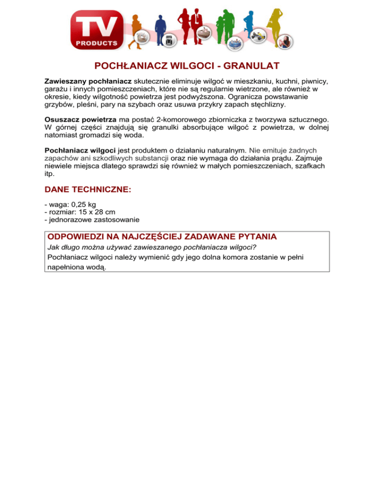 POCHŁANIACZ WILGOCI - GRANULAT Zawieszany pochłaniacz skutecznie eliminuje wilgoć w mieszkaniu, kuchni, piwnicy, garażu i innych pomieszczeniach, które nie są regularnie wietrzone, ale również w okresie, kiedy wilgotność powietrza jest podwyższona. Ogranicza powstawanie grzybów, pleśni, pary na szybach oraz usuwa przykry zapach stęchlizny. Osuszacz powietrza ma postać 2-komorowego zbiorniczka z tworzywa sztucznego. W górnej części znajdują się granulki absorbujące wilgoć z powietrza, w dolnej natomiast gromadzi się woda. Pochłaniacz wilgoci jest produktem o działaniu naturalnym. Nie emituje żadnych zapachów ani szkodliwych substancji oraz nie wymaga do działania prądu. Zajmuje niewiele miejsca dlatego sprawdzi się również w małych pomieszczeniach, szafkach itp. DANE TECHNICZNE: - waga: 0,25 kg - rozmiar: 15 x 28 cm - jednorazowe zastosowanie ODPOWIEDZI NA NAJCZĘŚCIEJ ZADAWANE PYTANIA Jak długo można używać zawieszanego pochłaniacza wilgoci? Pochłaniacz wilgoci należy wymienić gdy jego dolna komora zostanie w pełni napełniona wodą.