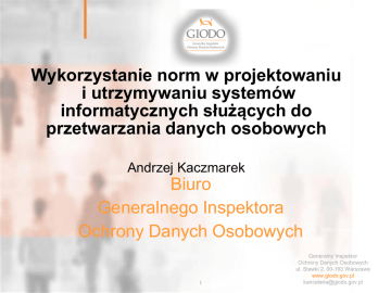 Wykorzystanie norm w projektowaniu i utrzymywaniu systemów informatycznych służących do przetwarzania danych osobowych Andrzej Kaczmarek Biuro Generalnego Inspektora Ochrony Danych Osobowych 11. 05. 2009 r. Warszawa 1 Generalny Inspektor Ochrony Danych Osobowych ul. Stawki 2, 00-193 Warszawa www.giodo.gov.pl [email protected] PLAN Główne elementy ochrony danych osobowych Ustawy i rozporządzenia jako główne źródło przepisów prawa Bezpieczeństwo informacji, ochrona danych – jako zagadnienia ogólne i specjalistyczne. Co dają standardy i jak można je wykorzystać. Standardy jako uzupełnienie przepisów prawa www.giodo.gov.pl I Specjalistyczna Konferencja Bezpieczeństwo informacji w szkole i placówce oświatowej 30.10.2014 A. Kaczmarek S. 2 GŁÓWNE OBSZARY REGULACJI W ZAKRESI OCHRONY DANYCH OSOBOWYCH Ustawa o informatyzacji Ustawa o.o.d.o. Ustawa KPA. Przetwarzanie danych osobowych NORMY Rozporządzenie z 29 kwietnia 2004 do u.o.d.o PN-ISO/IEC 2000-1 PN-ISO/IEC 2000-2 PN-ISO/IEC 27001 PN-ISO/IEC 1799 PN-ISO/IEC 27005 PN-ISO/IEC 24762 WCAG 2.0 I Specjalistyczna Konferencja Bezpieczeństwo informacji w szkole i placówce oświatowej 30.10.2014 Rozporządzenie z 14 wrz. 2011 Rozporządzenie z 12 kwietnia 2012 do ustawy o i. www.giodo.gov.pl A. Kaczmarek S. 3 OCHRONA DANYCH OSOBOWYCH - DEFINICJE (1) Definicje: Dane osobowe 1. Dane osobowe - wszelkie informacje dotyczące zidentyfikowanej lub możliwej do zidentyfikowania osoby fizycznej. 2. Osobą możliwą do zidentyfikowania jest osoba, której tożsamość można określić bezpośrednio lub pośrednio, w szczególności przez powołanie się na numer identyfikacyjny albo jeden lub kilka specyficznych czynników określających jej cechy fizyczne, fizjologiczne, umysłowe, ekonomiczne, kulturowe lub społeczne. 3. Informacji nie uważa się za umożliwiającą określenie tożsamości osoby, jeżeli wymagałoby to nadmiernych kosztów, czasu lub działań. www.giodo.gov.pl I Specjalistyczna Konferencja Bezpieczeństwo informacji w szkole i placówce oświatowej 30.10.2014 A. Kaczmarek S. 4 OCHRONA DANYCH OSOBOWYCH - DEFINICJE (2) Definicje: zbiór danych, przetwarzanie 1. Zbiór danych - każdy posiadający strukturę zestaw danych o charakterze osobowym, dostępnych według określonych kryteriów, niezależnie od tego, czy zestaw ten jest rozproszony lub podzielony funkcjonalnie, 2. Przetwarzaniu danych - rozumie się przez to jakiekolwiek operacje wykonywane na danych osobowych, takie jak zbieranie, utrwalanie, przechowywanie, opracowywanie, zmienianie, udostępnianie i usuwanie, a zwłaszcza te, które wykonuje się w systemach informatycznych. www.giodo.gov.pl I Specjalistyczna Konferencja Bezpieczeństwo informacji w szkole i placówce oświatowej 30.10.2014 A. Kaczmarek S. 5 ZASADY PRZETWARZANIA DANYCH - PRZEPISY PRAWA (1) Zasady przetwarzania – Przetwarzanie danych jest dopuszczalne tylko wtedy gdy: 1. Osoba, której dane dotyczą, wyrazi na to zgodę, chyba że chodzi o usunięcie dotyczących jej danych, 2. Jest to niezbędne dla zrealizowania uprawnienia lub spełnienia obowiązku wynikającego z przepisu prawa, 3. Jest to konieczne do realizacji umowy, gdy osoba, której dane dotyczą, jest jej stroną lub gdy jest to niezbędne do podjęcia działań przed zawarciem umowy na żądanie tej osoby, 4. Jest niezbędne do wykonania określonych prawem zadań realizowanych dla dobra publicznego, 5. jest to niezbędne dla wypełnienia prawnie usprawiedliwionych celów realizowanych przez administratorów danych albo odbiorców danych, a przetwarzanie nie narusza praw i wolności osoby, której dane dotyczą. www.giodo.gov.pl I Specjalistyczna Konferencja Bezpieczeństwo informacji w szkole i placówce oświatowej 30.10.2014 A. Kaczmarek S. 6 ZASADY PRZETWARZANIA DANYCH - PRZEPISY PRAWA (2) Obowiązki ADO – obowiązek informacyjny W przypadku zbierania danych osobowych od osoby, której one dotyczą, administrator danych jest obowiązany poinformować tę osobę o: 1. Adresie swojej siedziby i pełnej nazwie, a w przypadku gdy administratorem danych jest osoba fizyczna - o miejscu swojego zamieszkania oraz imieniu i nazwisku, 2. Celu zbierania danych, a w szczególności o znanych mu w czasie udzielania informacji lub przewidywanych odbiorcach lub kategoriach odbiorców danych, 3. Prawie dostępu do treści swoich danych oraz ich poprawiania, 4. Dobrowolności albo obowiązku podania danych, a jeżeli taki obowiązek istnieje, o jego podstawie prawnej. www.giodo.gov.pl I Specjalistyczna Konferencja Bezpieczeństwo informacji w szkole i placówce oświatowej 30.10.2014 A. Kaczmarek S. 7 ZASADY PRZETWARZANIA DANYCH - PRZEPISY PRAWA (3) Obowiązki ADO – zapewnienie ochrony interesów osób, których dane dotyczą poprzez zapewnie nie, aby dane były: 1. Przetwarzane zgodnie z prawem; 2. Zbierane dla oznaczonych, zgodnych z prawem celów i nie poddawane dalszemu przetwarzaniu niezgodnemu z tymi; 3. Merytorycznie poprawne i adekwatne w stosunku do celów, w jakich są przetwarzane; 4. Przechowywane w postaci umożliwiającej identyfikację osób, których dotyczą, nie dłużej niż jest to niezbędne do osiągnięcia celu przetwarzania. www.giodo.gov.pl I Specjalistyczna Konferencja Bezpieczeństwo informacji w szkole i placówce oświatowej 30.10.2014 A. Kaczmarek S. 8 ZASADY PRZETWARZANIA DANYCH - PRZEPISY PRAWA (3) Obowiązki ADO – obowiązek zgłoszenia zbioru do rejestracji. 1. Administrator danych jest obowiązany zgłosić zbiór danych do rejestracji Generalnemu Inspektorowi, z wyjątkiem przypadków, o których mowa w art. 43 ust. 1. u.o.d.o (art. 40) 2. Z obowiązku rejestracji zbioru danych zwolnieni są administratorzy danych: (art. 43 ust. 1 u.o.d.o) − zawierających informacje niejawne; − …………………. − przetwarzanych w związku z zatrudnieniem u nich, świadczeniem im usług na podstawie umów cywilnoprawnych, a także dotyczących osób u nich zrzeszonych lub uczących się; − 