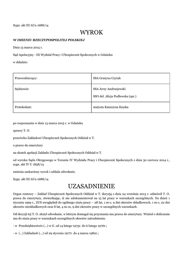 Sygn. akt III AUa 1688/14 WYROK W IMIENIU RZECZYPOSPOLITEJ POLSKIEJ Dnia 13 marca 2015 r. Sąd Apelacyjny - III Wydział Pracy i Ubezpieczeń Społecznych w Gdańsku w składzie: Przewodniczący: SSA Grażyna Czyżak Sędziowie: SSA Jerzy Andrzejewski SSO del. Alicja Podlewska (spr.) Protokolant: stażysta Katarzyna Kręska po rozpoznaniu w dniu 13 marca 2015 r. w Gdańsku sprawy T. O. przeciwko Zakładowi Ubezpieczeń Społecznych Oddział w T. o prawo do emerytury na skutek apelacji Zakładu Ubezpieczeń Społecznych Oddział w T. od wyroku Sądu Okręgowego w Toruniu IV Wydziału Pracy i Ubezpieczeń Społecznych z dnia 30 czerwca 2014 r., sygn. akt IV U 1858/13 zmienia zaskarżony wyrok i oddala odwołanie. Sygn. akt III AUa 1688/14 UZASADNIENIE Organ rentowy – Zakład Ubezpieczeń Społecznych Oddział w T. decyzją z dnia 24 września 2013 r. odmówił T. O. prawa do emerytury, stwierdzając, iż nie udokumentował on 15 lat pracy w warunkach szczególnych. Na dzień 1 stycznia 1999 r., ZUS uwzględnił do ogólnego stażu pracy – 28 lat, 1 m-c, 9 dni okresów składkowych, 1 m-c, 22 dni okresów nieskładkowych oraz 8 lat, 4 m-ce, 9 dni okresów pracy w szczególnych warunkach. Od decyzji tej T. O. złożył odwołanie, w którym domagał się przyznania mu prawa do emerytury. Wniósł o doliczenie mu do stażu pracy w warunkach szczególnych okresów zatrudnienia: - w Przedsiębiorstwie (...) w G. od 14 lutego 1975r. do 6 lutego 1976r.; - w (...) Zakładach (...) od 29 stycznia 1977r. do 4 marca 1982r.; - w Domu Pomocy Społecznej w G. od 15 kwietnia 1989r. do 25 czerwca 1990r. Organ rentowy w odpowiedzi na odwołanie wniósł o jego oddalenie, podtrzymując stanowisko wyrażone w decyzji. W toku procesu pozwany doliczył ubezpieczonemu do stażu pracy w warunkach szczególnych okresy zatrudnienia w (...) Zakładzie Budowlanym od 23 lutego 1987r. do 14 kwietnia 1989r. oraz w (...) od 6 listopada 1974r. do 31 stycznia 1975r., tym samym ustalając ten staż na 10 lat, 8 m-cy, 24 dni. Wyrokiem z dnia 30 czerwca 2014r., sygn.. IV U 1858/13, Sąd Okręgowy w Toruniu zmienił zaskarżoną decyzję i przyznał ubezpieczonemu prawo do emerytury od dnia 19 sierpnia 2013r. (pkt I), nie stwierdził odpowiedzialności ZUS za nieustalenie ostatniej okoliczności niezbędnej do wydania decyzji (pkt II). Swoje rozstrzygnięcie Sąd I instancji oparł na następujących ustaleniach i rozważaniach. T. O. urodził się (...) Na dzień 31 grudnia 1998 r. bezspornie udokumentował ogólny staż pracy w wymiarze 28 lat, 3 m-ce, 1 dzień, w tym staż pracy w warunkach szczególnych 10 lat, 8 m-cy, 24 dni. Poza sporem pozostaje również fakt, iż ubezpieczony nie przystąpił do OFE. Istotą sporu jest ustalenie czy T. O. posiada co najmniej 15-to letni okres pracy w warunkach szczególnych. Przedmiotem ustaleń była praca wnioskodawcy w Przedsiębiorstwie (...) w G., w (...) Zakładach (...) w G. i w DPS w G.. T. O. ukończył zasadniczą szkołę zawodową w zawodzie elektromonter. Po odbyciu zasadniczej służby wojskowej od 14 lutego 1975 r. zatrudniony został w Przedsiębiorstwie (...) w G. w charakterze montera elektryka. W zakładzie tym pracował w pełnym wymiarze czasu pracy i stale przy układaniu kabli niskiego napięcia w głębokich wykopach, podłączał kable do rozdzielni. Podłączał kable do hal produkcyjnych. Do kabli podłączał maszyny, wykonywał instalacje odgromowe. Od dnia 29 czerwca 1975 r. do 6 lutego 1976 r. K. O. przebywał na zwolnieniu lekarskim, przy czym od 3 lutego 1976 r. został aresztowany. Z dniem 7 lutego 1976 r. została z ubezpieczonym rozwiązana umowa o pracę bez wypowiedzenia. Od dnia 29 stycznia 1977 r. wnioskodawca zatrudniony został w (...) Zakładach (...) w G. na stanowisku montera urządzeń termotechnicznych. Praca jego polegała na podłączaniu kuchni sterowniczych, pieców elektrycznych, warników na potrzeby statków. Pracował przy napięciu 220 i 380 wolt. W tym charakterze pracował do 14 września 1978 r. Od 15 września 1978 r. został przeniesiony na Wydział W 124, gdzie wykonywał pracę ślusarza przy składaniu urządzeń – kontenerów do likwidacji ścieków na statkach. Urządzenia te wykonywane były z blach, które łączono przy pomocy spawania. Wnioskodawca nosił blachy, trzymał je w czasie, gdy poddawane były spawaniu. następnie czyścił je z opiłków i malował farbą epoksydową. Podczas malowania miał na twarzy maskę. Wszystkie czynności wykonywał na hali produkcyjnej. Pracował w brygadzie ślusarskiej. Na tej samej hali były stanowiska spawalnicze oddzielone ekranami z blachy. Spawacze prócz spawania kontenerów wykonywali inne prace spawalnicze. Wnioskodawca pracował w pyle w bezpośrednim sąsiedztwie stanowisk spawalniczych. W trakcie pracy otrzymywał posiłki regeneracyjne. Pracował w tym charakterze do 4 marca 1983 r. W Domu Pomocy Społecznej rozpoczął pracę dnia 15 kwietnia 1989 r. w charakterze palacza centralnego ogrzewania. Pracował na kotłach EC 4. Obsługiwał dwa kotły. Zimą palił w parowym i wodnym, latem tylko w parowym. Kotły składały się z paleniska i rusztu stałego Ubezpieczony wykonywał takie prace jak : rozpalanie paleniska, utrzymywanie ognia, utrzymywanie w kotle właściwego ciśnienia, przekazywanie pary na obiekt. Kocioł parowy odprowadzał parę do kuchni na kotły warzelne i ciepłą wodę. Para przekazywana była również do pralni na prasowanie i gotowanie bielizny. Kocioł parowy działał bez przerwy niezależnie od pory roku. Kocioł wodny uruchamiany był zimą do ogrzewania pomieszczeń. Zatrudnionych było czterech palaczy. Do obowiązków palacza należało również czyszczenie kanałów dymnych. Zasyp odbywał się ręcznie. Ubezpieczony dysponował zaświadczeniem kwalifikacyjnym w zakresie eksploatacji urządzeń energetycznych uprawniających do obsługi kotłów Co wodnych do 100( o) C i parowych niskoprężnych. W DPS kotły wodne były do