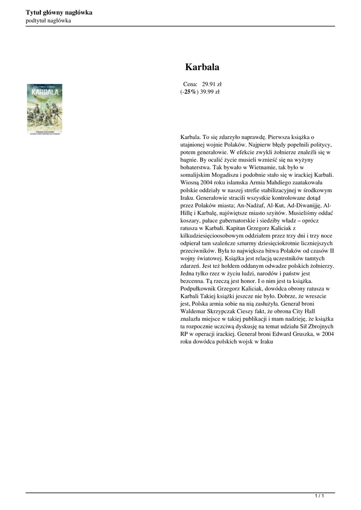 Tytuł główny nagłówka podtytuł nagłówka Karbala Cena: 29.91 zł (-25%) 39.99 zł Karbala. To się zdarzyło naprawdę. Pierwsza książka o utajnionej wojnie Polaków. Najpierw błędy popełnili politycy, potem generałowie. W efekcie zwykli żołnierze znaleźli się w bagnie. By ocalić życie musieli wznieść się na wyżyny bohaterstwa. Tak bywało w Wietnamie, tak było w somalijskim Mogadiszu i podobnie stało się w irackiej Karbali. Wiosną 2004 roku islamska Armia Mahdiego zaatakowała polskie oddziały w naszej strefie stabilizacyjnej w środkowym Iraku. Generałowie stracili wszystkie kontrolowane dotąd przez Polaków miasta; An-Nadżaf, Al-Kut, Ad-Diwanijję, AlHillę i Karbalę, najświętsze miasto szyitów. Musieliśmy oddać koszary, pałace gubernatorskie i siedziby władz – oprócz ratusza w Karbali. Kapitan Grzegorz Kaliciak z kilkudziesięcioosobowym oddziałem przez trzy dni i trzy noce odpierał tam szaleńcze szturmy dziesięciokrotnie liczniejszych przeciwników. Była to największa bitwa Polaków od czasów II wojny światowej. Książka jest relacją uczestników tamtych zdarzeń. Jest też hołdem oddanym odwadze polskich żołnierzy. Jedna tylko rzez w życiu ludzi, narodów i państw jest bezcenna. Tą rzeczą jest honor. I o nim jest ta książka. Podpułkownik Grzegorz Kaliciak, dowódca obrony ratusza w Karbali Takiej książki jeszcze nie było. Dobrze, że wreszcie jest, Polska armia sobie na nią zasłużyła. Generał broni Waldemar Skrzypczak Cieszy fakt, że obrona City Hall znalazła miejsce w takiej publikacji i mam nadzieję, że książka ta rozpocznie uczciwą dyskusję na temat udziału Sił Zbrojnych RP w operacji irackiej. Generał broni Edward Gruszka, w 2004 roku dowódca polskich wojsk w Iraku 1/1 Powered by TCPDF (www.tcpdf.org)