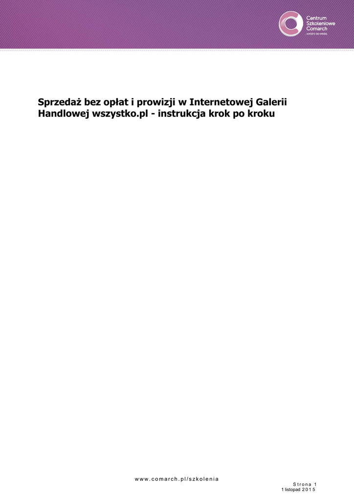 Sprzedaż bez opłat i prowizji w Internetowej Galerii Handlowej wszystko.pl - instrukcja krok po kroku www.comarch.pl/szkolenia S trona 1 1 listopad 2 0 1 5 Tytuł szkolenia: Sprzedaż bez opłat i prowizji w Internetowej Galerii Handlowej wszystko.pl - instrukcja krok po kroku Opis i cel szkolenia: Celem szkolenia jest zapoznanie uczestników z funkcjonowaniem i obsługą sprzedaży w internetowej galerii handlowej wszystko.pl. W szkoleniu zaprezentowano przede wszystkim przygotowanie systemu Comarch ERP Optima oraz Comarch ERP e-Sklep do współpracy z wszystko.pl. Uczestnicy będą mogli również poznać konfigurację Panelu sprzedawcy w wszystko.pl oraz sposób realizacji zamówień. Szkolenie przeznaczone jest dla początkujących Użytkowników wszystko.pl. Kategoria szkolenia i metoda nauczania: Niniejsze szkolenie wykorzystuje bogaty zestaw środków elektronicznego przekazu informacji, tj. nagrania video, zrzuty ekranu. Dzięki takiej formie Użytkownicy dostają możliwość zapoznania się z obsługą programu w dowolnym czasie, w swoim własnym tempie oraz bez ponoszenia dodatkowych kosztów związanych z przyjazdem i pobytem w miejscu szkolenia. Nowa forma szkolenia stwarza wszystkim możliwość bardziej wyrównanego dostępu do wysokiej jakości szkoleń. Zakres tematyczny: Konfiguracja Comarch ERP Optima do współpracy z wszystko.pl Przygotowanie oferty asortymentowej Towary wysyłane do wszystko.pl Kategorie wszystko.pl Atrybuty wszystko.pl Nazwa i opis towaru w wszystko.pl Prezentacja graficzna produktu Dostępność Dodatkowe informacje Jednostki dodatkowe Jednostki pomocnicze Synchronizacja Synchronizacja ręczna Synchronizacja automatyczna wszystko.pl - konfiguracja Logowanie i rejestracja Panel sprzedawcy Wizytówka sprzedawcy Adres wizytówki Informacje bieżące Moja sprzedaż Reklama we wszystko.pl Dla sprzedawców Oferty wszystko.pl Statystyki sprzedaży Konfiguracja sprzedawcy Konfiguracja konta Szczegóły produktu w wszystko.pl Realizacja zamówień z wszystko.pl Odbiór zamówień z wszystko.pl Potwierdzanie zamówienia Realizacja zamówienia Anulowanie zamówienia www.comarch.pl/szkolenia S trona 2 1 listopad 2 0 1 5