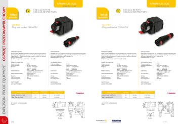STREFA 1,21; 2,22 ZONE 1,21; 2,22 ZONE 1,21; 2,22 II 2G Ex de IIC T5-T6 II 2D Ex tD A21 IP66 T 68°C II 2G Ex de IIC T5-T6 II 2D Ex tD A21 IP66 T 68°C Wtyk i gniazdo i gniazdo 16A/415V 32A/415V Plug and socket 16A/415V Plug and socket 32A/415V PRZEZNACZENIE APPLICATION PRZEZNACZENIE APPLICATION Wtyk i gniazdo 16A/415V do instalacji elektrycznej w pomieszczeniach przemysłowych zagrożonych wybuchem mieszanin: gazów, par oraz mgieł palnych z powietrzem a także mieszanin: pyłów lub włókien palnych z powietrzem. W strefach zagrożonych wybuchem: 1, 21; 2, 22. 16A/415V plug and socket for installation in industrial facilities with explosion hazard of gases, vapours and flammable fogs mixed with air and inflammable dust and fibers mixed with air. Hazardous zones: 1,21; 2,22. Wtyk i gniazdo 32A/415V do instalacji elektrycznej w pomieszczeniach przemysłowych zagrożonych wybuchem mieszanin: gazów, par oraz mgieł palnych z powietrzem a także mieszanin: pyłów lub włókien palnych z powietrzem. W strefach zagrożonych wybuchem: 1, 21; 2, 22. 32A/415V plug and socket for installation in industrial facilities with explosion hazard of gases, vapours and flammable fogs mixed with air and inflammable dust and fibers mixed with air. Hazardous zones: 1,21; 2,22. DANE TECHNICZNE TECHNICAL DATA DANE TECHNICZNE TECHNICAL DATA Stopień ochrony: Temp. otoczenia: Materiał: Wejścia kablowe: Zaciski przyłączeniowe: Napięcie: Prąd znamionowy: Ustawienie bolców: IP 66 od -40⁰C do +55⁰C gniazdo: poliwęglan pokrywa: poliamid wtyk: poliamid gniazdo 1xM20 /Ø 6,5-14,5 mm/ wtyk PG 16 /Ø 6,5-14,5 mm/ gniazdo 2x4 mm² wtyk 2,5mm² 380-415VAC 50/60 Hz 16A 3P+N+E Protection degree: Ambient temperature: IP 66 from -40⁰C to +55⁰C socket: polycarbonate cover: polyamide plug: polyamide socket 1xM20 /Ø 6,5-14,5 mm/ plug PG 16 /Ø 6,5-14,5 mm/ socket 2x4 mm² plug 2,5mm² 380-415VAC 50/60 Hz 16A 3P+N+E Cable entry: Terminal block: Voltage: Rated current: Pin configuration: Stopień ochrony: Temp. otoczenia: Materiał: Wejścia kablowe: Zaciski przyłączeniowe: Napięcie: Prąd znamionowy: Ustawienie bolców: IP 66 od -40⁰C do +55⁰C gniazdo: poliwęglan pokrywa: poliamid wtyk: poliamid gniazdo 1xM25 /Ø 8-18,5 mm/ wtyk PG 16 /Ø 8-18,5 mm/ gniazdo 2x6 mm² wtyk 6 mm² 380-415VAC 50/60Hz 32A 3P+N+E Protection degree: Ambient temperature: Material: Terminal block: Voltage: Rated current: Pin configuration: APPROVALS CERTYFIKAT APPROVALS LCIE 02 ATEX 6068 LCIE 02 ATEX 6068 LCIE 02 ATEX 6068 LCIE 02 ATEX 6068 Symbol zamówieniowy | Order index Gniazdo | Socket 380-415VAC PCX 1 szt./pcs 31-143-9220 Wtyk | Plug 380-415VAC PCX 1 szt./pcs 31-143-9221 166 Pakowanie | Packing Symbol zamówieniowy | Order index Gniazdo | Socket 380-415VAC PCX 1 szt./pcs 31-143-9225 Wtyk | Plug 380-415VAC PCX 1 szt./pcs 31-143-9226 WYMIARY | DIMENSIONS [ mm ] 195 165 140 275 62 WYMIARY | DIMENSIONS [ mm ] Typ | Type Opis | Description 74 Pakowanie | Packing 80 Typ | Type Opis | Description IP 66 from -40⁰C to +55⁰C socket: polycarbonate cover: polyamide plug: polyamide socket 1xM25 /Ø 8-18,5 mm/ plug PG 16 /Ø 8-18,5 mm/ socket 2x6 mm² plug 6 mm² 380-415VAC 50/60Hz 32A 3P+N+E Cable entry: CERTYFIKAT 73 Ustawienie bolców | Pin configuration Ustawienie bolców | Pin configuration L2 L1 6h N L3 3P+N+E 1.43 L2 L1 6h N 375 EXPLOSION PROOF EQUIPMENT OSPRZĘT PRZECIWWYBUCHOWY Wtyk STREFA 1,21; 2,22 L3 3P+N+E www.remontowa-rlt.pl, [email protected] 1.44