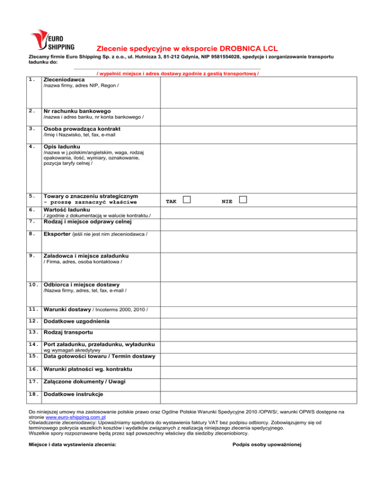 Zlecenie spedycyjne w eksporcie DROBNICA LCL Zlecamy firmie Euro Shipping Sp. z o.o., ul. Hutnicza 3, 81-212 Gdynia, NIP 9581554028, spedycje i zorganizowanie transportu ładunku do: ……………………………………………………………………………………………………………………………………………… / wypełnić miejsce i adres dostawy zgodnie z gestią transportową / 1. Zleceniodawca /nazwa firmy, adres NIP, Regon / 2. Nr rachunku bankowego /nazwa i adres banku, nr konta bankowego / 3. Osoba prowadząca kontrakt /Imię i Nazwisko, tel, fax, e-mail 4. Opis ładunku /nazwa w j.polskim/angielskim, waga, rodzaj opakowania, ilość, wymiary, oznakowanie, pozycja taryfy celnej / 5. Towary o znaczeniu strategicznym - proszę zaznaczyć właściwe 6. Wartość ładunku TAK □ NIE □ / zgodnie z dokumentacją w walucie kontraktu./ 7. Rodzaj i miejsce odprawy celnej 8. Eksporter /jeśli nie jest nim zleceniodawca / 9. Załadowca i miejsce załadunku / Firma, adres, osoba kontaktowa / 10. Odbiorca i miejsce dostawy /Nazwa firmy, adres, tel, fax, e-mail / 11. Warunki dostawy / Incoterms 2000, 2010 / 12. Dodatkowe uzgodnienia 13. Rodzaj transportu 14. Port załadunku, przeładunku, wyładunku wg wymagań akredytywy 15. Data gotowości towaru / Termin dostawy 16. Warunki płatności wg. kontraktu 17. Załączone dokumenty / Uwagi 18. Dodatkowe instrukcje Do niniejszej umowy ma zastosowanie polskie prawo oraz Ogólne Polskie Warunki Spedycyjne 2010 /OPWS/, warunki OPWS dostępne na stronie www.euro-shipping.com.pl Oświadczenie zleceniodawcy: Upoważniamy spedytora do wystawienia faktury VAT bez podpisu odbiorcy. Zobowiązujemy się od terminowego pokrycia wszelkich kosztów i wydatków związanych z realizacją niniejszego zlecenia spedycyjnego. Wszelkie spory rozpoznawane będą przez sąd powszechny właściwy dla siedziby zleceniobiorcy. Miejsce i data wystawienia zlecenia: Podpis osoby upoważnionej